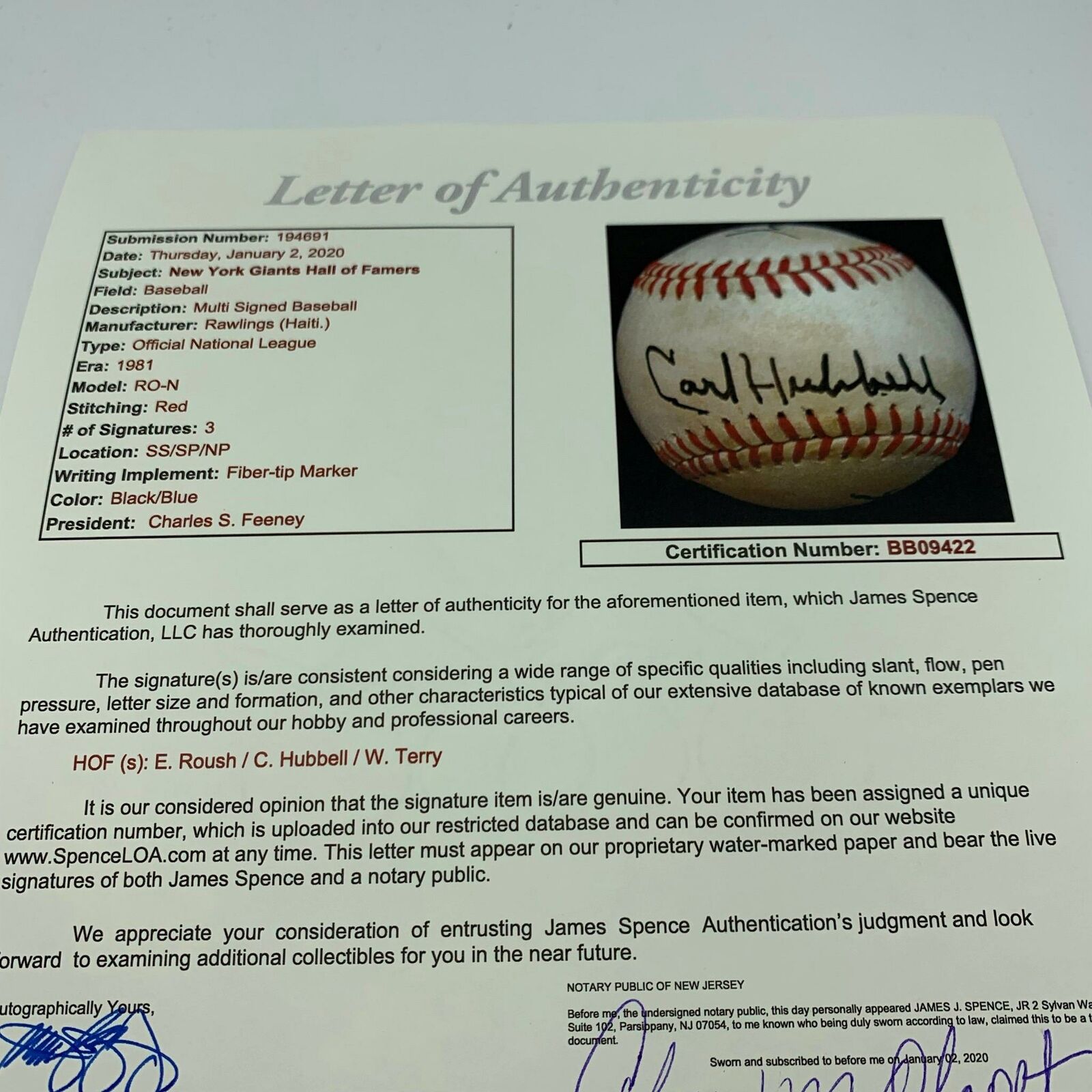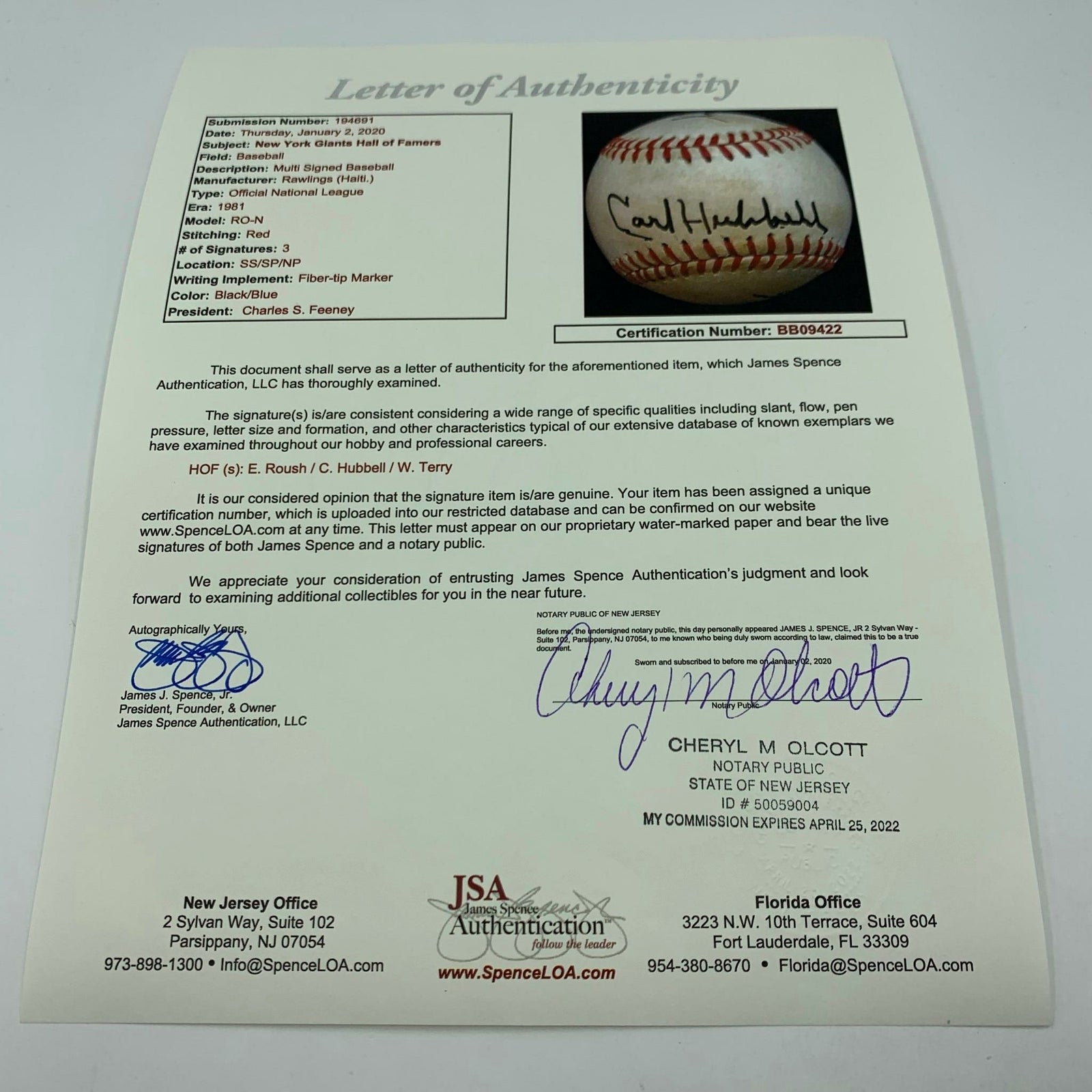 Carl Hubbell Bill Terry Edd Roush 1920's NY Giants Legends Signed NL Baseball JSA COA