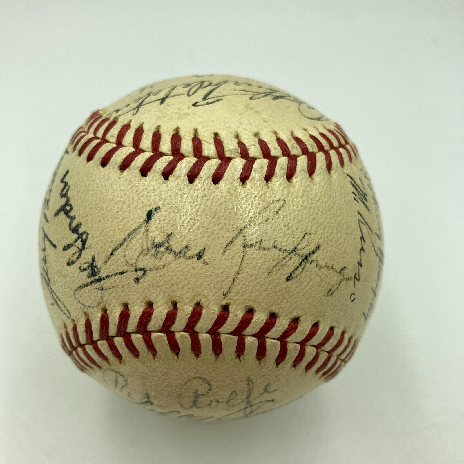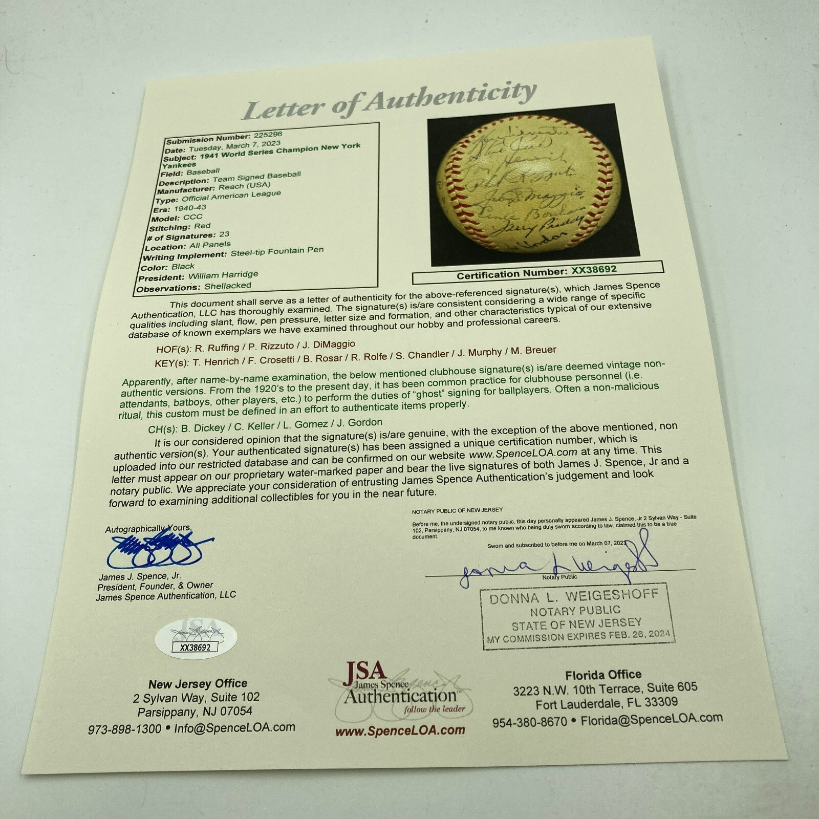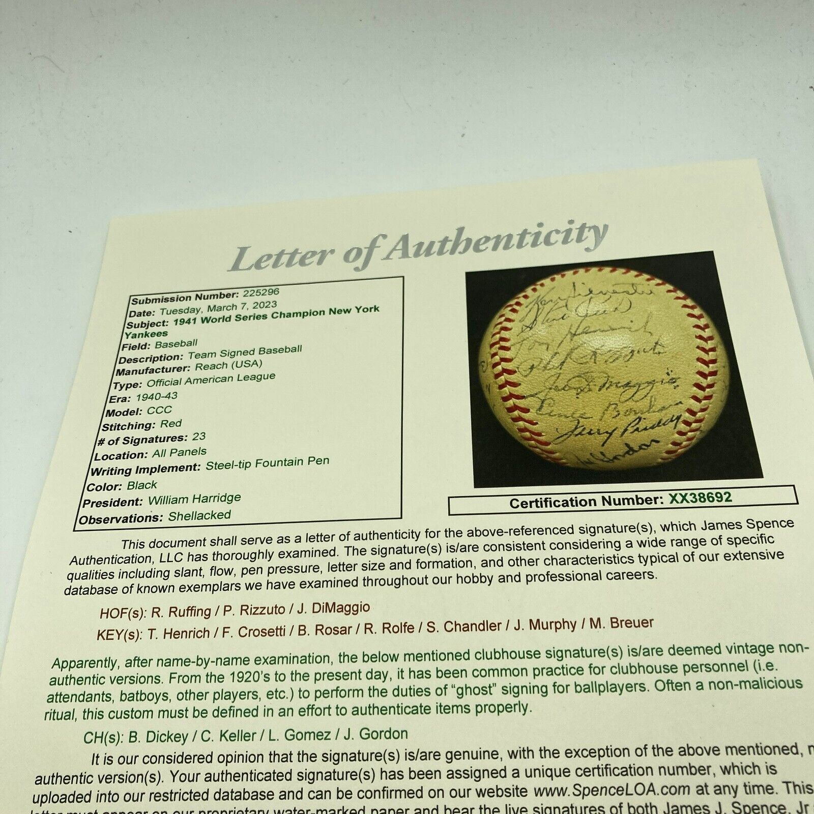 1941 New York Yankees team autographed baseball (World Champions). Light cream color Harridge AL ball with light clear coating having been signed by (23) members of the World Champion New York Yankees. Players include Joe DiMaggio, Rizzuto, Ruffing, Crosetti, Rolfe, and Henrich. Gomez, Dickey, Keller, and Gordon are clubhouse signed. Signatures present very nicely against the light cream ball surface
