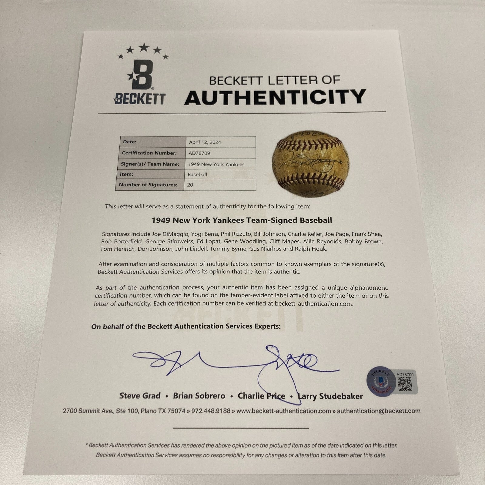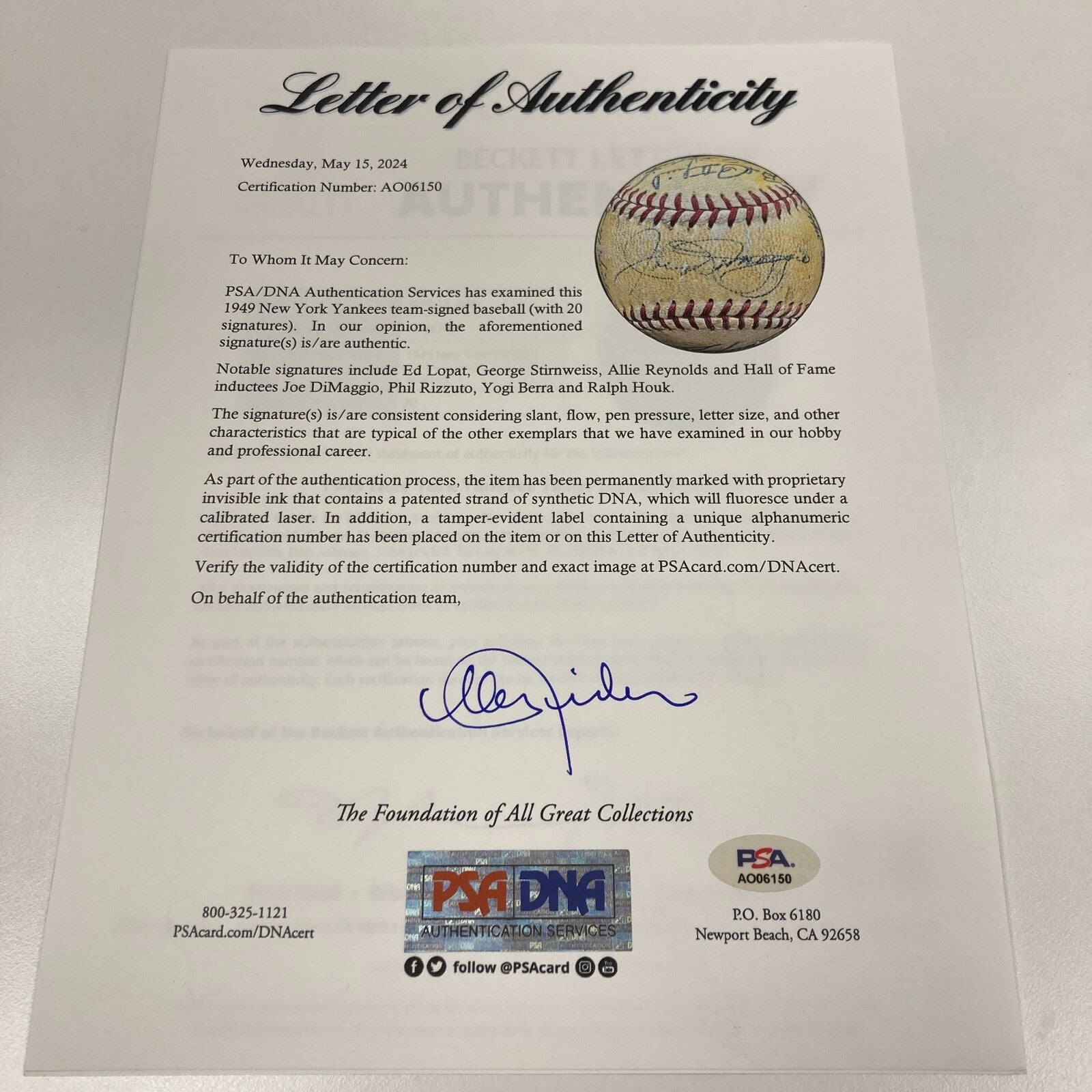 A five-year World Championship run, unprecedented and since unmatched, begins in the Bronx. Twenty members of that historic squad appear on this Official American League (Harridge) ball. Joe DiMaggio is rightfully across the sweet spot in ballpoint ink. Included are: Billy Johnson, Keller, Page, Berra, Shea, Mapes, Woodling, Lopat, Stirnweiss, Rizzuto, Porterfield, Reynolds, Brown, Henrich, Don Johnson, Byrne, Houk, Lindell and two more. Full LOA from PSA/DNA. Full LOA from Beckett Authentication Services.