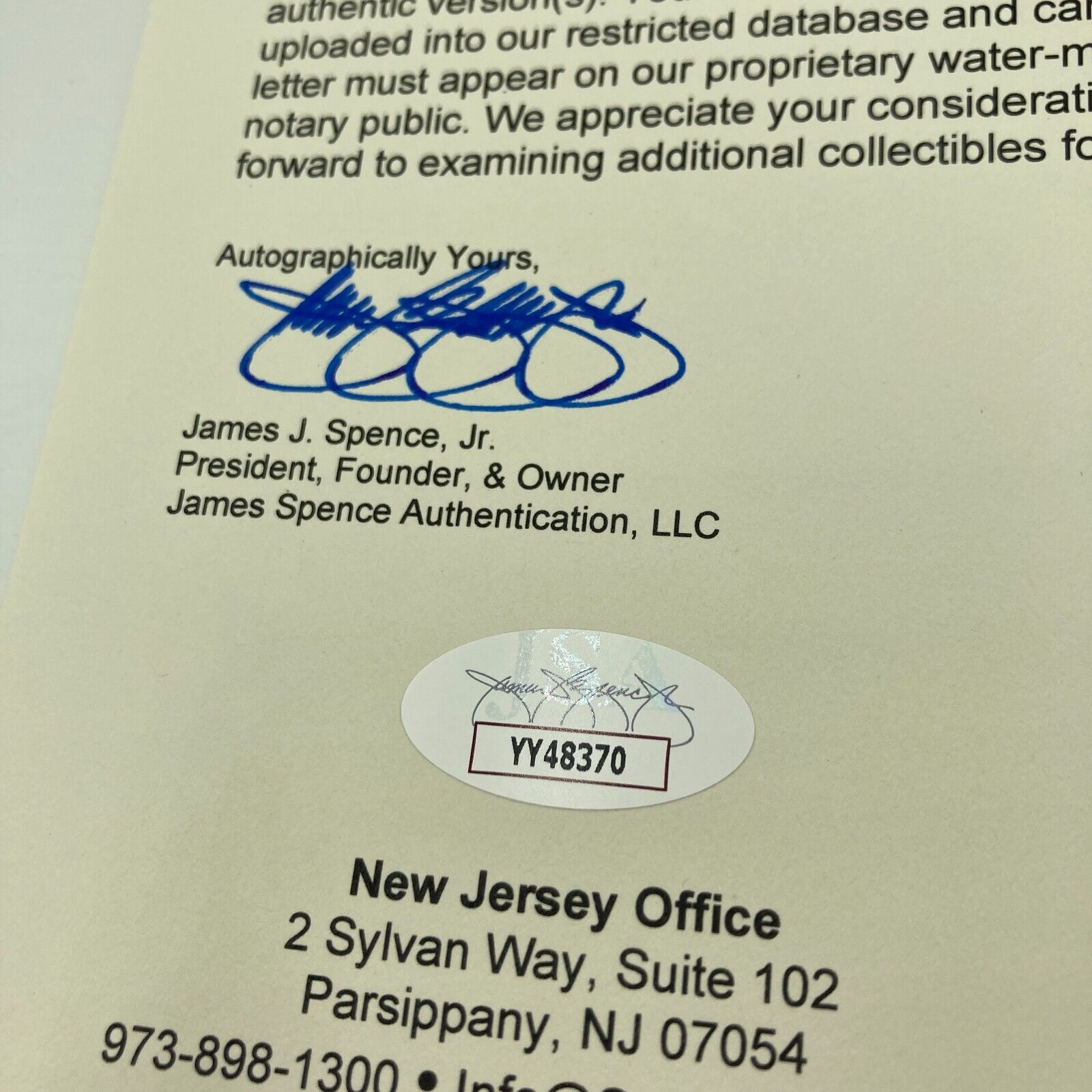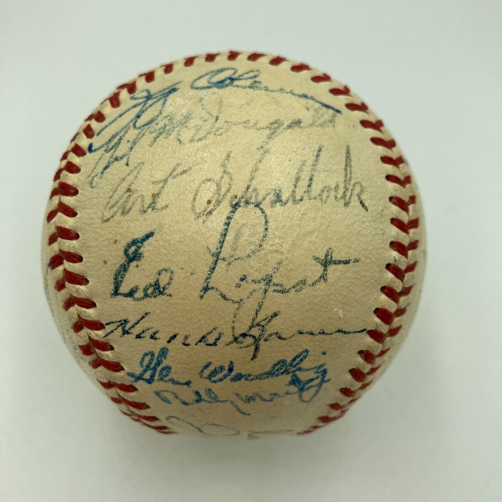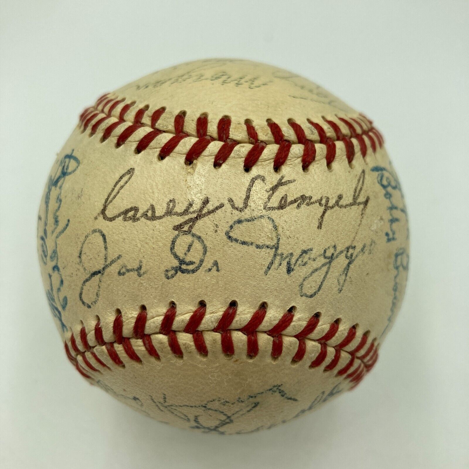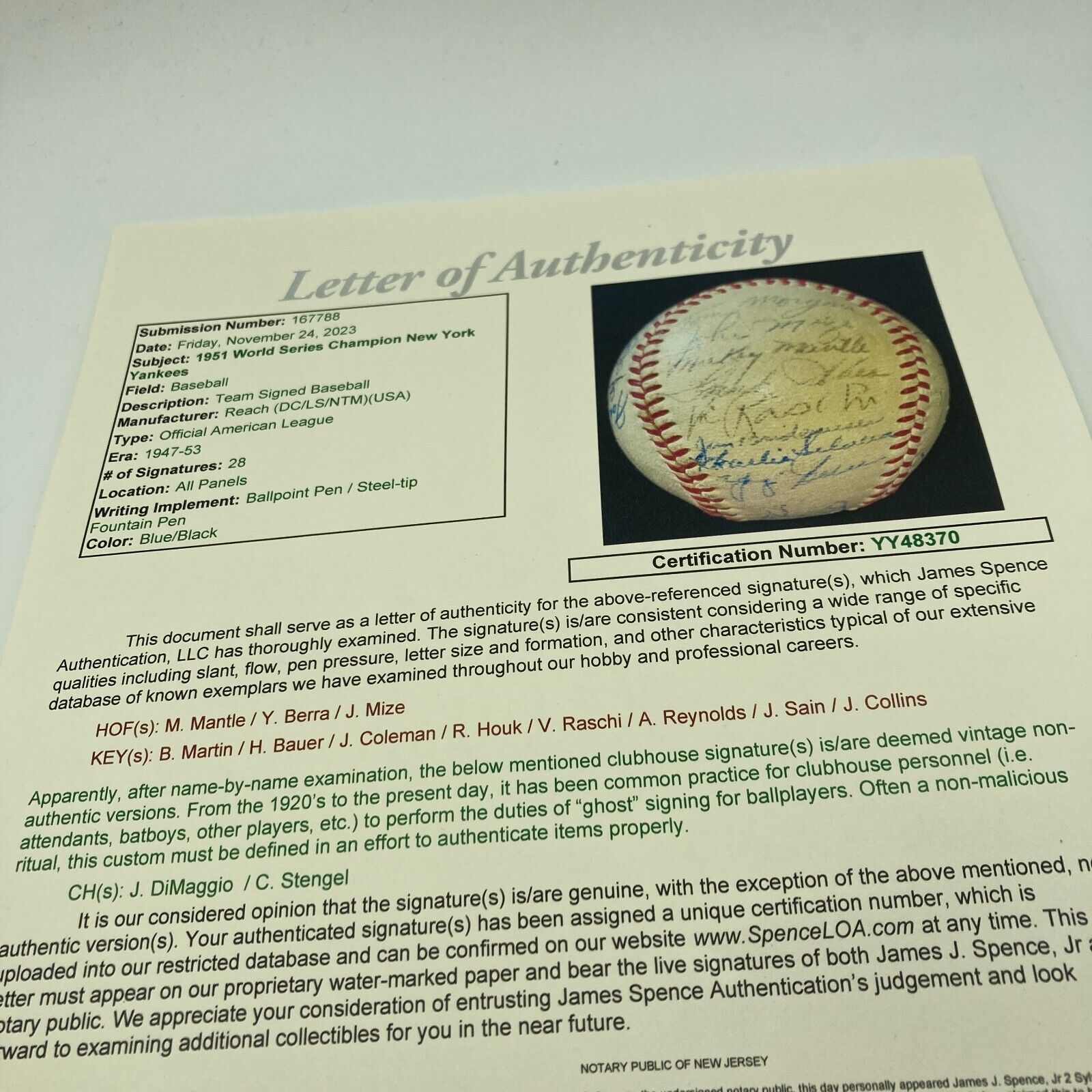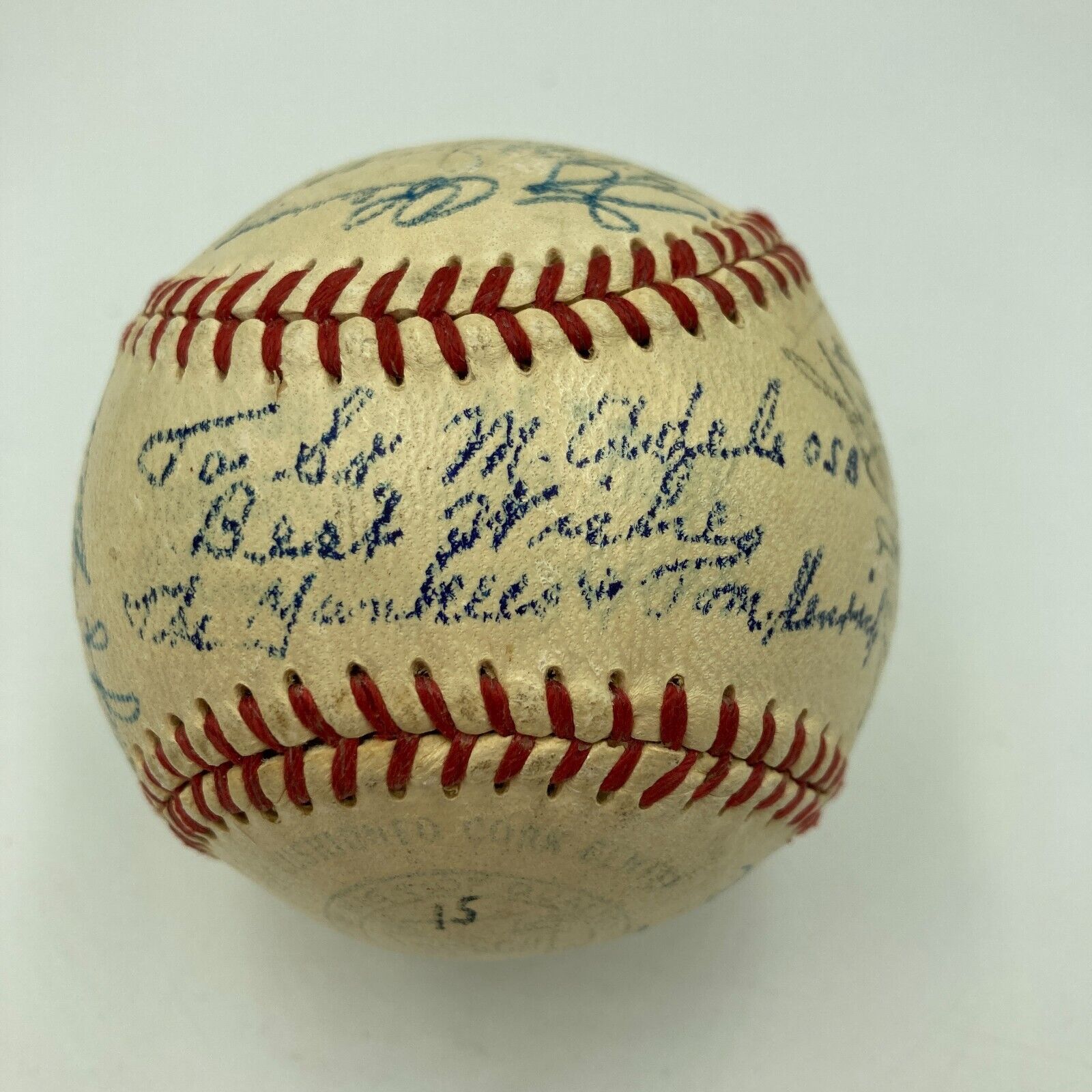 Official American League baseball (Harridge) signed in blue ink by the following 27 members of the 1951 World Champion New York Yankees: Mickey Mantle, Berra, DiMaggio (sweet spot, clubhouse signature), Stengel (sweet spot, clubhouse signature), Morgan, Mize, Shea, Raschi, Brideweser, Silvera, Hopp, Overmire, Ostrowski, Houk, Brown, Kuzava, Reynolds, Sain, Hogue, Coleman, McDougald, Schallock, Lopat, Bauer, Woodling, Muncrief, and one other we could not identify. The notation "To Sr. M Adele - Best Wishes - The Yankees & Tom Henrich" is scripted across the manufacturer stamping. The year 1951 was a momentous one in Yankees history as the team bid farewell to Joe DiMaggio and welcomed his heir apparent, Mickey Mantle. The transition was certainly a smooth one, as the Yankees captured their third consecutive World Championship (en route to a record five consecutive titles) by defeating the Giants in the World Series. 1951 New York Yankees team-signed balls are among the most desirable from the era, and the offered ball is no exception. The manufacturer stampings are faded but otherwise the ball is in Excellent condition overall.