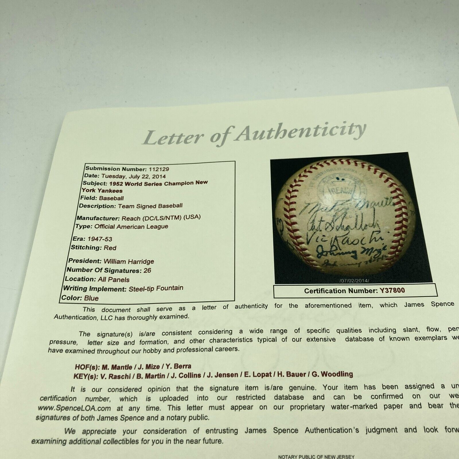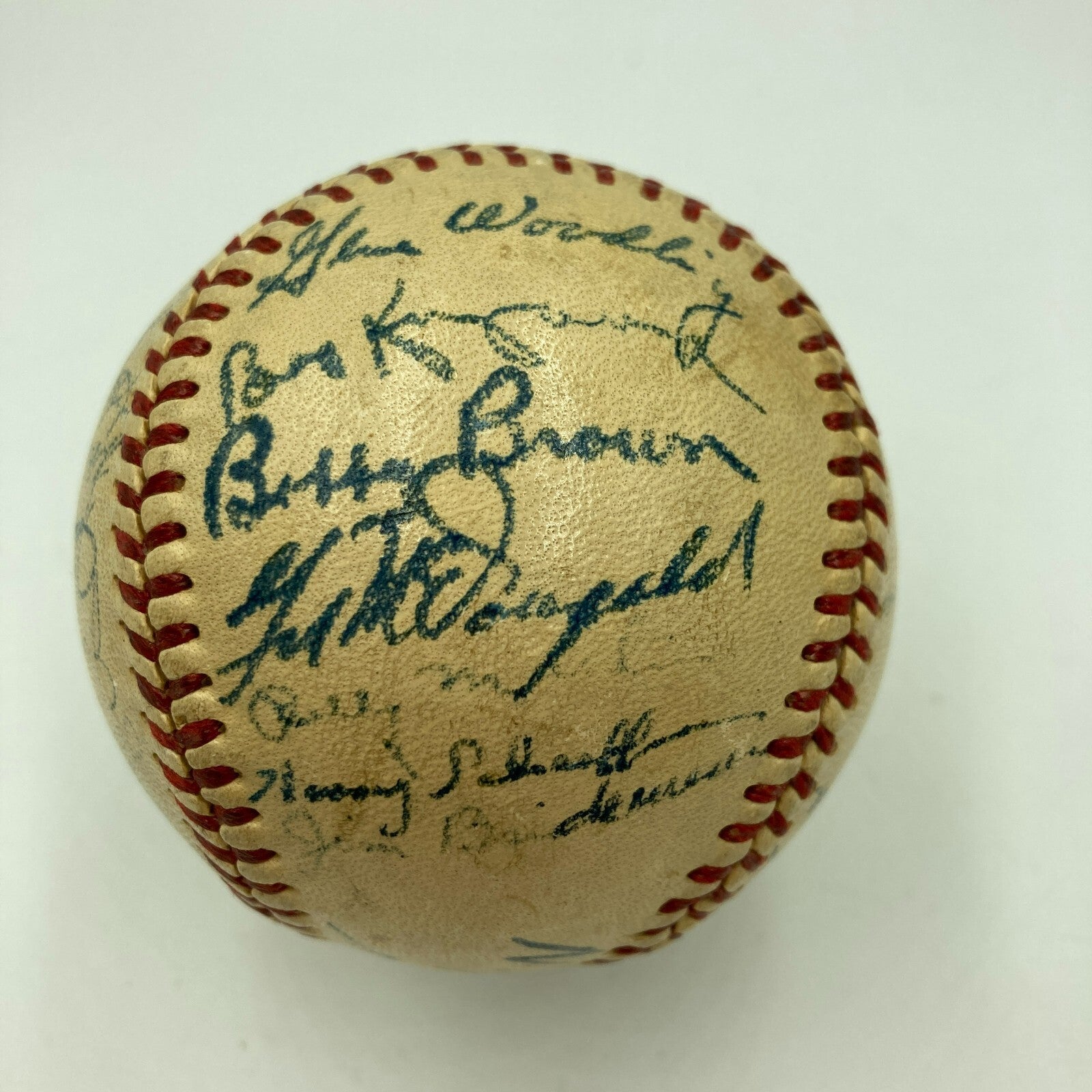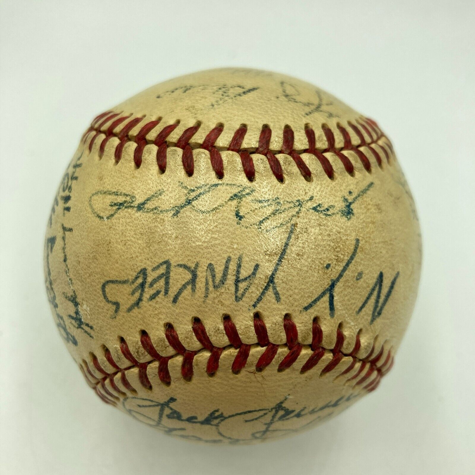 Beautiful 1952 New York Yankees World Series Champs Team Signed Official American League Baseball. 26 signatures with Mickey Mantle, Billy Martin, Johnny Mize, Yogi Berra and the rest of the team.
