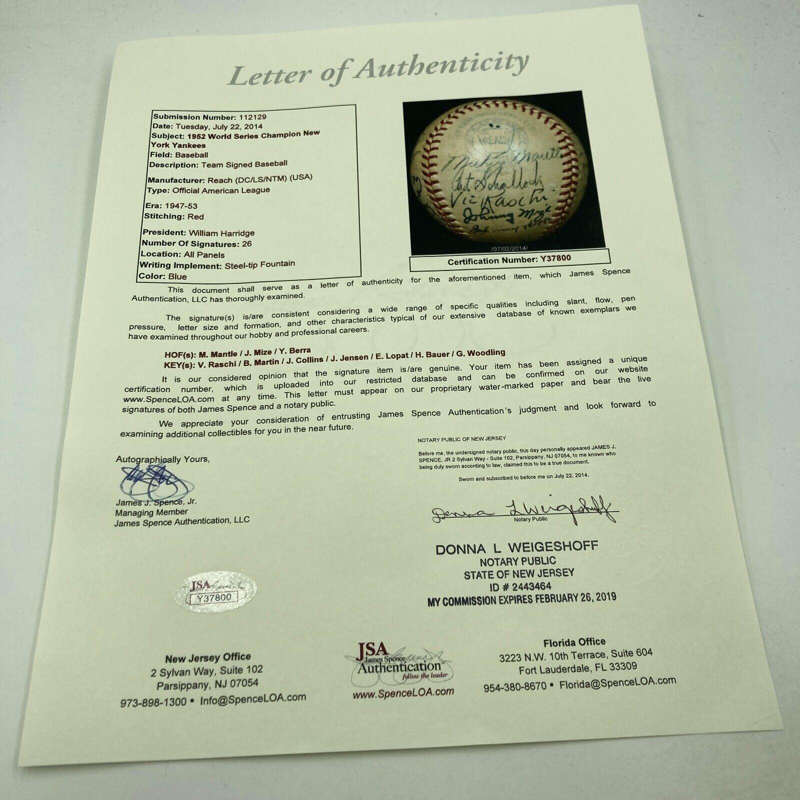 1952 New York Yankees World Series Champs Team Signed Baseball Mickey Mantle JSA