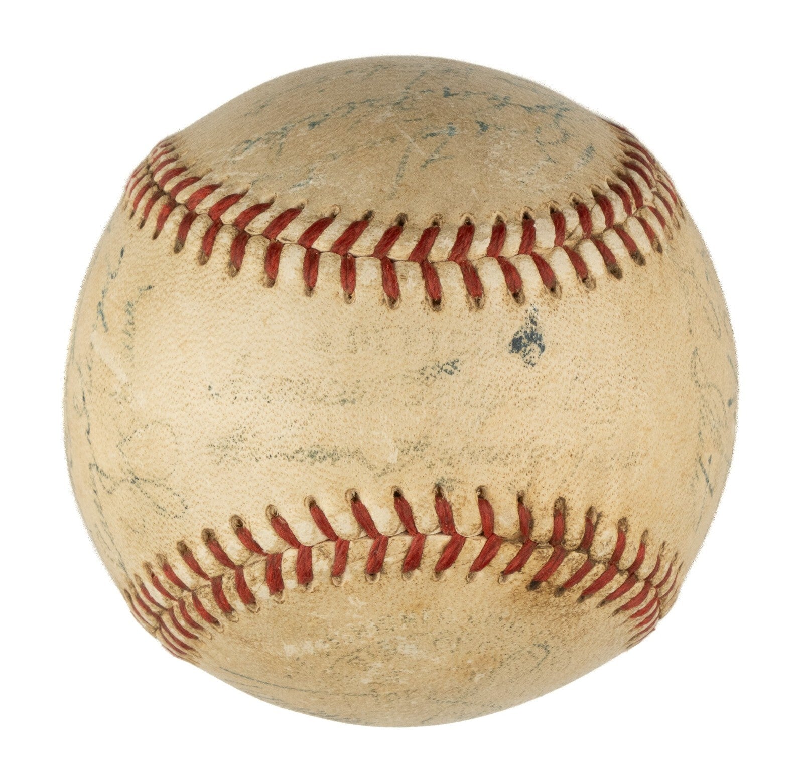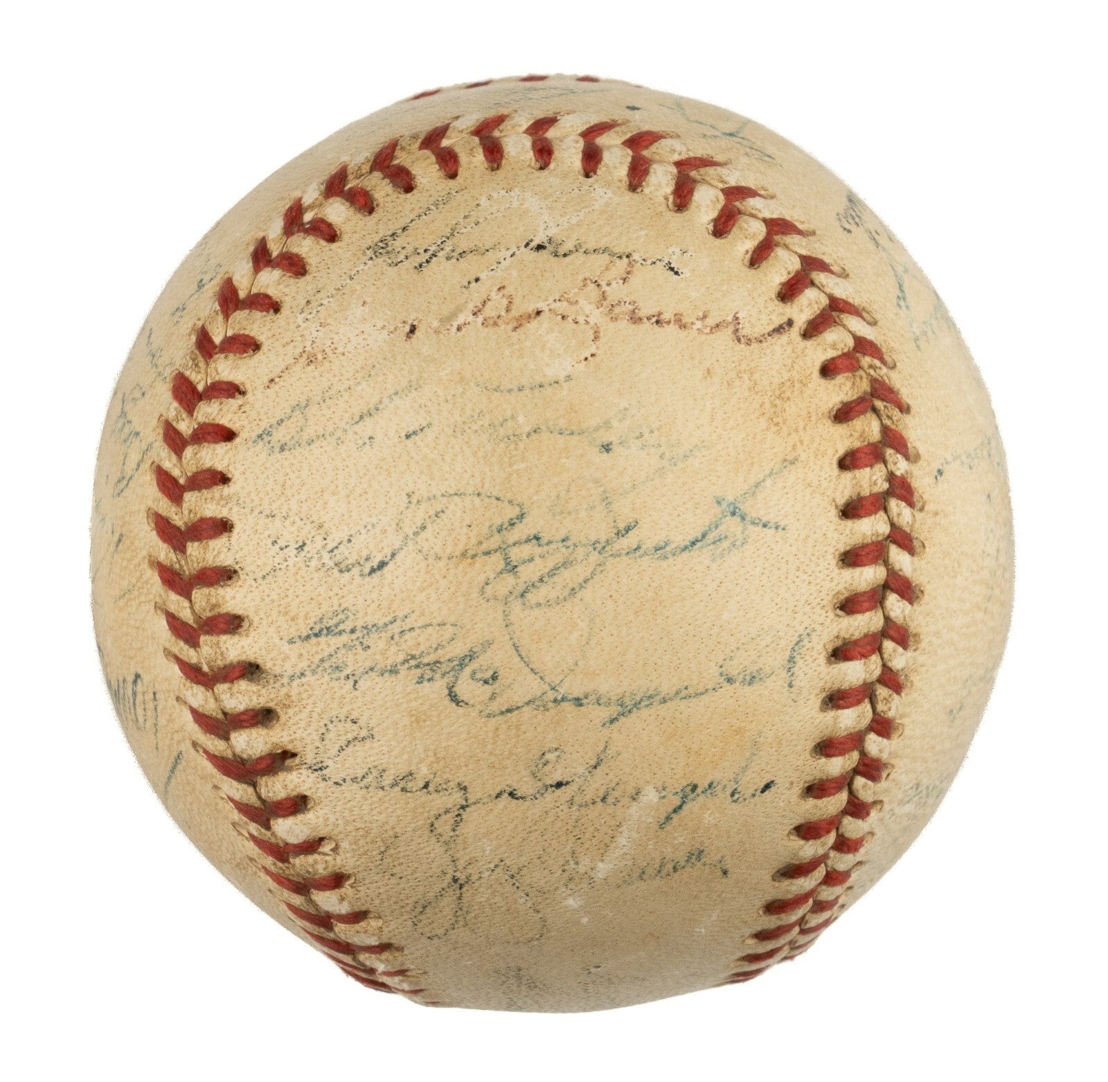 Official American League baseball (Harridge) signed in either blue or black ink by 26 members of the 1955 American League Champion New York Yankees, including Mantle, Berra (sweet spot), Rizzuto (sweet spot), Stengel, Bauer, Skowron, Larsen, McDougald, Coleman, Sain, Leja, Robinson, Lopat, Silvera, Turley, Sturdivant, Carey, Byrne, Cerv, Kucks, Grim, and Wiesler. Full LOA from James Spence/JSA.