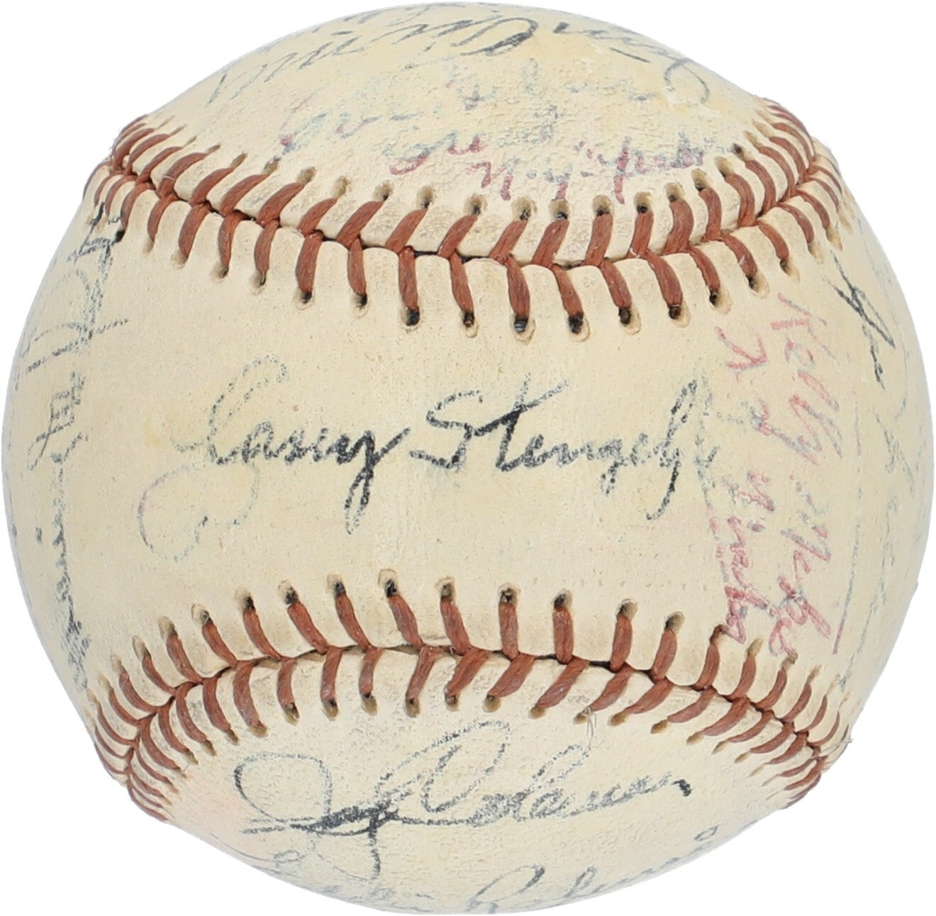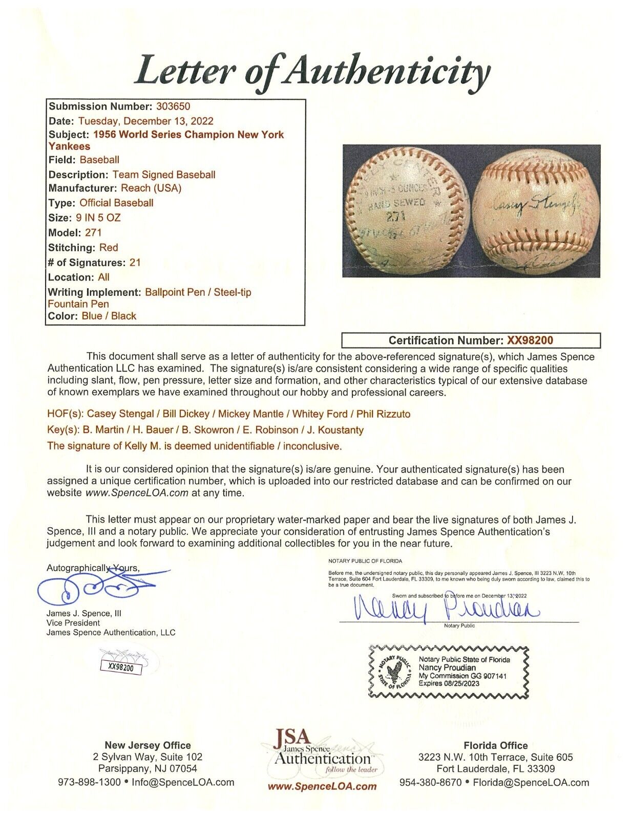 Presented here is a Reach Official Baseball that has been signed by 21 members of the 1956 World Champion New York Yankees. The signatures have been signed in black and red pen. They include Hall of Famers Whitey Ford, Mickey Mantle, and Phil Rizzuto. This comes with an LOA from JSA for the signatures.