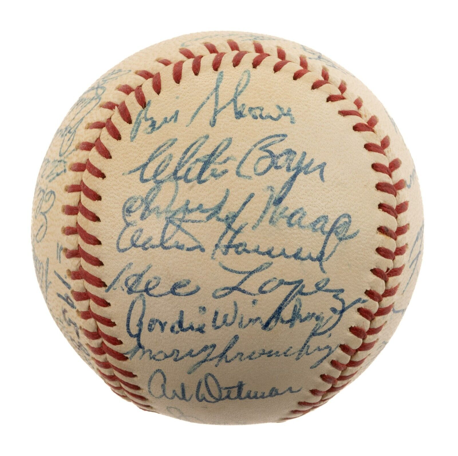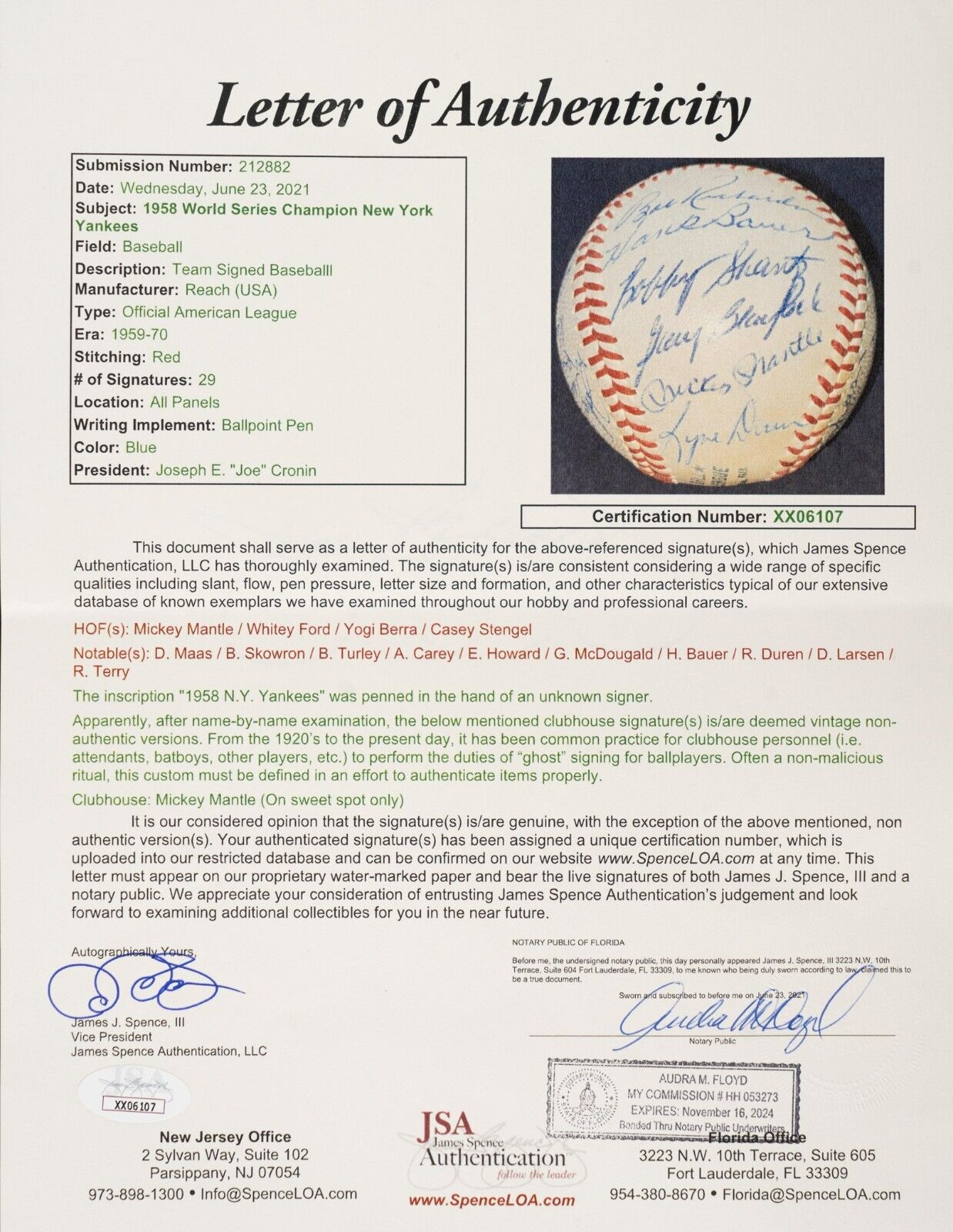 Official American League baseball (Cronin) signed in blue ink by twenty-nine members of the 1958 World Champion New York Yankees. The signatures represented here are those of Mickey Mantle (twice; one on the sweet spot is clubhouse), Casey Stengel (Mgr.), Yogi Berra (sweet spot), Whitey Ford, Maas (twice), Richardson, Bauer, Shantz, Blaylock (played in 1959), Duren, Skowron, Boyer, Howard, Lopez, Windhorn (played in 1959), Throneberry, Ditmar, Terry, Grba (played in 1959), McDougald, Carey, Blanchard, Freeman (played in 1959), Hunt (played in 1959), Coates, Larsen, and Turley. The notation "1958 N.Y. Yankees" is written on a side panel. The ball is in Near Mint condition overall. Full LOA from James Spence/JSA.