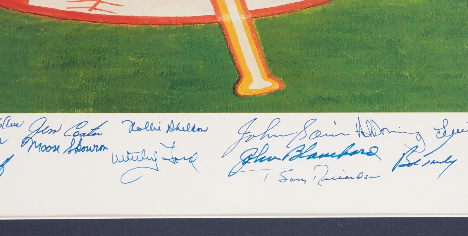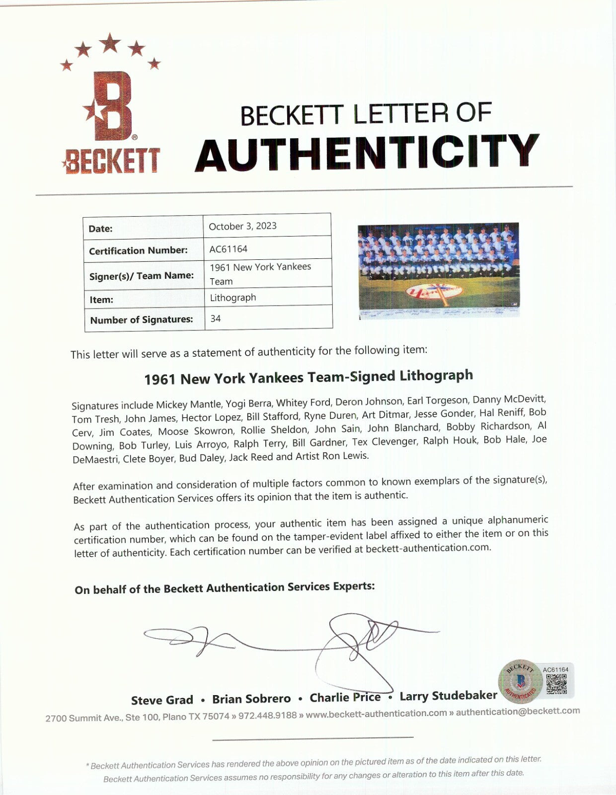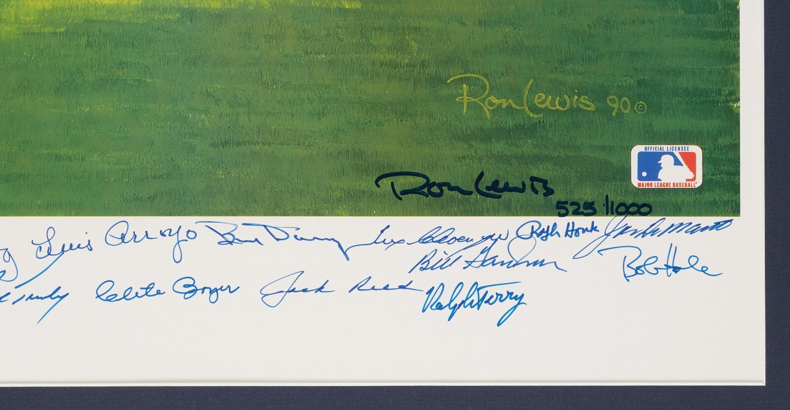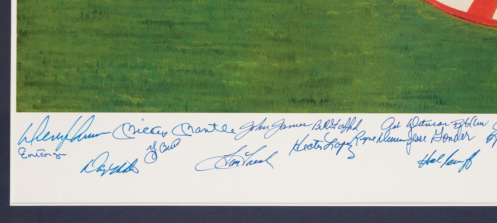 This 48x26 framed lithograph features the 1961 New York Yankees with artwork by Ron Lewis with 33 signatures near the bottom, with each in blue Sharpie. The lithograph is signed by: Mickey Mantle, Yogi Berra, Hector Lopez, Moose Skowron, Jim Coates, Whitey Ford, Johnny Sain, Johnny Blanchard, Al Downing, Ralph Terry, Ralph Houk, Luis Arroyo, Tom Tresh, Bobby Richardson, Clete Boyer and others, along with the artist. The litho arrives framed, numbered 525/1000 and signatures are authenticated by Beckett with a full LOA.