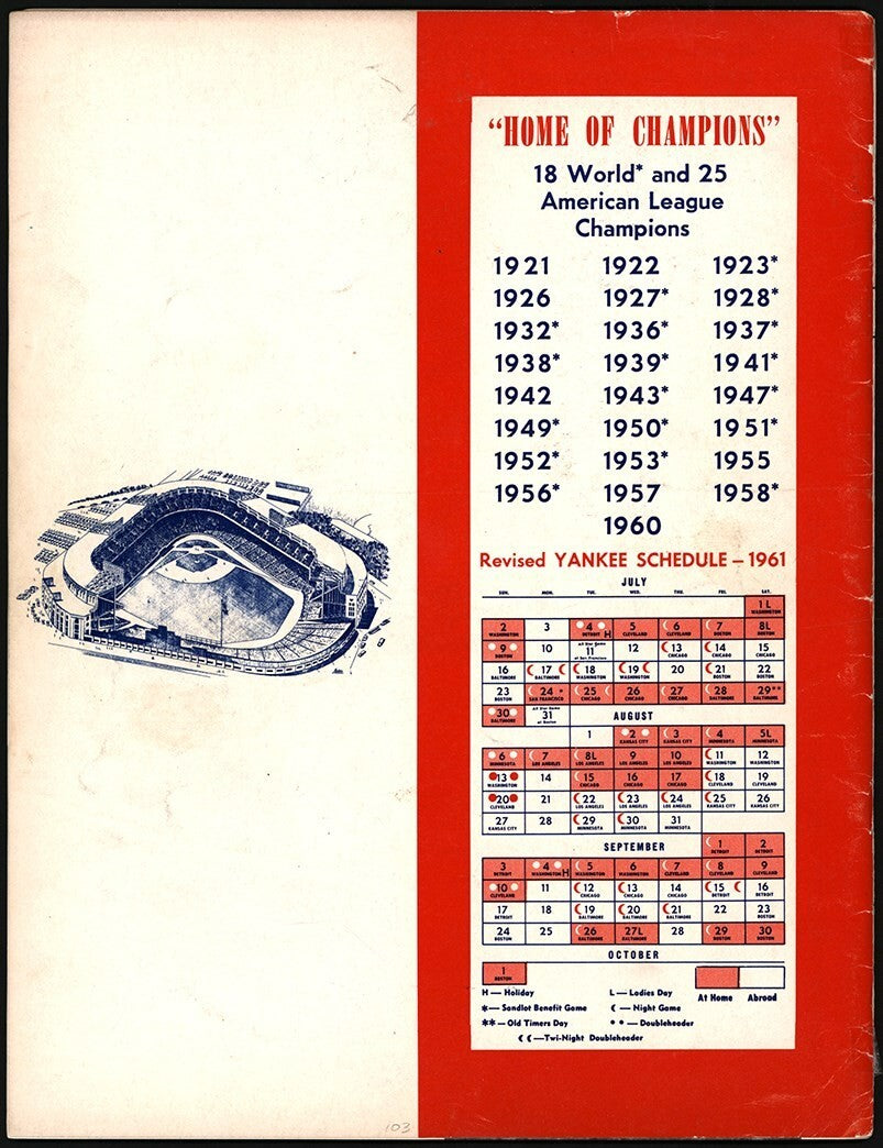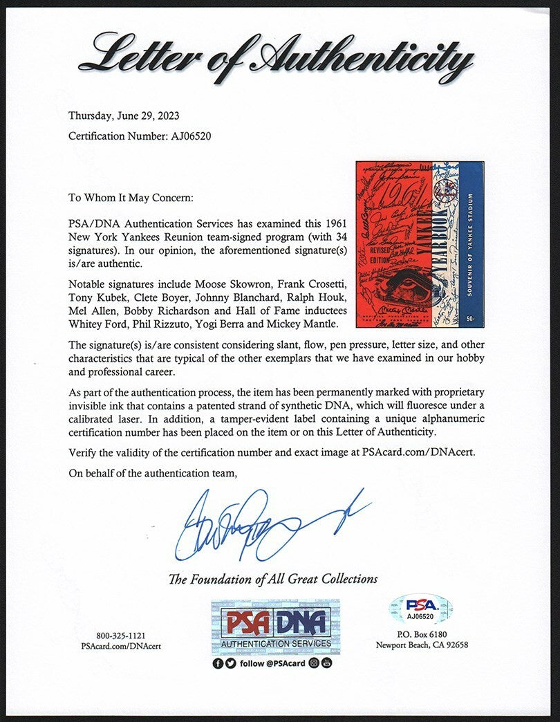 New York Yankees Yearbook features thirty-three (33) 1961 World Champion Yankees signatures including Mickey Mantle, Yogi Berra, Mel Allen, Ralph Houk, Phil Rizzuto, Whitey Ford, Johnny Sain, Frank Crosetti, Moose Skowron, Hector Lopez, and more. Program is clean with no creases; cover is detached from rest of the pages. Comes with PSA LOA.
