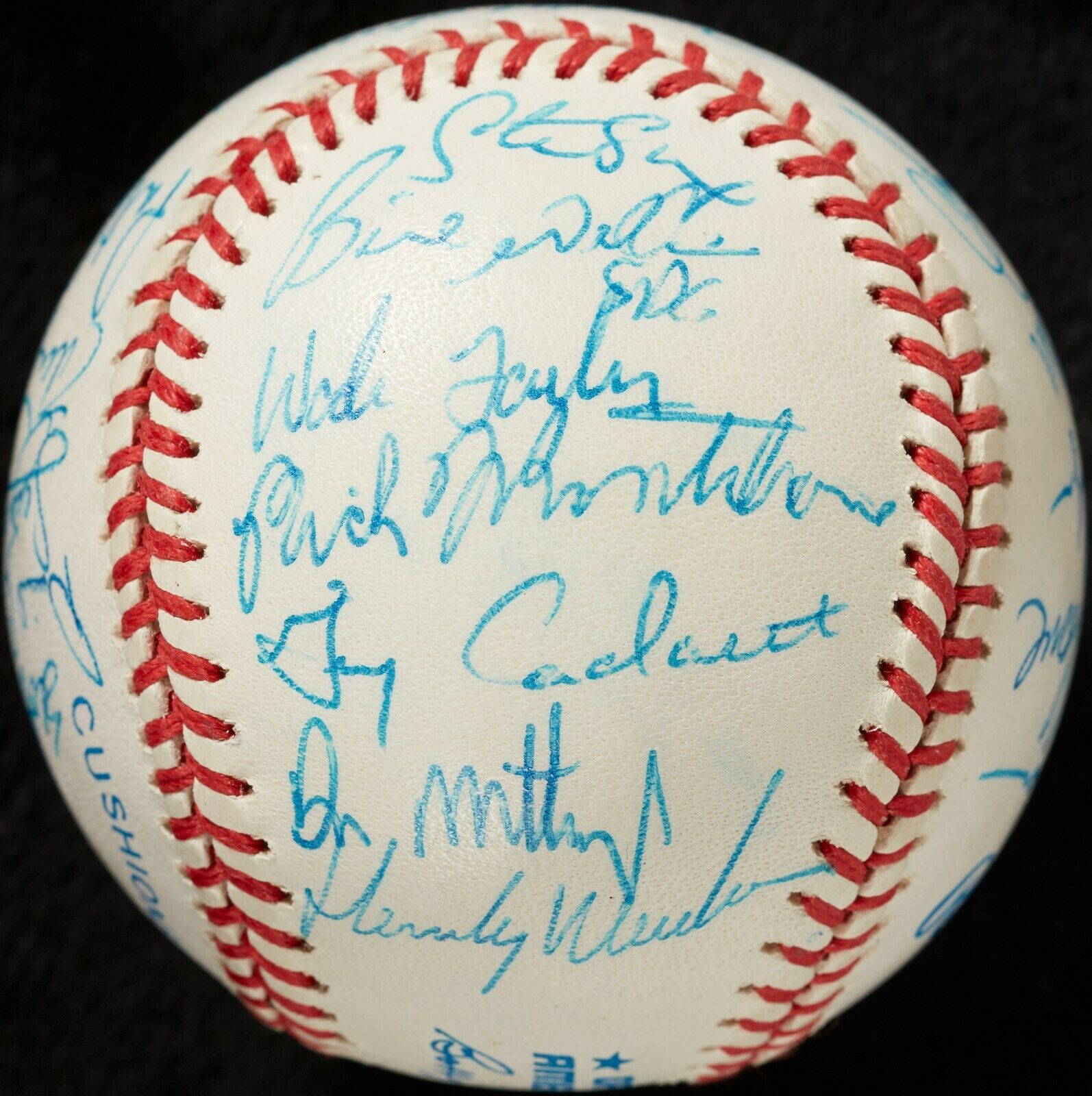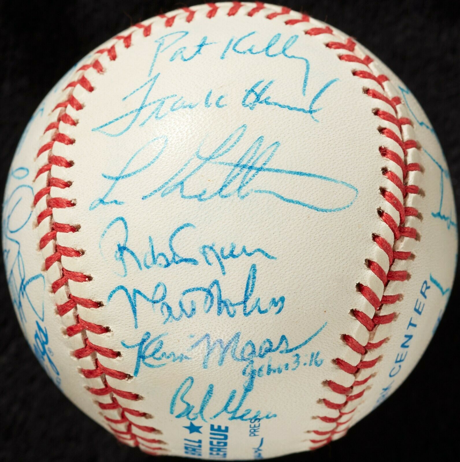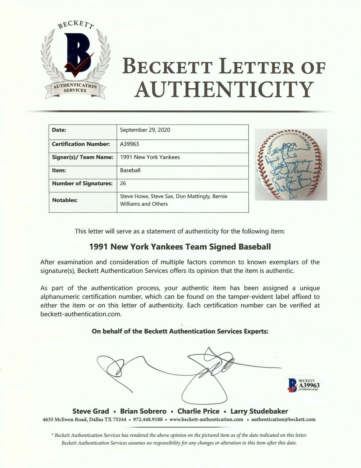 This Official American League baseball is signed by 26 members of the 1991 New York Yankees, with manager Stump Merrill on the sweet spot. Signatures include: Don Mattingly, Bernie Williams, Steve Sax, Steve Howe, Pat Kelly, Kevin Maas and more. Signatures are authenticated by BAS with a full LOA.