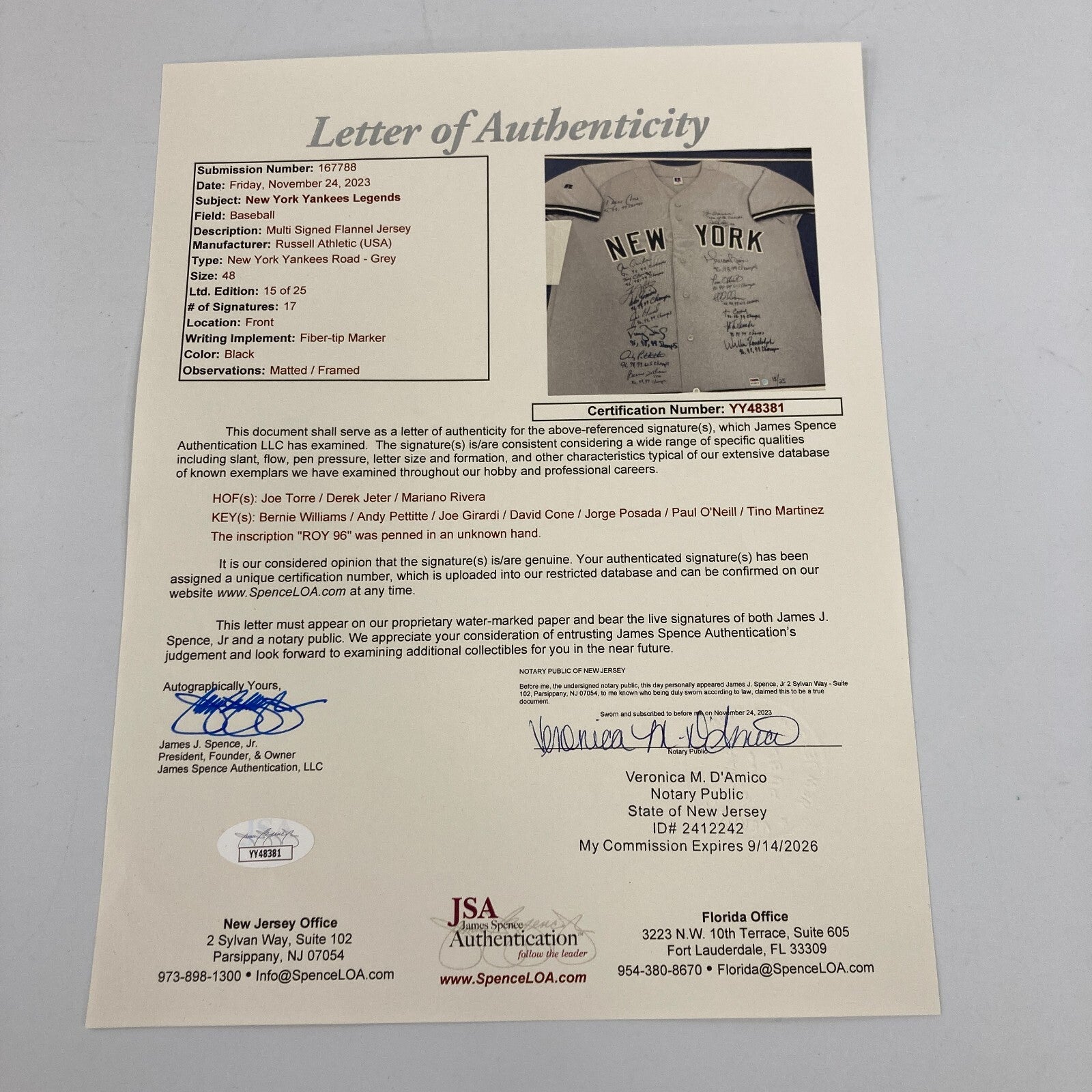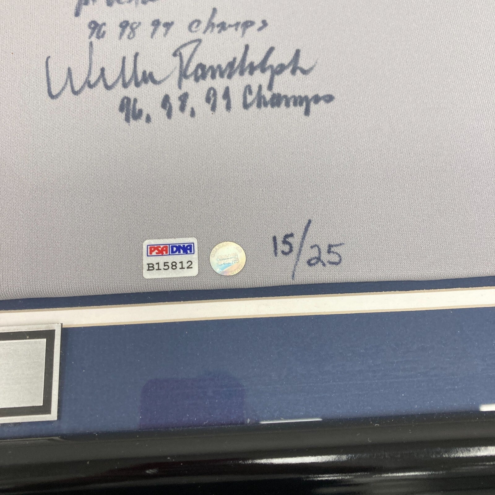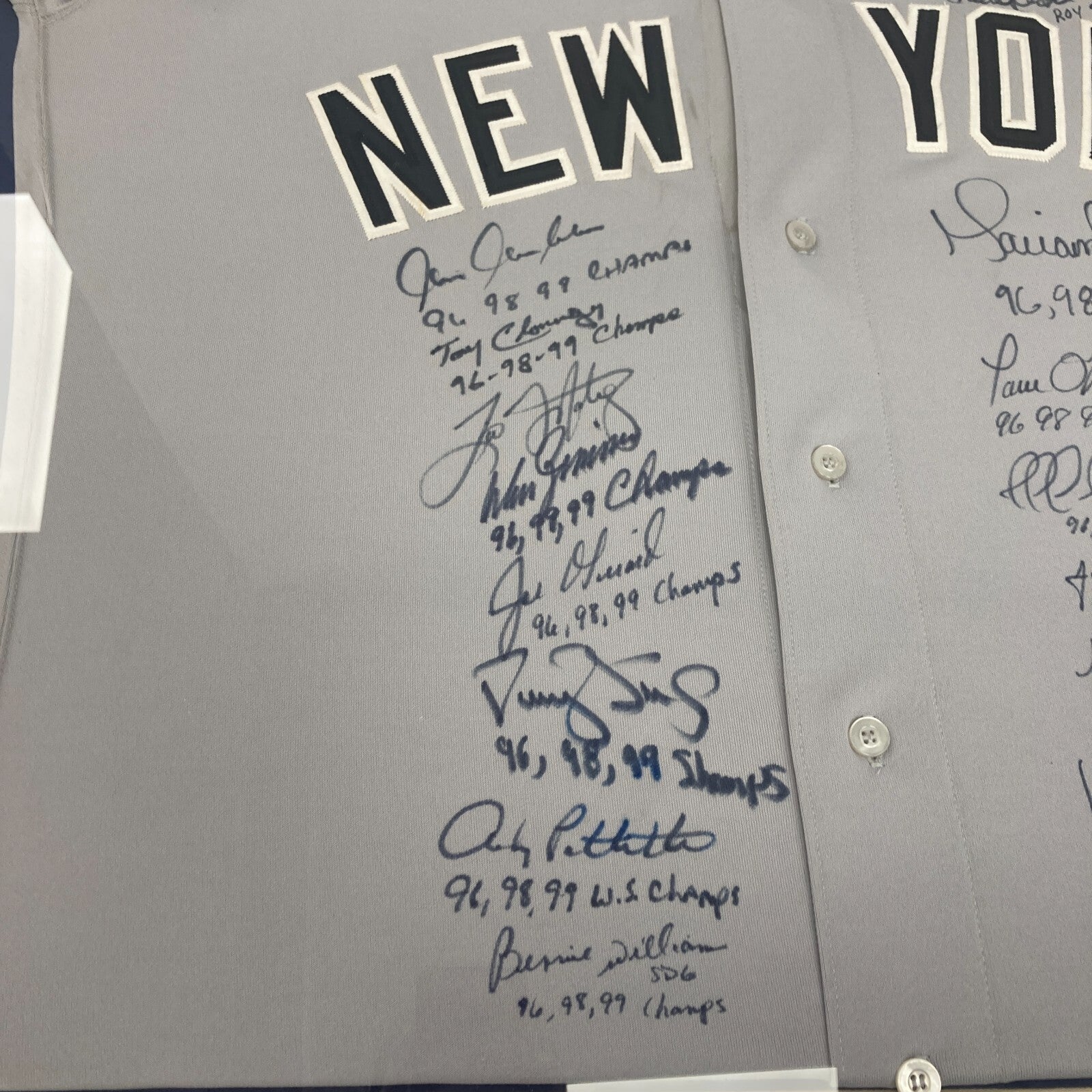 with Derek Jeter, Mariano Rivera, Joe Torre, Bernie Williams, Andy Pettitte, Joe Girardi, David Cone, Jorge Posda, Paul O'neil, Tino Martinez and others. The players inscribed the years they won the World Series. The jersey is custom framed.