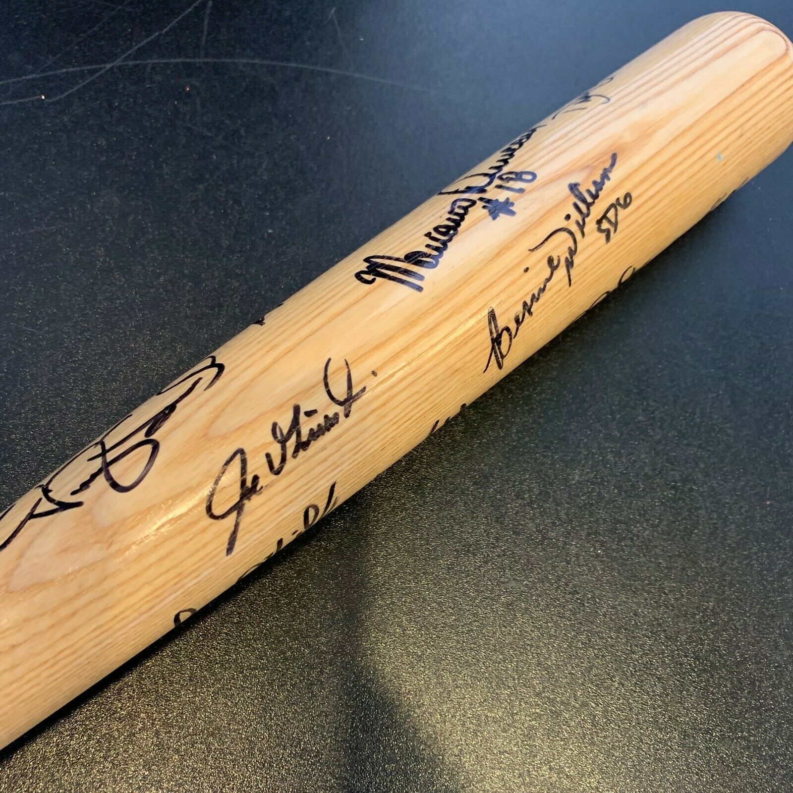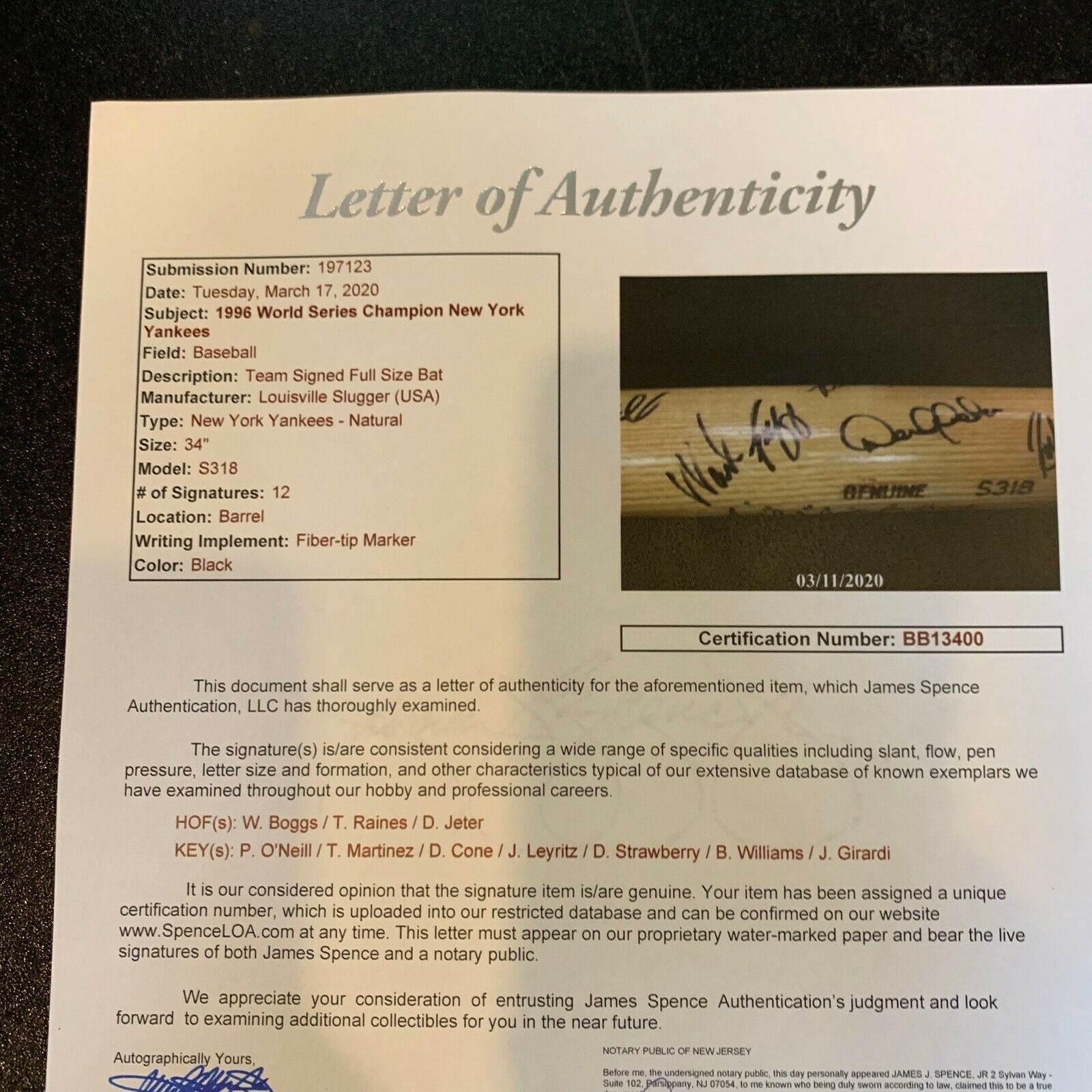 1996 New York Yankees World Series Champs Team Signed Joe Girardi game issued Bat. Signatures include Derek Jeter, Wade Boggs, Tim Raines, Paul O'neill, Tino Martinez, Dave Cone, Bernie Williams, Jim Leyritz, Joe Girardi. Full letter JSA COA.