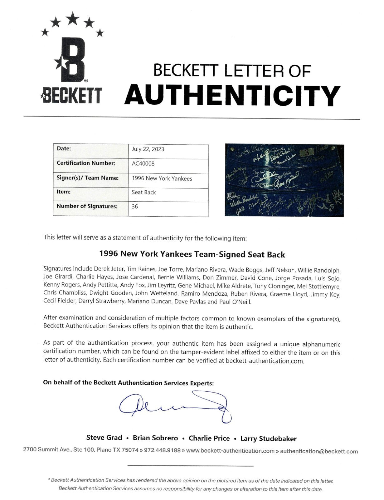 This Beautiful New York Yankees Stadium Seatback has been personally signed by 36 members of the 1996 World Series team in a silver pen. Key signatures include- Derek Jeter, Mariano Rivera, Andy Pettite, David Cone, Bernie Williams, Joe Torre, Tino Martinez, Don Zimmer. Full letter Beckett LOA.