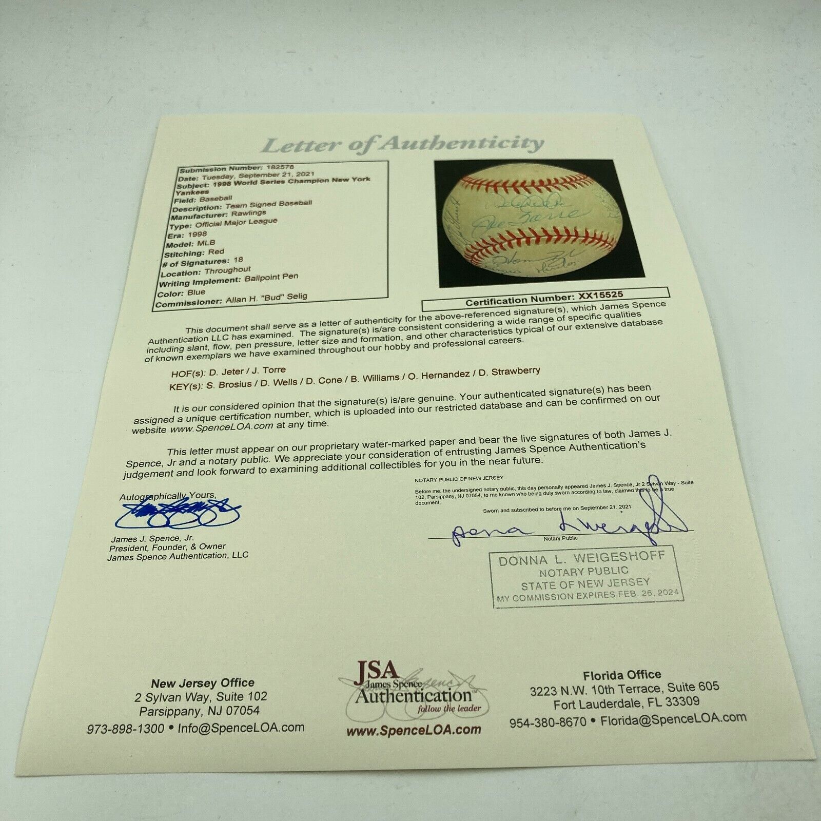 1998 New York Yankees World Series Champs Team Signed Official World Series Baseball. 18 signatures with Derek Jeter, Joe Torre, Bernie Williams, Scott Brosius, David Wells, David Cone, Orlando Hernandez and many others.
