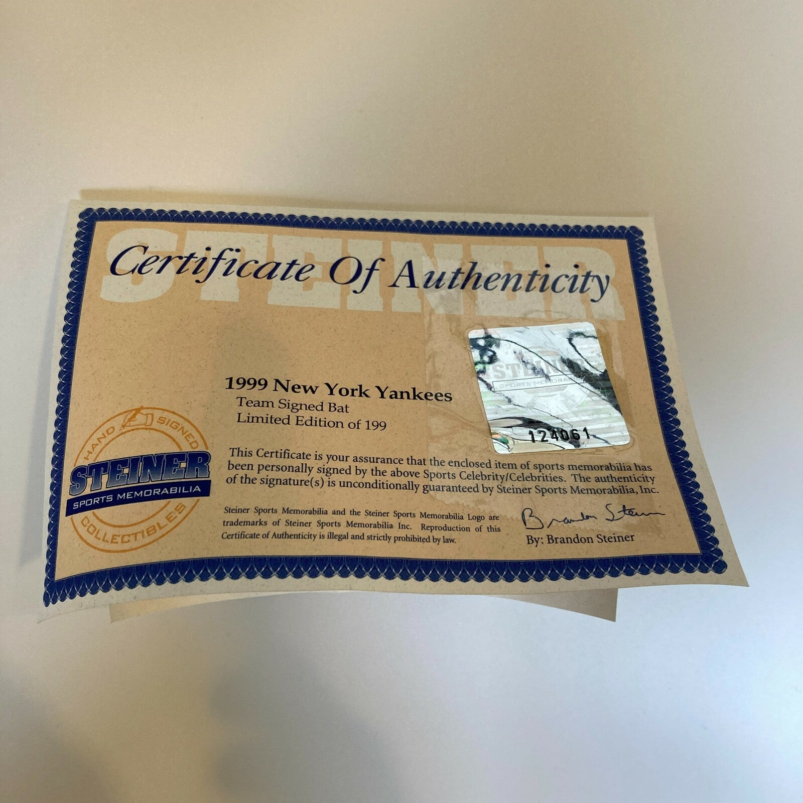 The New York Yankees put the finishing touches on their 25th World Series title in 1999, sweeping the Braves 4-0 to secure the crown. It was the first time a team swept the World Series in back-to-back years since the Bronx Bombers did it in 1938-39. Offered here is a limited-edition number 94 of 1999 Rawlings Big Stick bat signed by multiple members of the 1999 World Champion New York Yankees. The signatures on the bat were signed with a blue marker. The bat includes signatures from Hall of Famers Mariano Rivera, Derek Jeter and Joe Torre, along with Bernie Williams, Paul O’Neil, Don Zimmer, Tino Martinez, Jeff Nelson, Ramiro Mendoza, Chris Chambliss, Roger Clemens, David Cone and others. The item comes with a STICKER ONLY from Steiner Sports (124061) for the signatures.