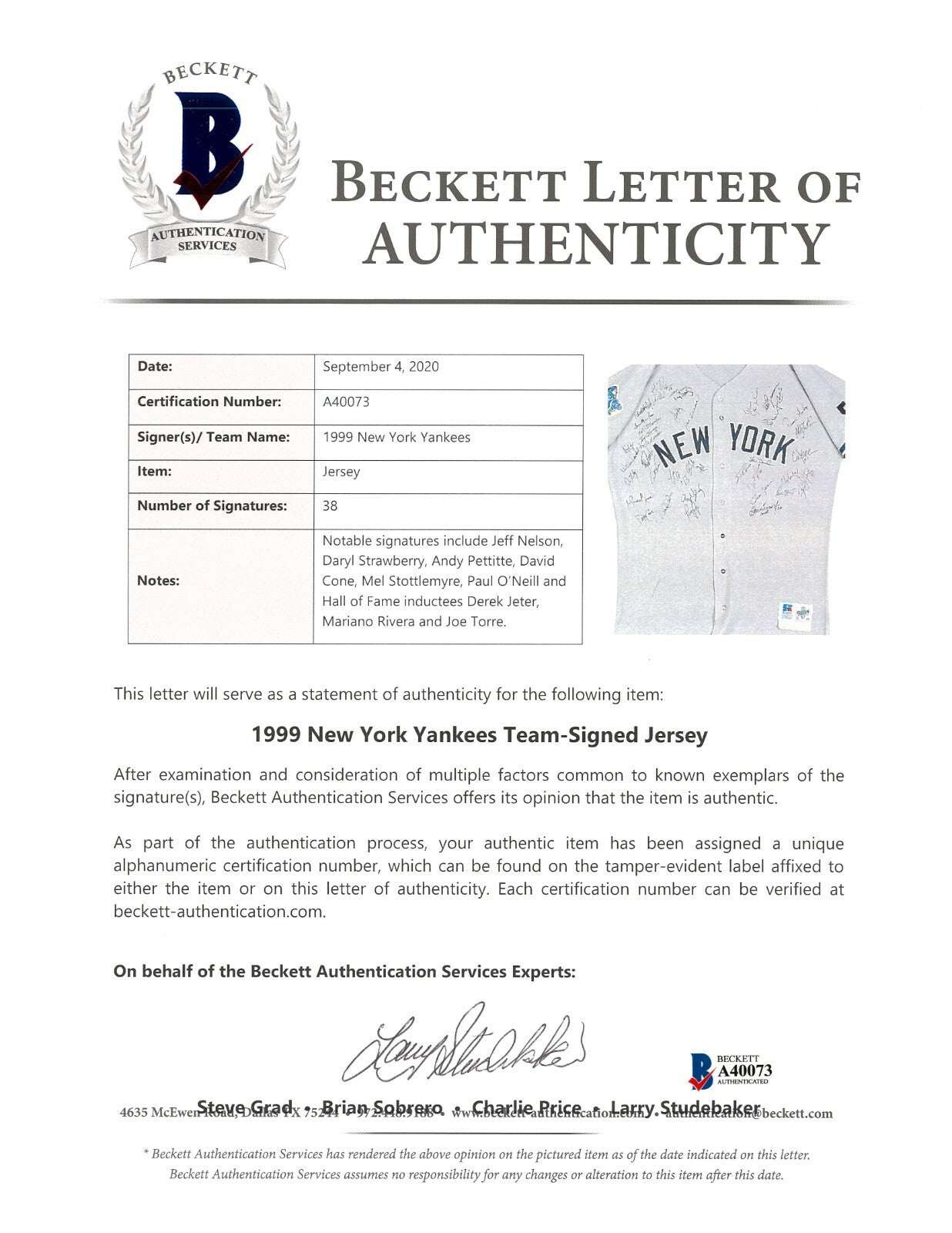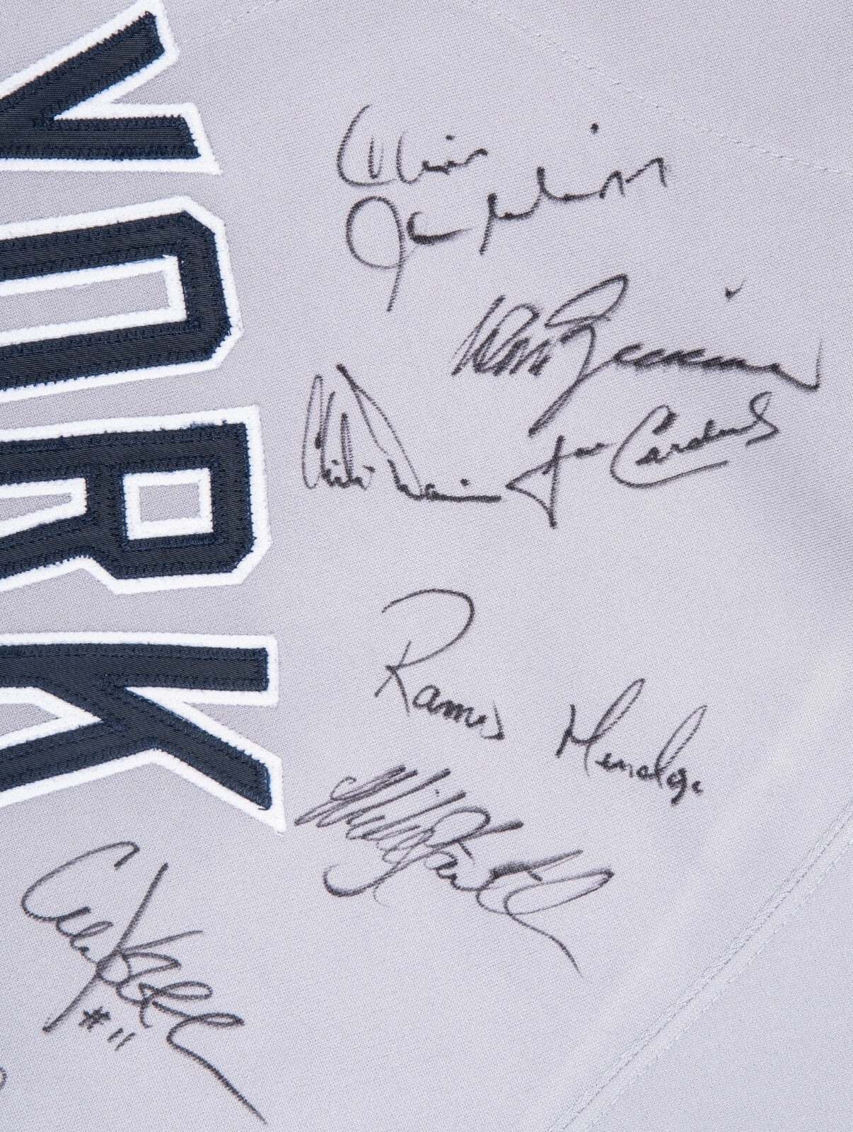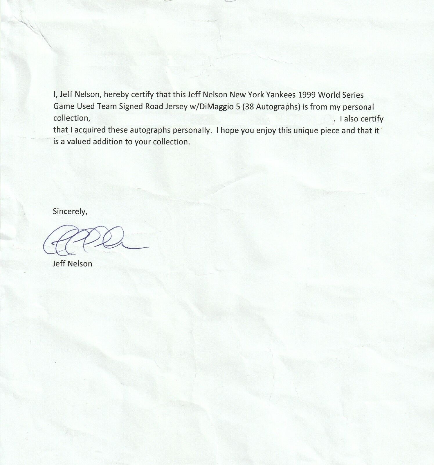 Adding to this jersey are 38 signatures from members of the 1999 World Series champion team that Nelson had sign. All of the signatures are in black marker and were signed on the front of the jersey. The signatures include Hall of Famers Derek Jeter, Mariano Rivera and Joe Torre, along with Andy Pettitte, Willie Randolph, David Cone, Dan Naulty, Luis Sojo, Jim Leyritz, Joe Girardi, Gene Monahan, Mel Stottlemyre, Tony Cloninger, Jeff Nelson, Orlando Hernandez, Jose Cardenal, Paul O’Neill, Ramiro Mendoza, Clay Bellinger, Scott Brosius, Shane Spencer, Steve Donahue, Mike Stanton, Chili Davis, Jorge Posada, Darryl Strawberry and others. A great game use jersey directly from one of the key players from the 1999 Yankees squad and with 38 signatures! This comes with a LOA from Jeff Nelson and a LOA from Beckett Authentication.