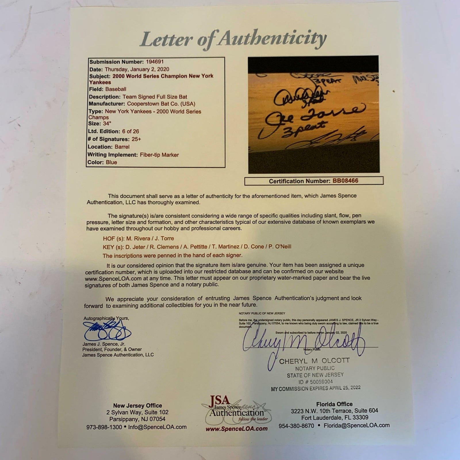 2000 Yankees Team Signed Bat Derek Jeter Mariano Rivera Inscribed "3 Peat" JSA