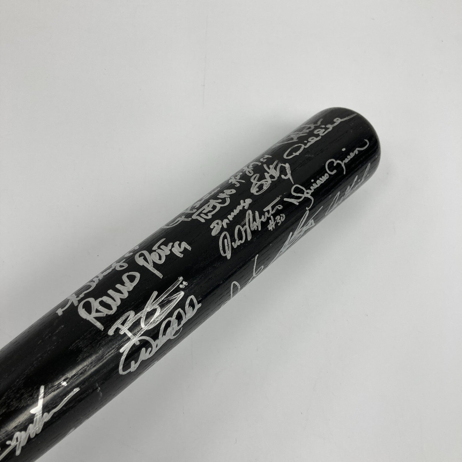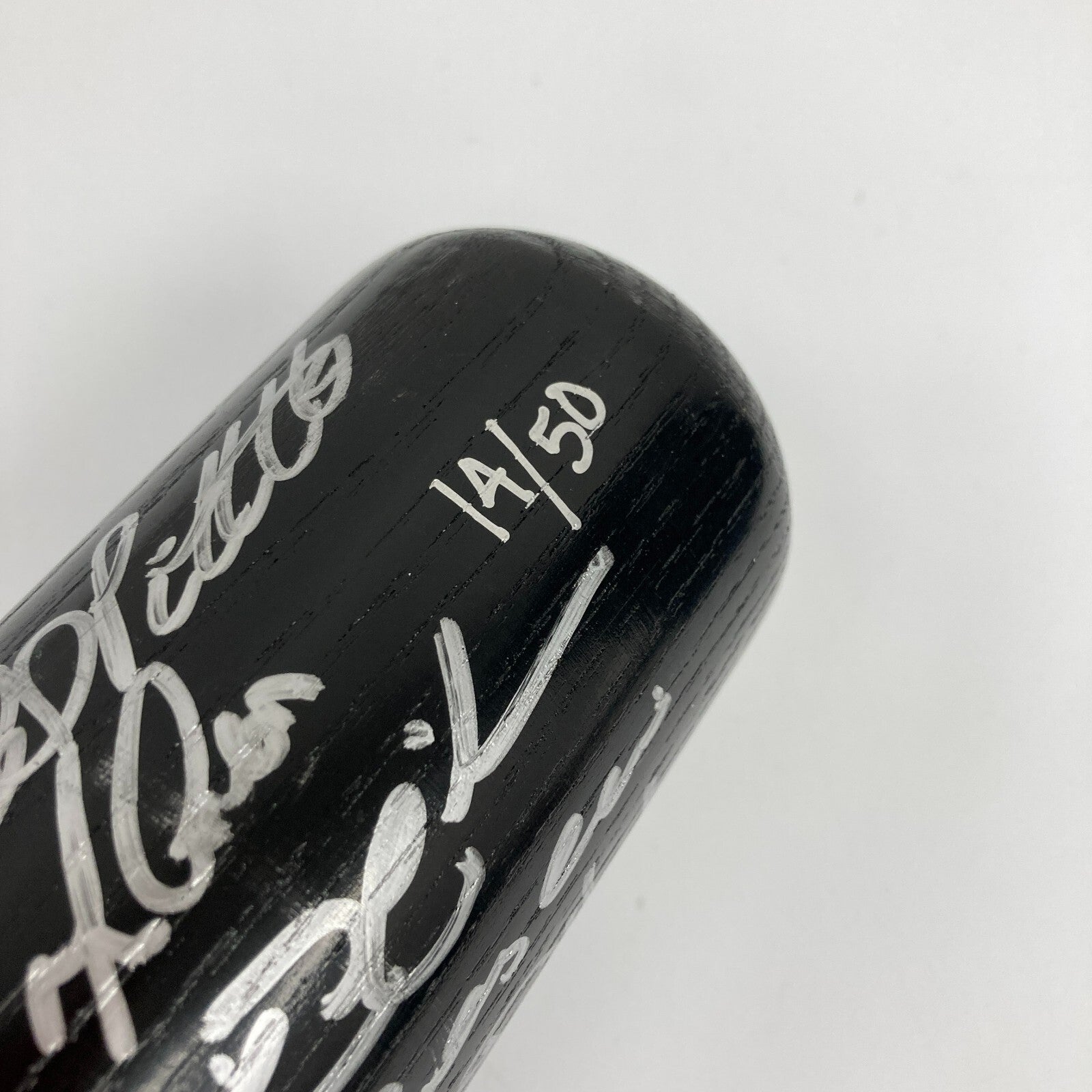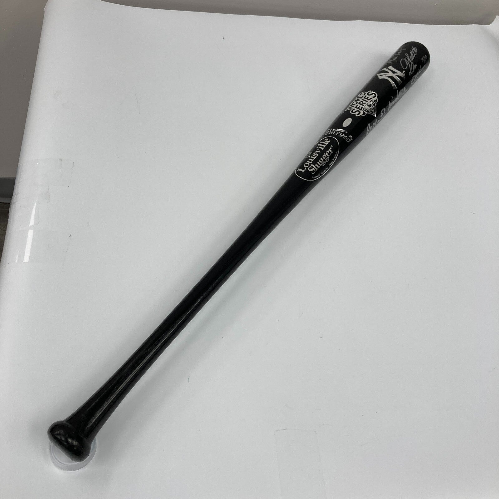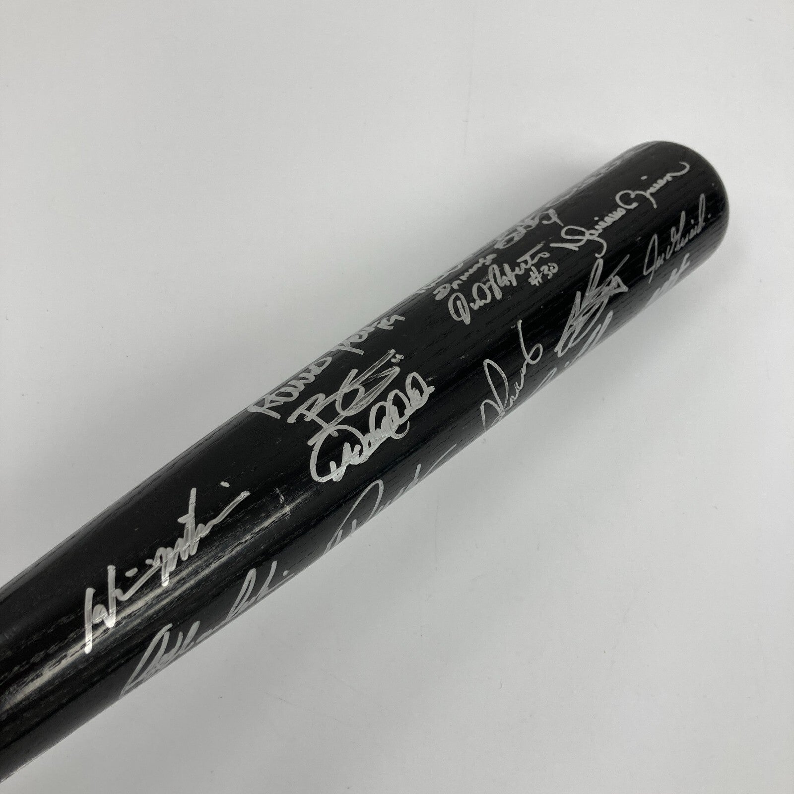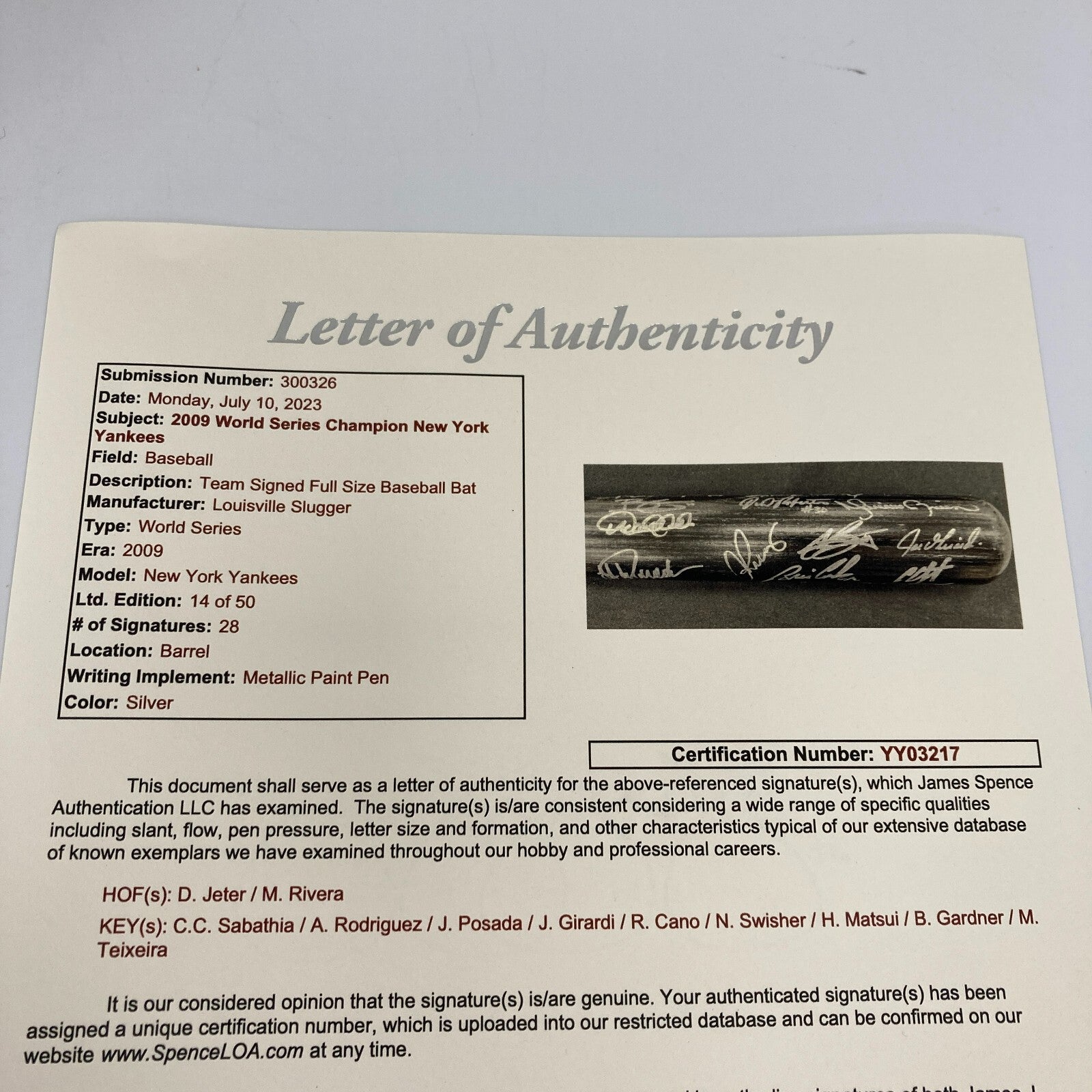 Louisville Slugger bat with impressed 2009 World Series and Yankees team logos is hand numbered "14/50." Signed by approx. (30) including Derek Jeter, Mariano Rivera, Andy Pettite, Phi Hughes, Hideki Matsui, Alex Rodriguez, Joe Girardi, Brian Cashman, Jorge Posada, and many others.