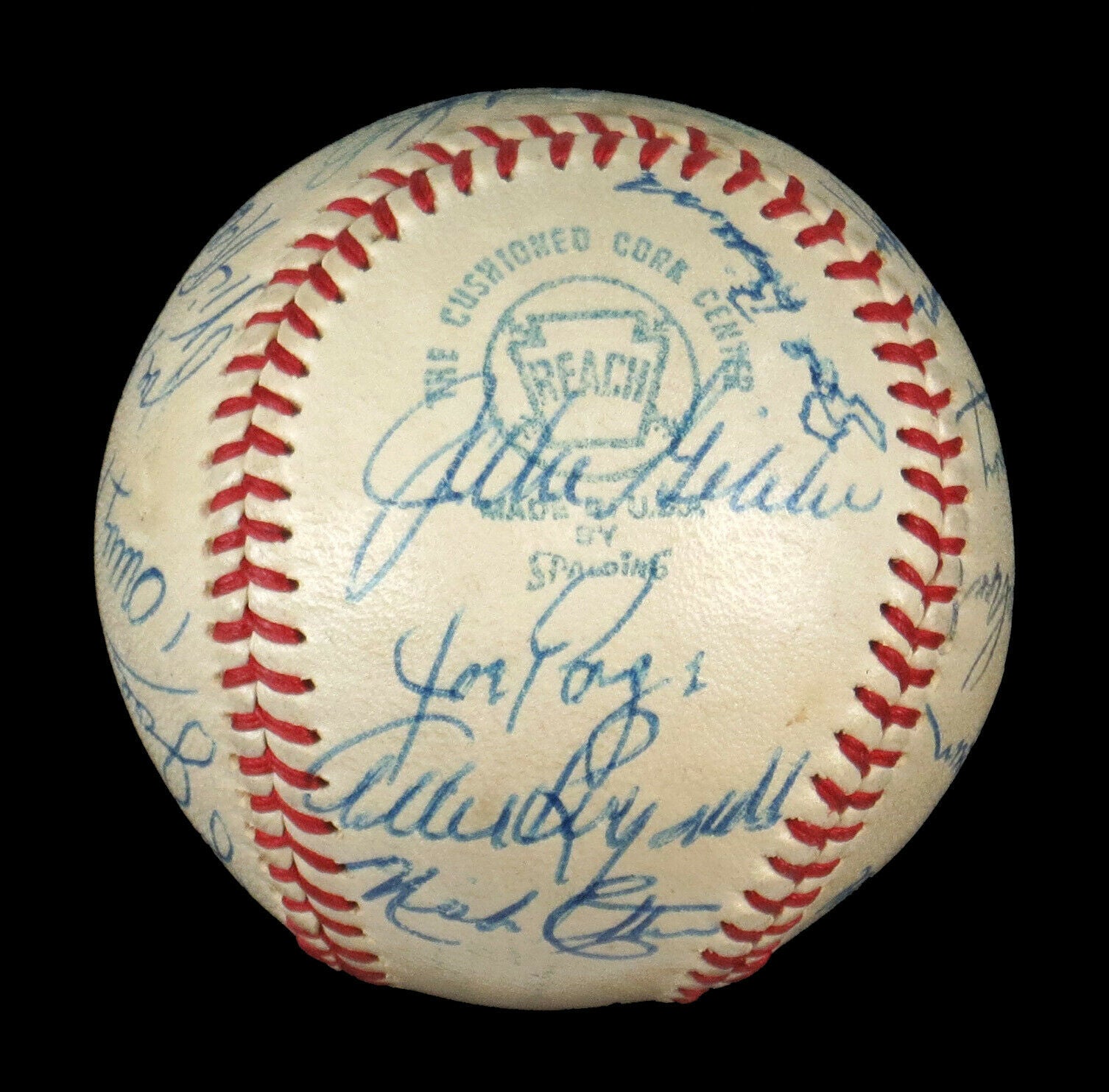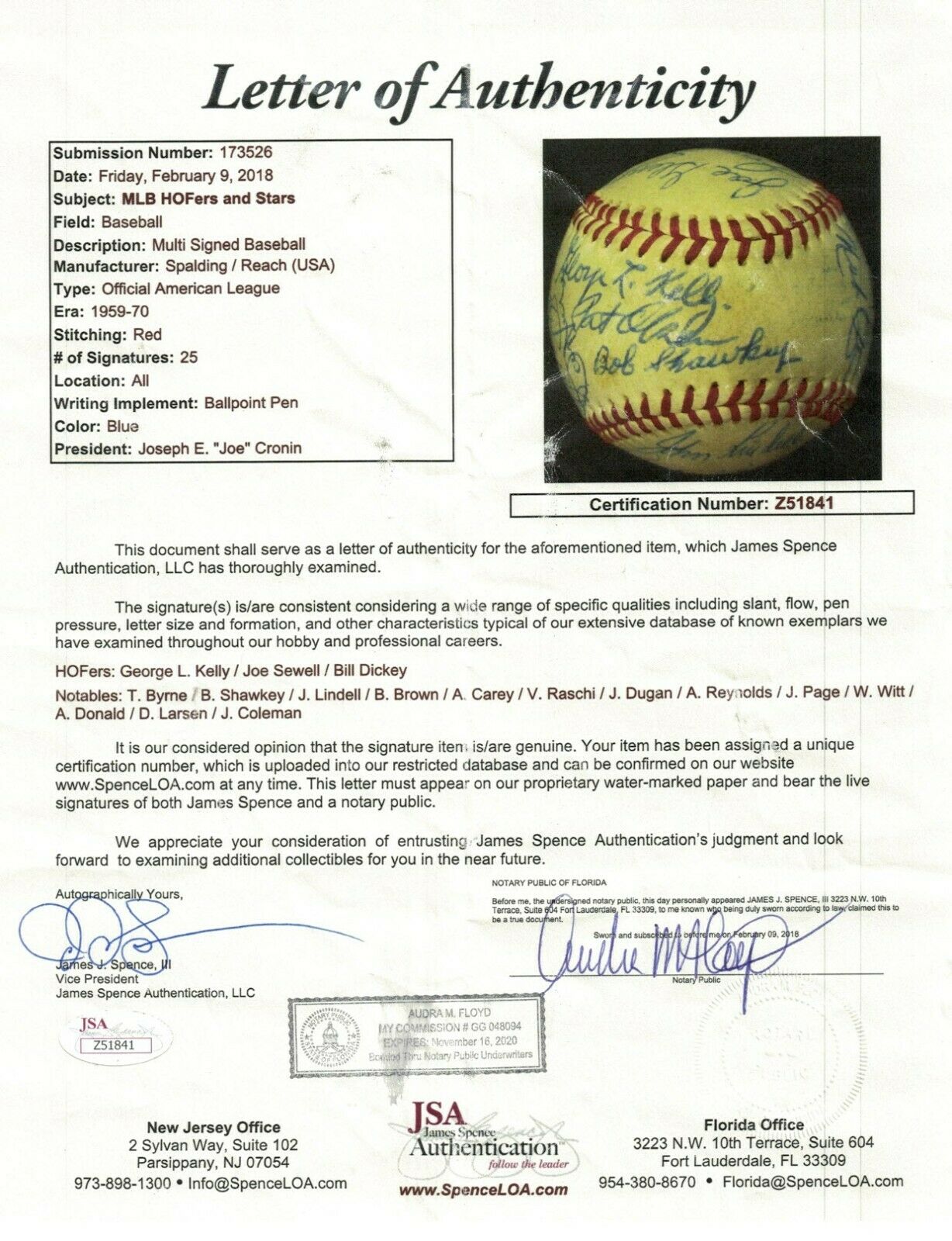 Pretty much a New York Yankees reunion souvenir, this c.1970 Official American League Joe Cronin baseball is adorned with (25) bold autographs. Every identified signer of this baseball is a Yankees alumnus. As you would expect of any item signed by so many "Pinstripers", there are plenty of legends to go around, such as 1927 team member Joe Dugan, HOF catcher Bill Dickey, World Series perfect game hurler Don Larsen, pitching aces Allie Reynolds, Vic Raschi and Bob Shawkey, and the toughest man to strikeout of all-time, HOF infielder Joe Sewell. All this adds up to collectible gem that rings the pride of ownership bell loudly. Full photo LOA from JSA.