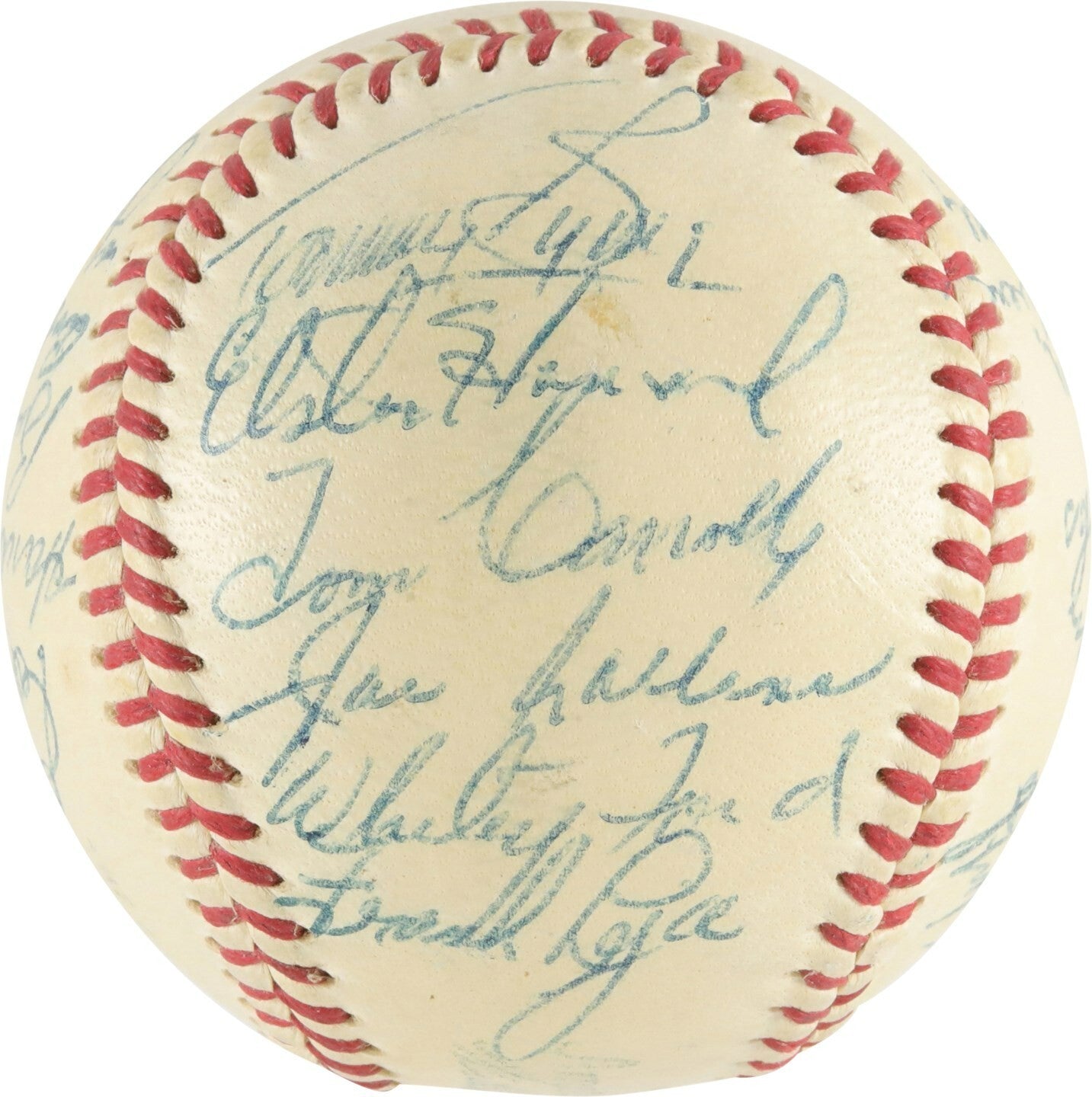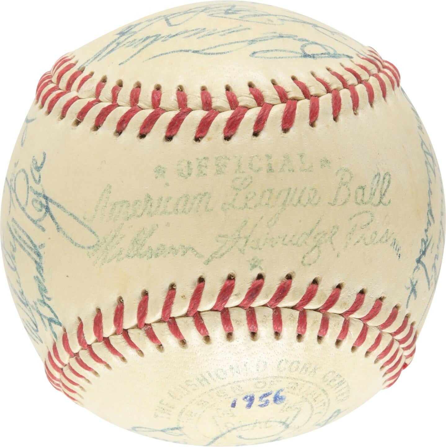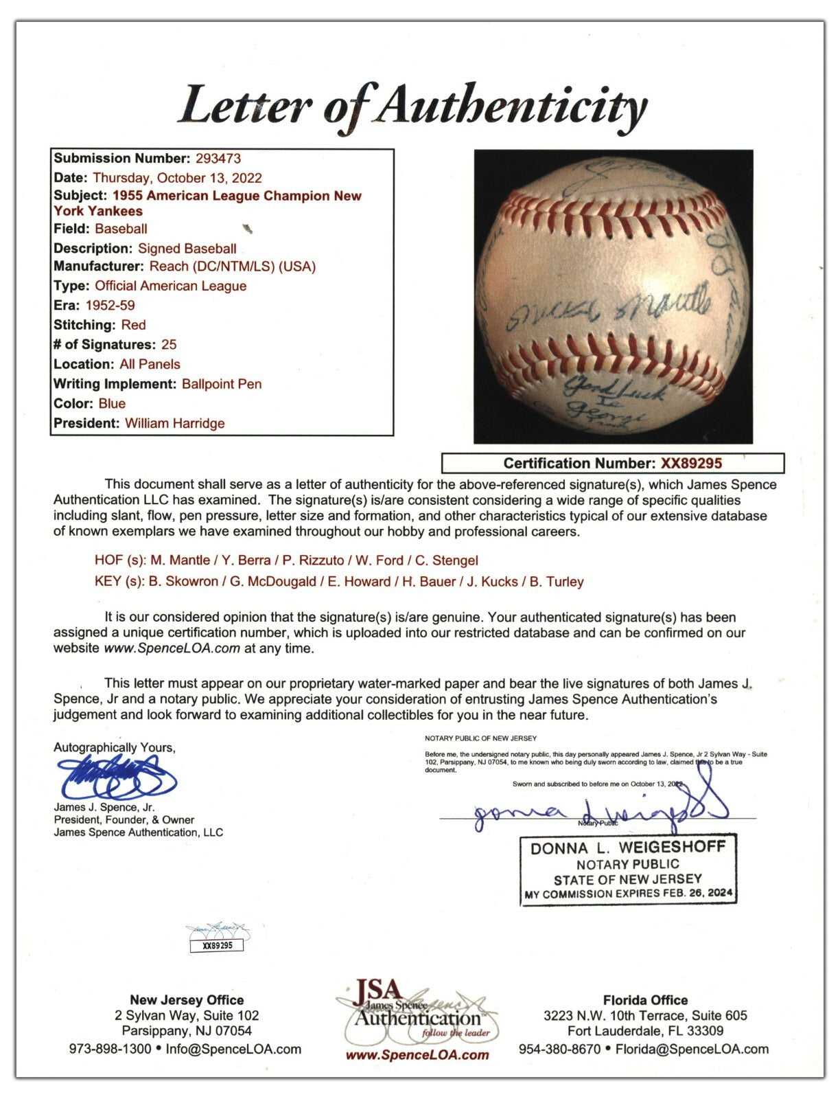 Displayed is a beautiful 1955 New York Yankees American League Championship signed team ball, with twenty-five (25) autos, signed in blue ink from a ballpoint pen. The Yankees had a powerful team. Mantle hit 37 homers, Yogi Berra drove in 108 runs to win the AL MVP, and Whitey Ford went 18-7, with a 2.63 ERA to lead the Yankees to an outstanding 96-58 record in the regular season, but in the World Series, the Brooklyn Dodgers' Johnny Podres, aided by a marvelous catch in left field by Sandy Amoros, shut out the Yankees in Game 7 to win Brooklyn's first, and only, World Series. Hall of Famers - Mickey Mantle (ss), Casey Stengel (manager), Yogi Berra, Phil Rizzuto, and Whitey Ford. Elston Howard, Joe Collins, Ed Lopat, Hank Bauer, Jim Turner (coach), Charlie Silvera, Moose Skowron, John Kucks, Tom Morgan, Bob Turley, Tommy Byrne, Gil McDougald, Bob Cerv, and more. Stengel inscribed "To George" above his signature on south panel. Handwritten "1956" in unknown hand. Reach Official American League Baseball (Harridge) rates excellent to mint condition. The signed baseball comes with a JSA LOA.