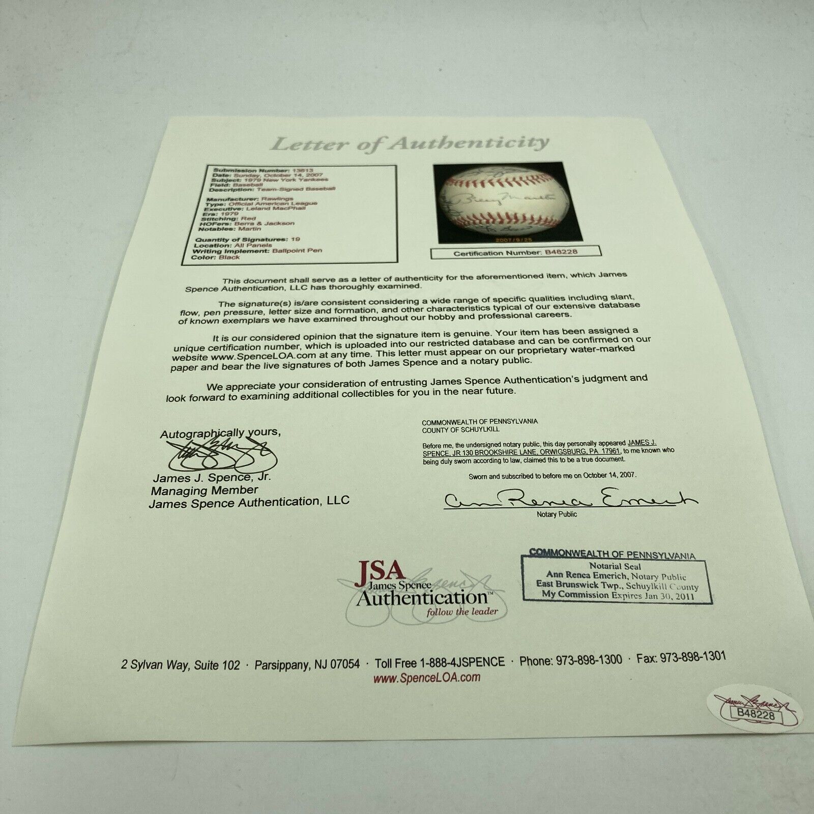 Impressive 1979 New York Yankees team-signed baseball included 19 signatures total. The ball remains in excellent condition with bold autographs and a pearly white surface. Hall of Famer Reggie Jackson penned his signature over the Official American League logo on one of the sweet spots. The opposite sweet spot features Billy Martin's signature in black ink while Yogi Berra signed in the panel to the right of the sweet spot. Overall, a very clean ball featuring many New York Yankees legends. This lot is accompanied by a full LOA from JSA (Cert. #: B48228).