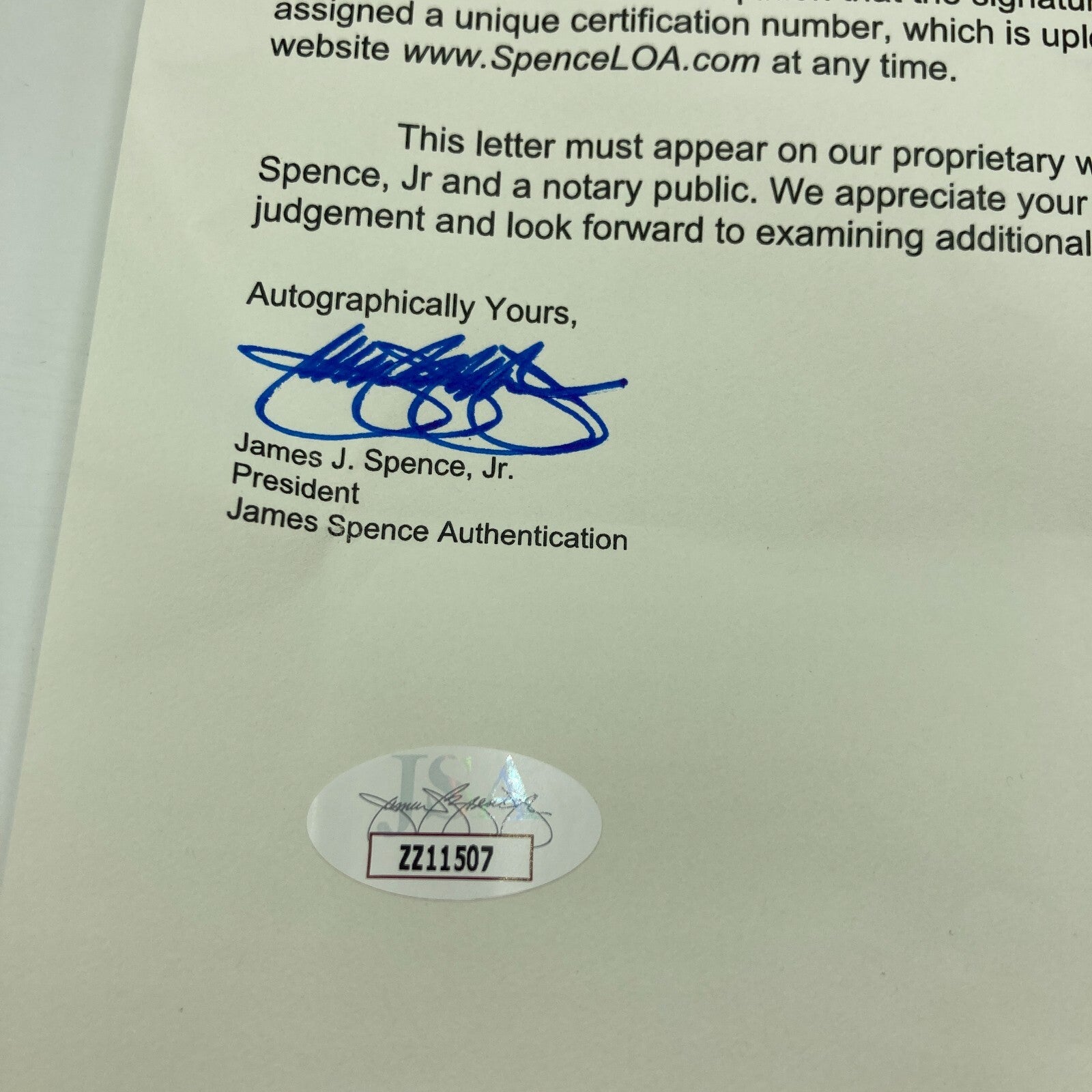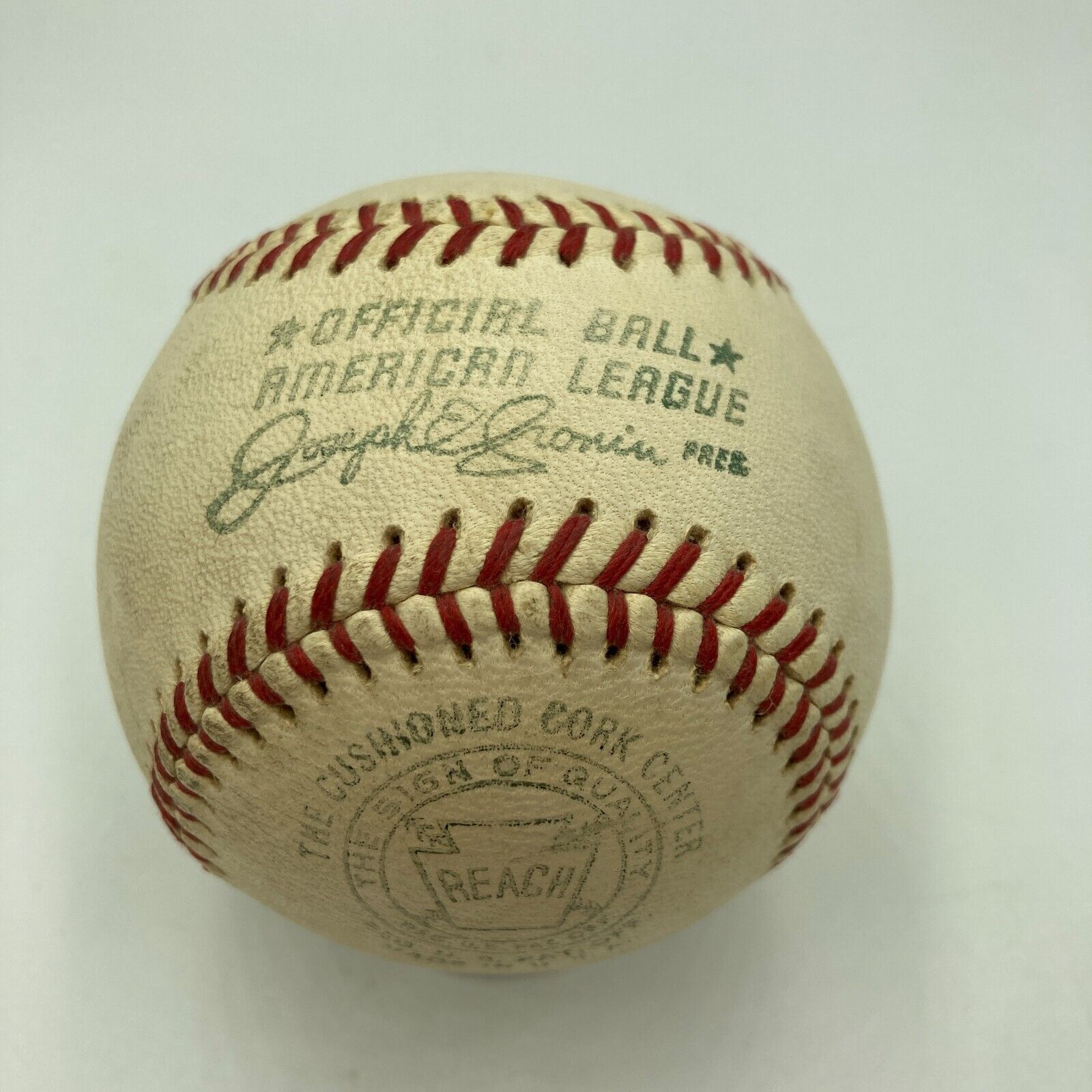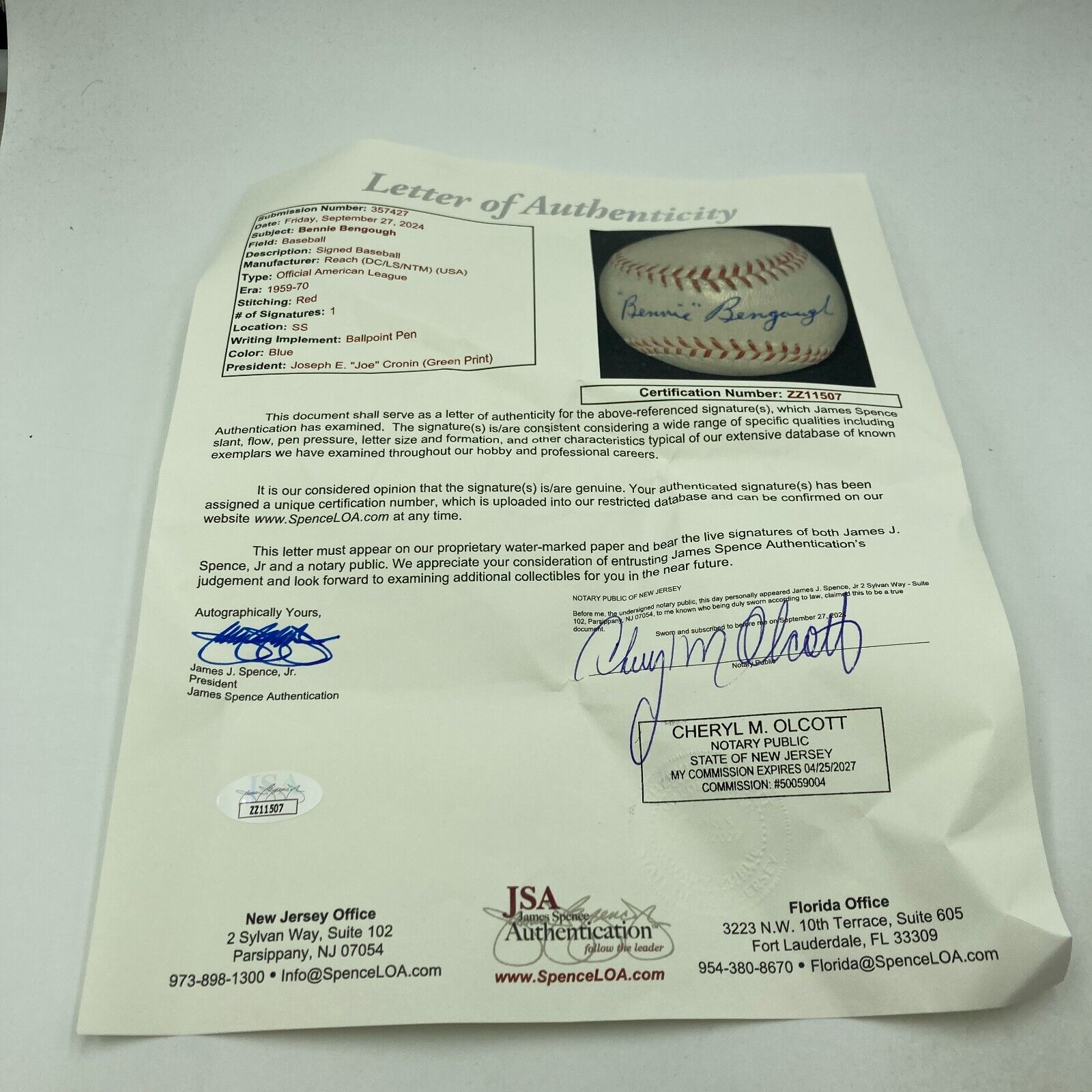 Former New York Yankees catcher Benny Bengough has contributed a flowing blue ink signature (as "Bennie" Bengough) to the sweet spot of this Official American League Joseph E. Cronin baseball. Bengough is best remembered for his tenure with the indomitable "Murderer's Row" Yankees of the 1920s, helping the venerable ballclub win the first three World Series titles in its history. Sadly, Bengough passed away in 1968 at the age of 70. The ball comes with an LOA from JSA for the signature.