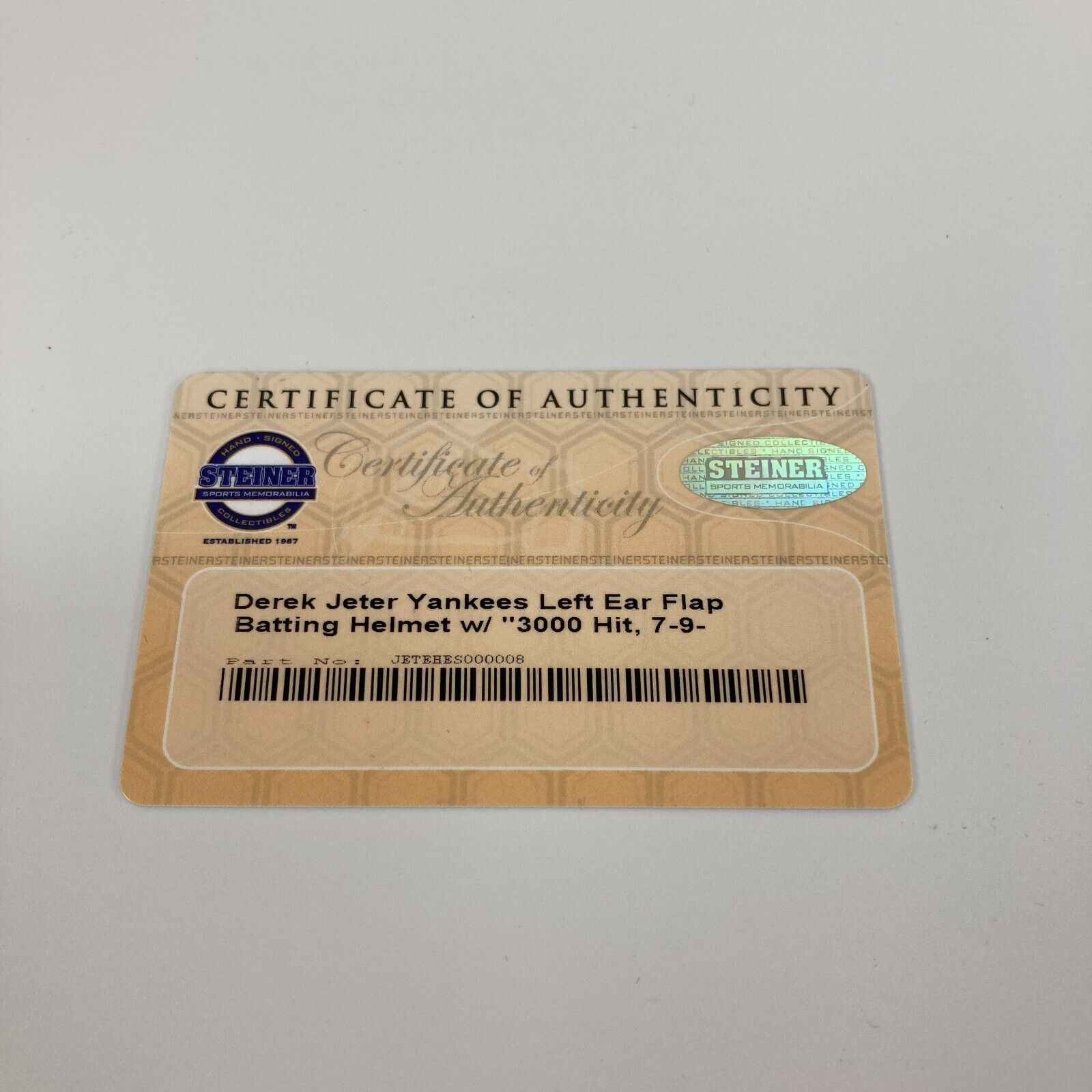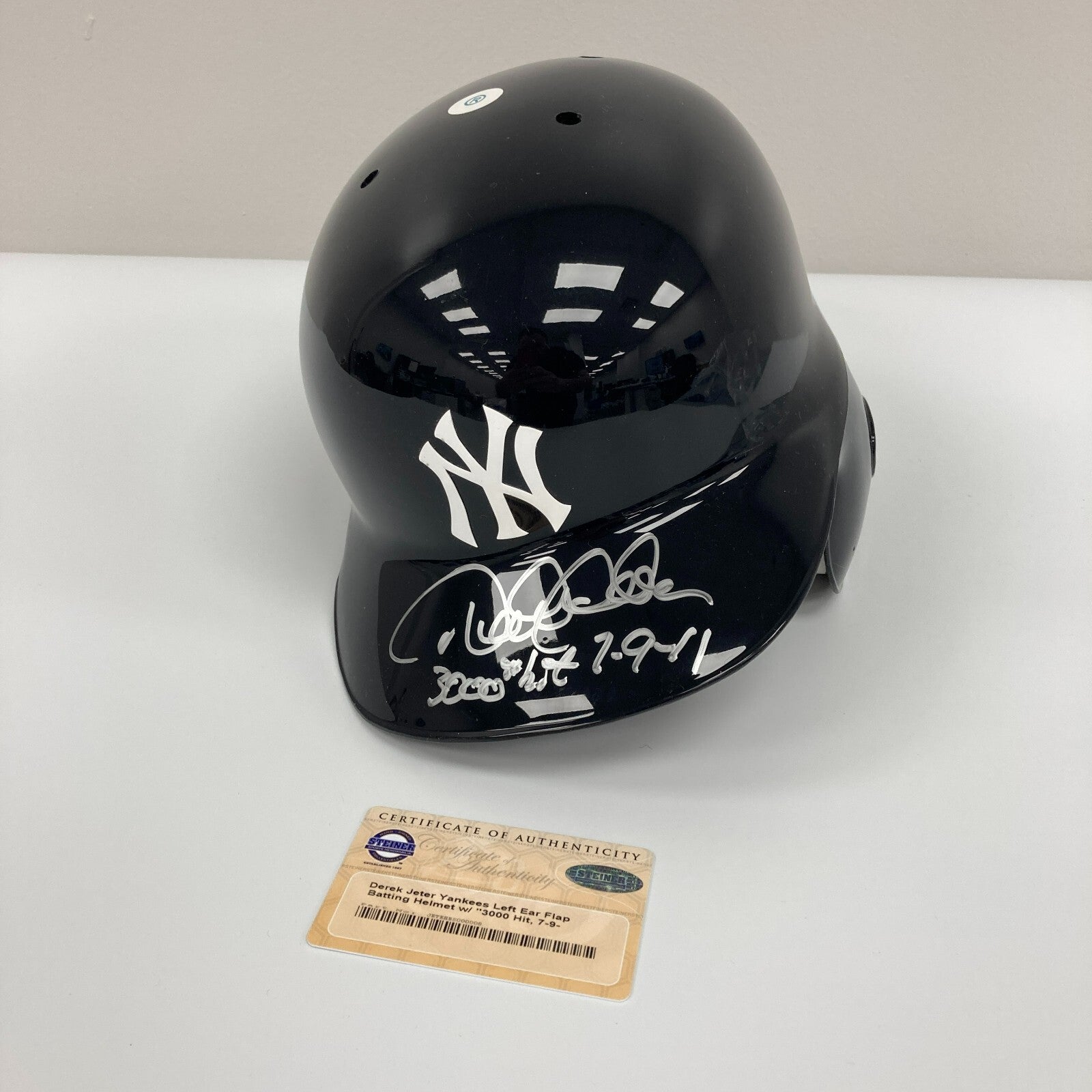 2000's Derek Jeter "3000 Hit" Signed New York Yankees Batting Helmet. Rarely seen issue from the Steiner company, this Yankees batting helmet is signed and inscribed by Derek Jeter. Signed in Mint sharpie, it displays nicely. COA from Steiner.