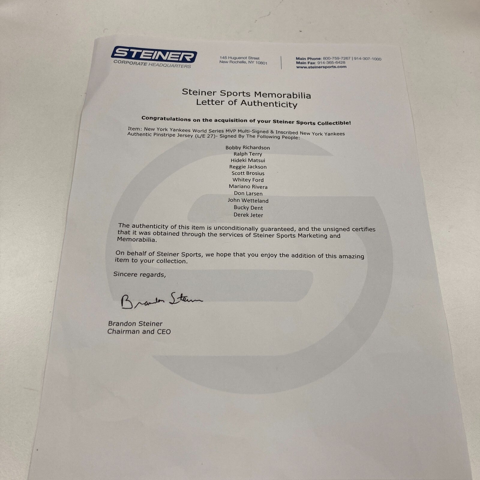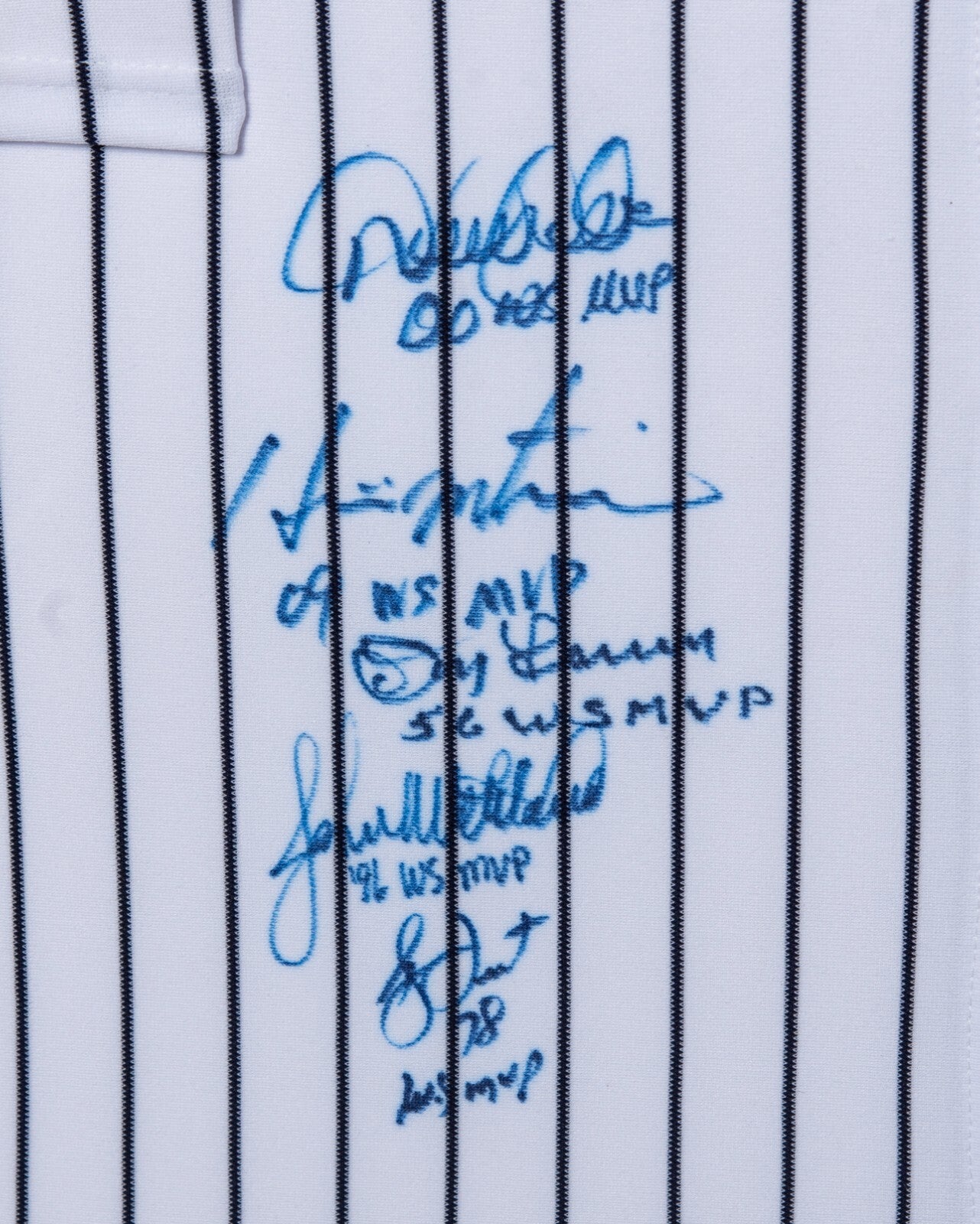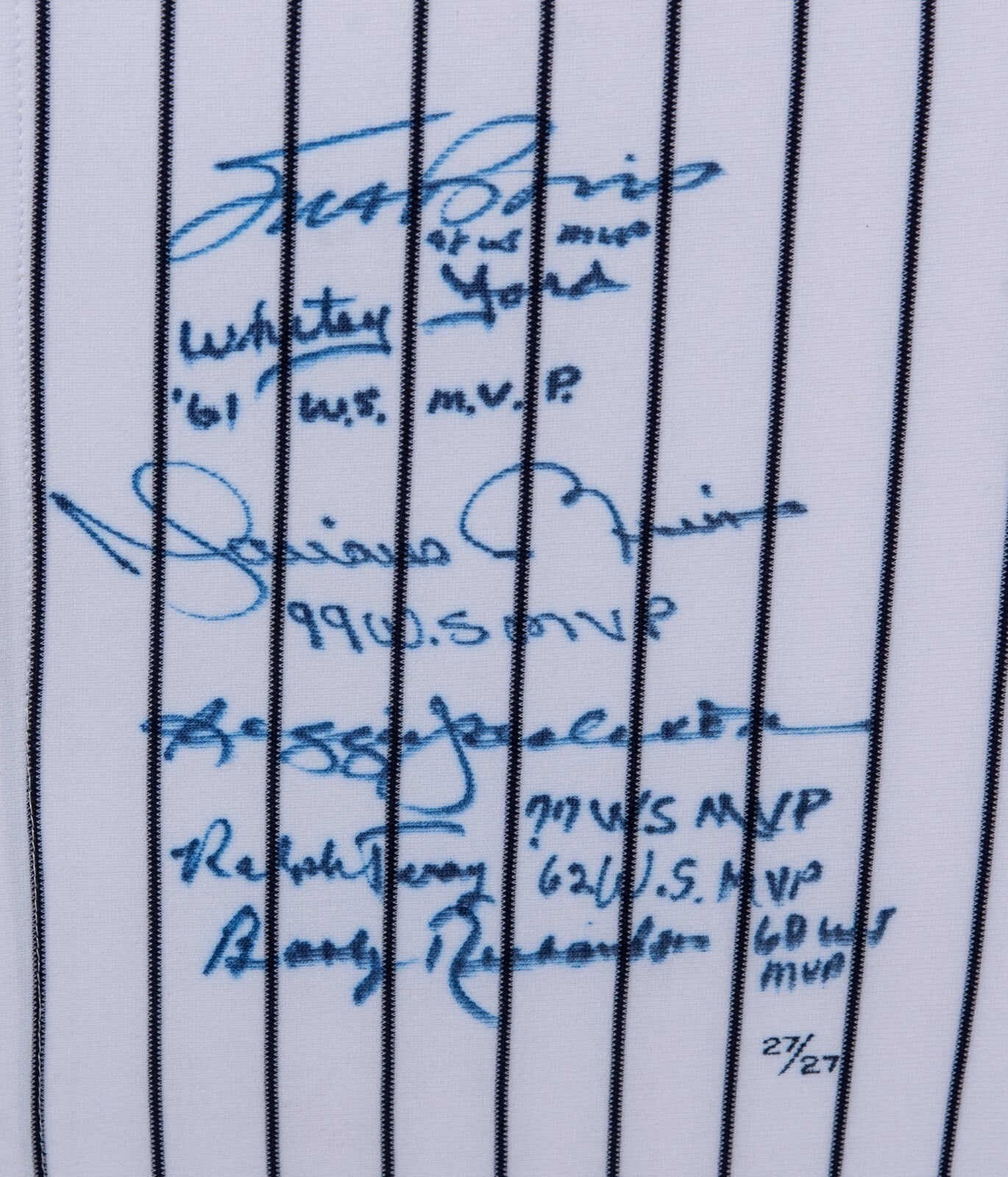 The New York Yankees are synonymous with excellence, as they've captured 27 World Series titles throughout their illustrious history. As such, it should be no surprise that the Yankees count numerous World Series MVP winners in their history books. This Majestic size 44 New York Yankees jersey is signed by 11 Yankee World Series MVPS with a blue marker. The limited edition (#27/27) jersey rests inside a 35-by-42.5-inch frame that contains scratches. A plaque labeled "11 Signatures New York Yankees World Series Most Valuable Players" rests on the bottom center of the piece. The jersey features signatures from Andy Pettitte, who inscribed "00 WS MVP," Scott Brosius, who inscribed "98 WS MVP," Hall of Famer Whitey Ford, who inscribed "W.S. MVP '61," Japanese Baseball Hall of Famer Hideki Matsui, who inscribed "09 WS MVP," Ralph Terry, who inscribed "62 WS MVP," Bobby Richardson, who inscribed "60 WS MVP," Bucky Dent, who inscribed "78 WS MVP," Hall of Famer Derek Jeter, who inscribed "00 WS MVP," John Wetteland, who inscribed "96 WS MVP," Don Larsen, who inscribed "56 WS MVP," Hall of Famer Mariano Rivera, who inscribed "99 W.S. MVP," and Hall of Famer Reggie Jackson, who inscribed "77 WS MVP." The jersey comes with an MLB Authenticated hologram (HZ941909) for the signatures and an LOA from Steiner for the signatures and inscriptions.