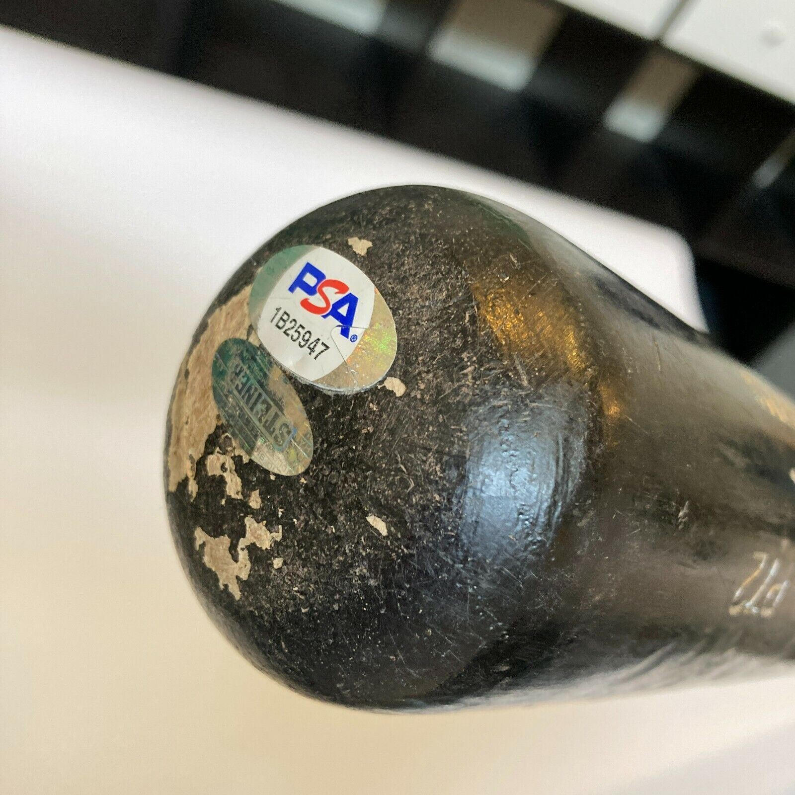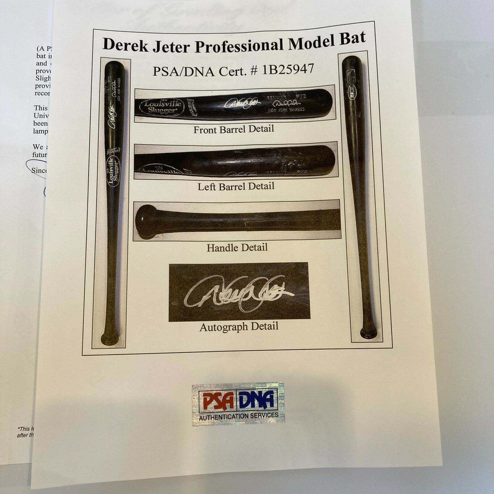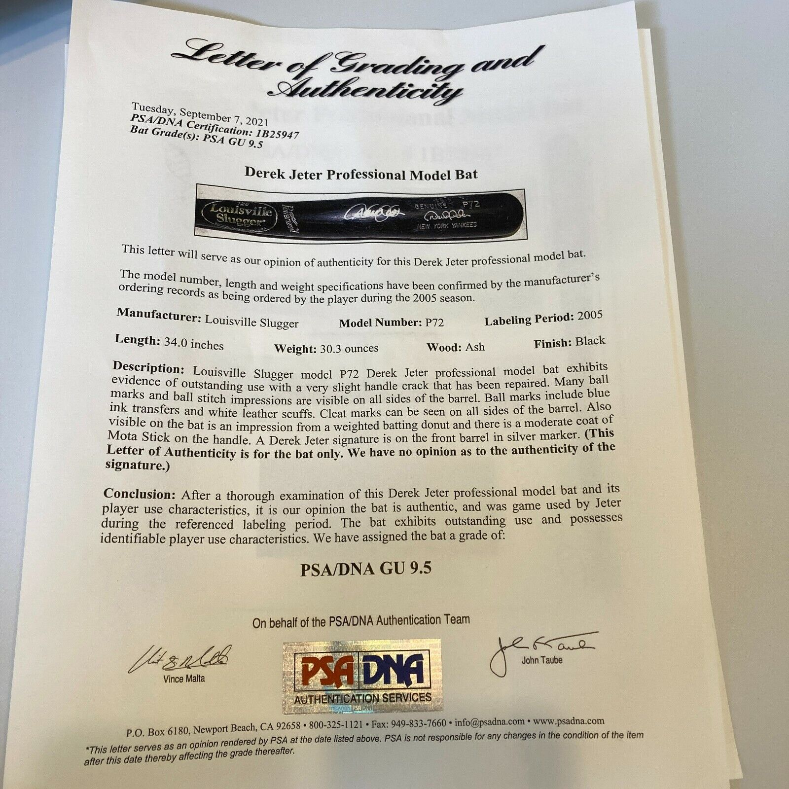 Exceptional 2005 Derek Jeter game used bat, graded GU 9.5 by PSA. Louisville Slugger model P72 measures 34.0 inches and weighs 30.3 ounces with outstanding use shown, including a repaired slight handle crack. Barrel displays ball marks and stitch impressions, blue ink transfers, cleat marks, donut impression, and moderate coat of Mota stick on the handle. The Captain has boldly signed in silver Sharpie between the trademark and barrel stamp. With five World Series titles under his belt among countless other accolades, Jeter received the highest vote percentage for a position player in his first Hall of Fame balloting, receiving all but one of a possible 397 votes. Comes with full letter PSA DNA COA.