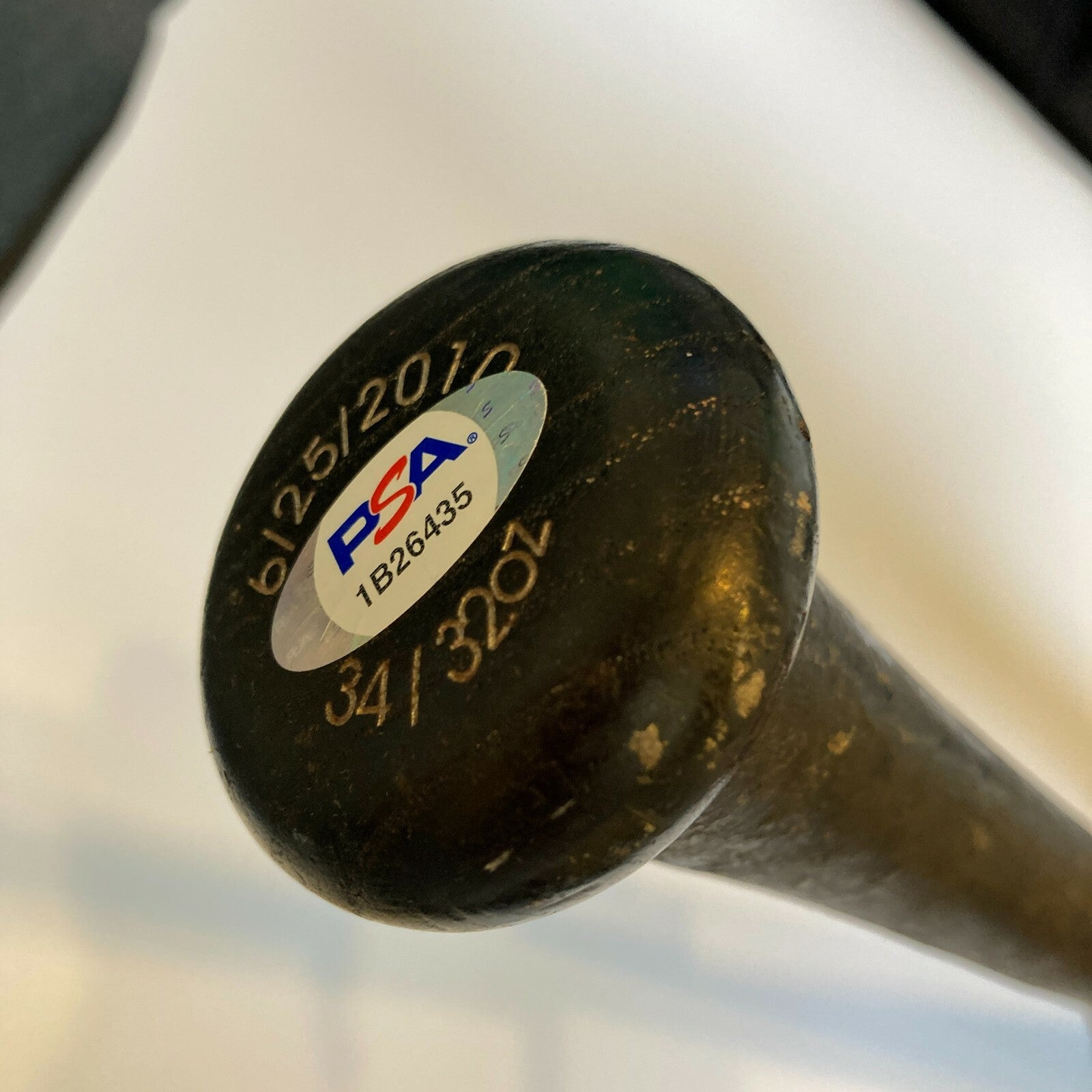 Exceptional 2010 Derek Jeter bat shows great game use with ball and stitch impressions across the barrel. Slight handle crack with nice Mota stick residue on handle. Measures 34.25 inches and weighs 32 oz, with production date 6/25/2010 and length/weight of 34/32oz stamped on knob. Nice game used bat from the man who more than earned his place among the greatness of New York Yankees history (PSA 9.5 LOA). Comes with full letter COA from PSA DNA.