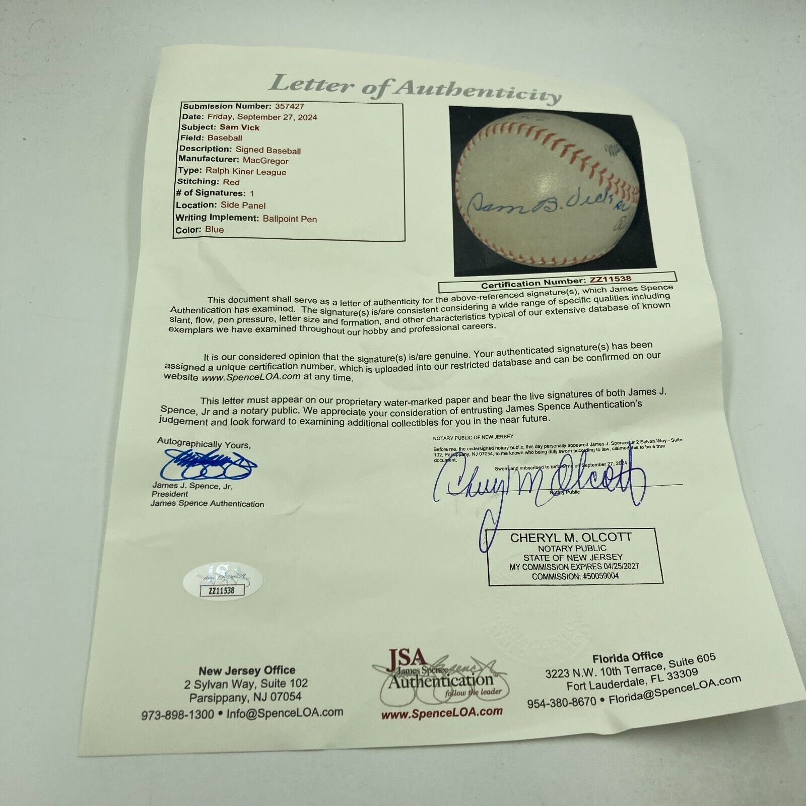Presented is a rare baseball signed by former New York Yankees and Boston Red Sox outfielder Sam Vick. Vick has penned his flowing signature in blue ink across the panel of the baseball adjacent to the official Ralph Kiner league stamp. The baseball comes with an LOA from JSA for signature.
