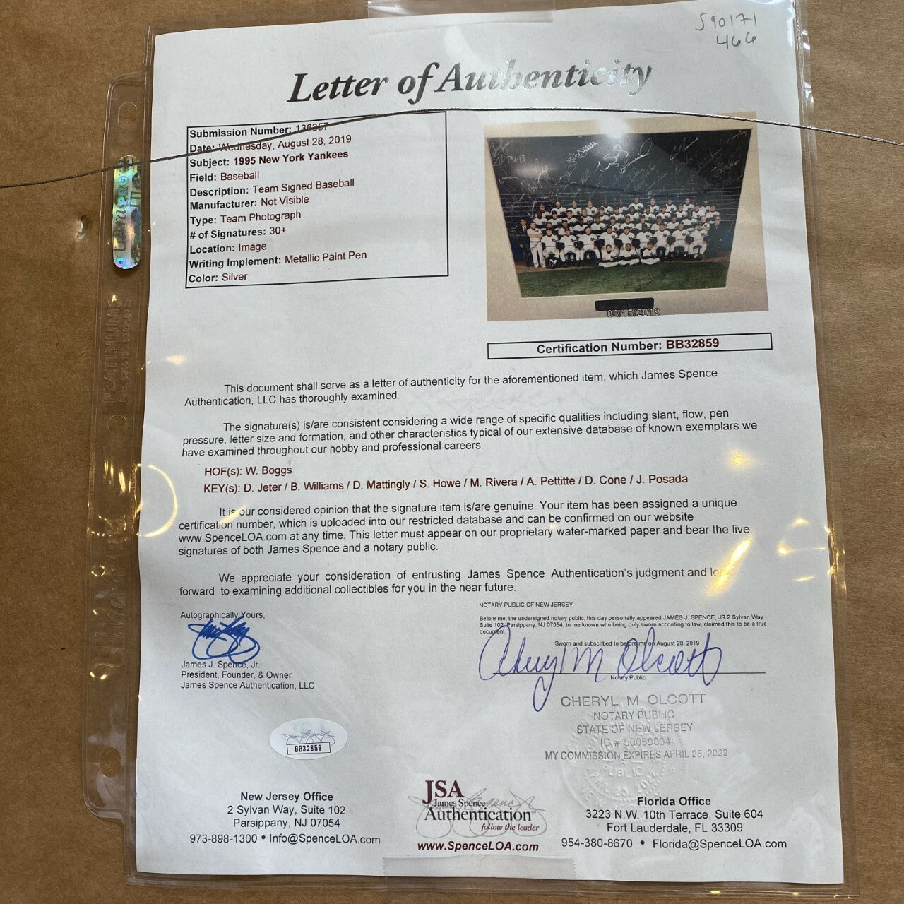 Gorgeous and rare piece, high quality team photos of the 1995 Yankees hardly ever come to market.This is the only Yankee team to pair legends Don Mattingly and Derek Jeter. The offered lot is a wonderful 11x14 color team photo. This is signed in uniformly superb and very neat silver sharpie ink, the autographs display beautifully. Keys include a Rookie Jeter, Mattingly, a rookie Mariano Rivera, Bernie Williams, Cone, O'Neill, Pettite, Boggs, Posada and many others. This is the first team with the famed Core Four, all are beautifully signed on this image. This is so much scarcer than the 1996 to the present Yankee team photos. Comes with full letter COA from JSA.