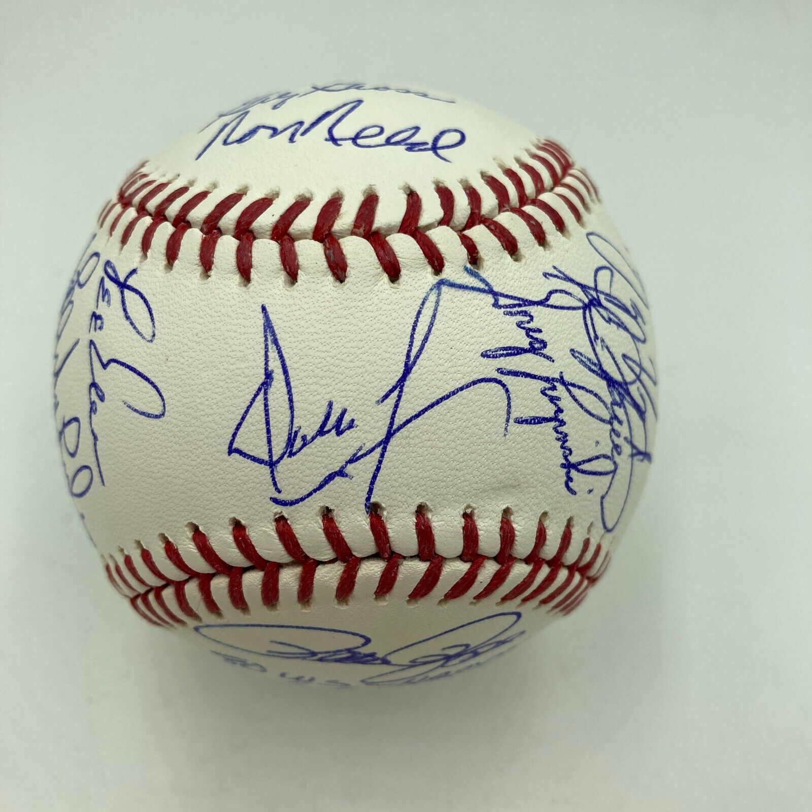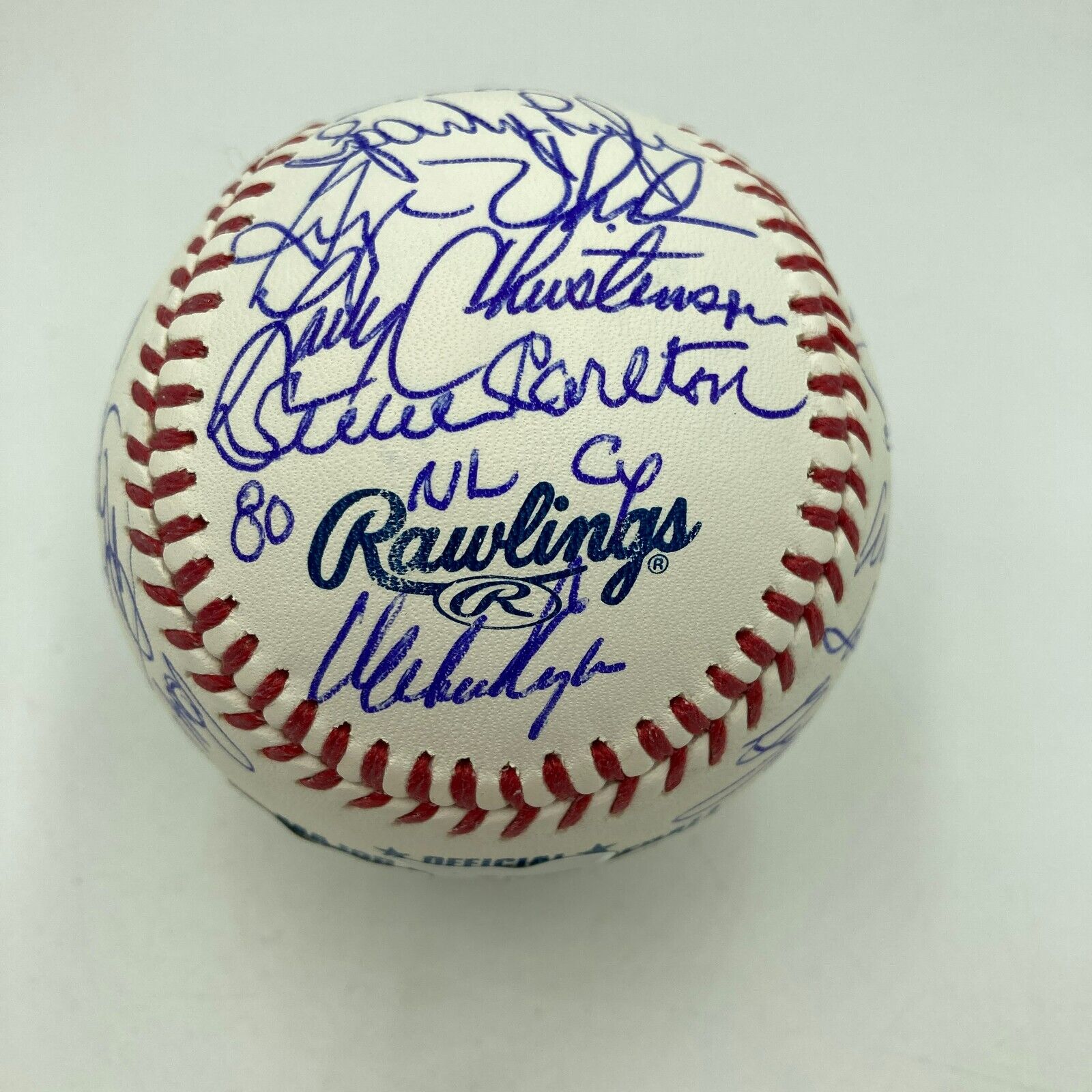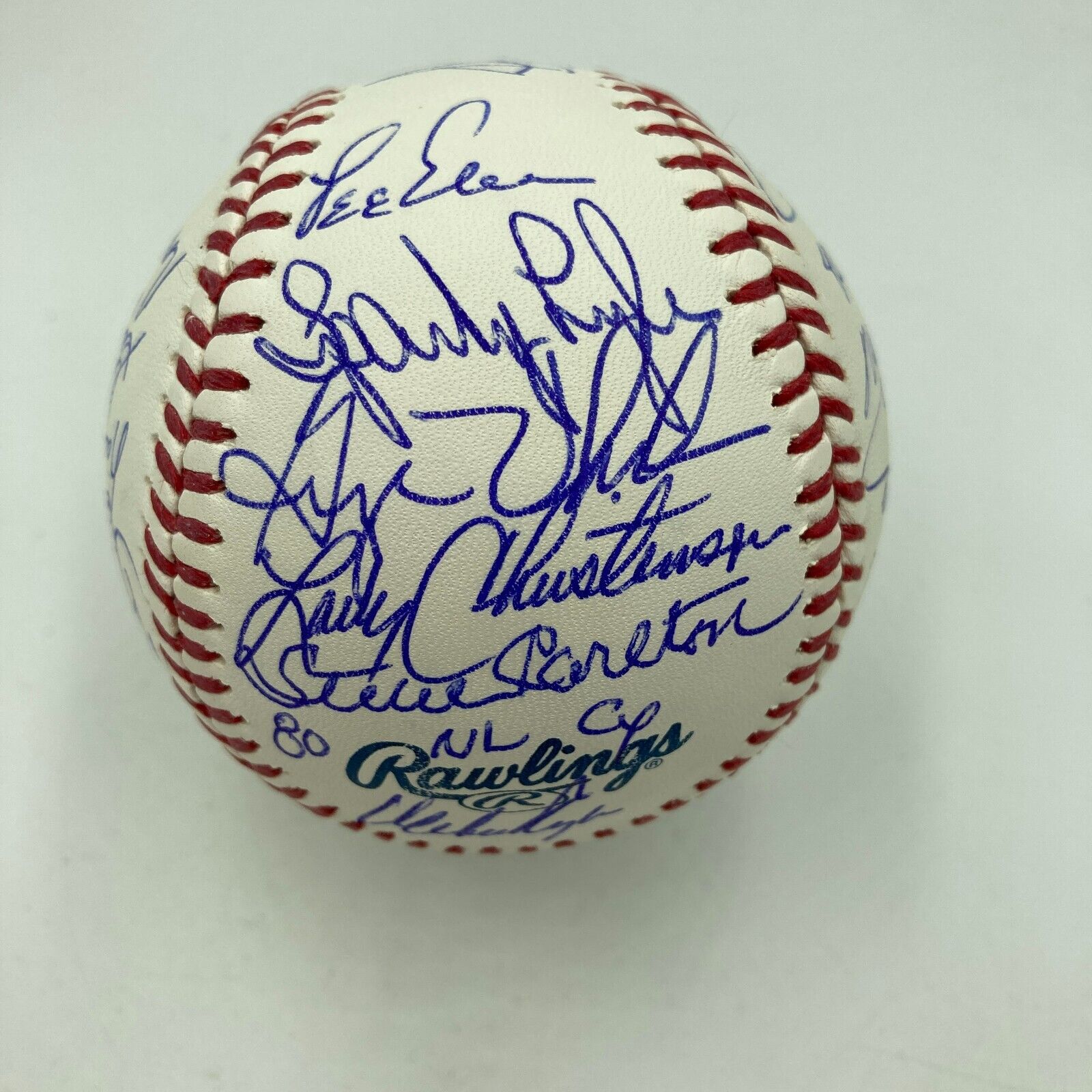 High grade 1980 Philadelphia Phillies World Series Champions team signed reunion baseball . Rawlings B.Selig OML ball has been signed by (24) incl. Mike Schmidt, Steve Carlton, Dallas Green, Larry Bowa, Bake McBride, Bob Boone, Greg Luzinski, Sparky Lyle, Pete Rose, Bob Boone, and others. Schmidt, Carlton, and Rose have each added a season related inscription. Fanatics & MLB Authenticated Holograms.