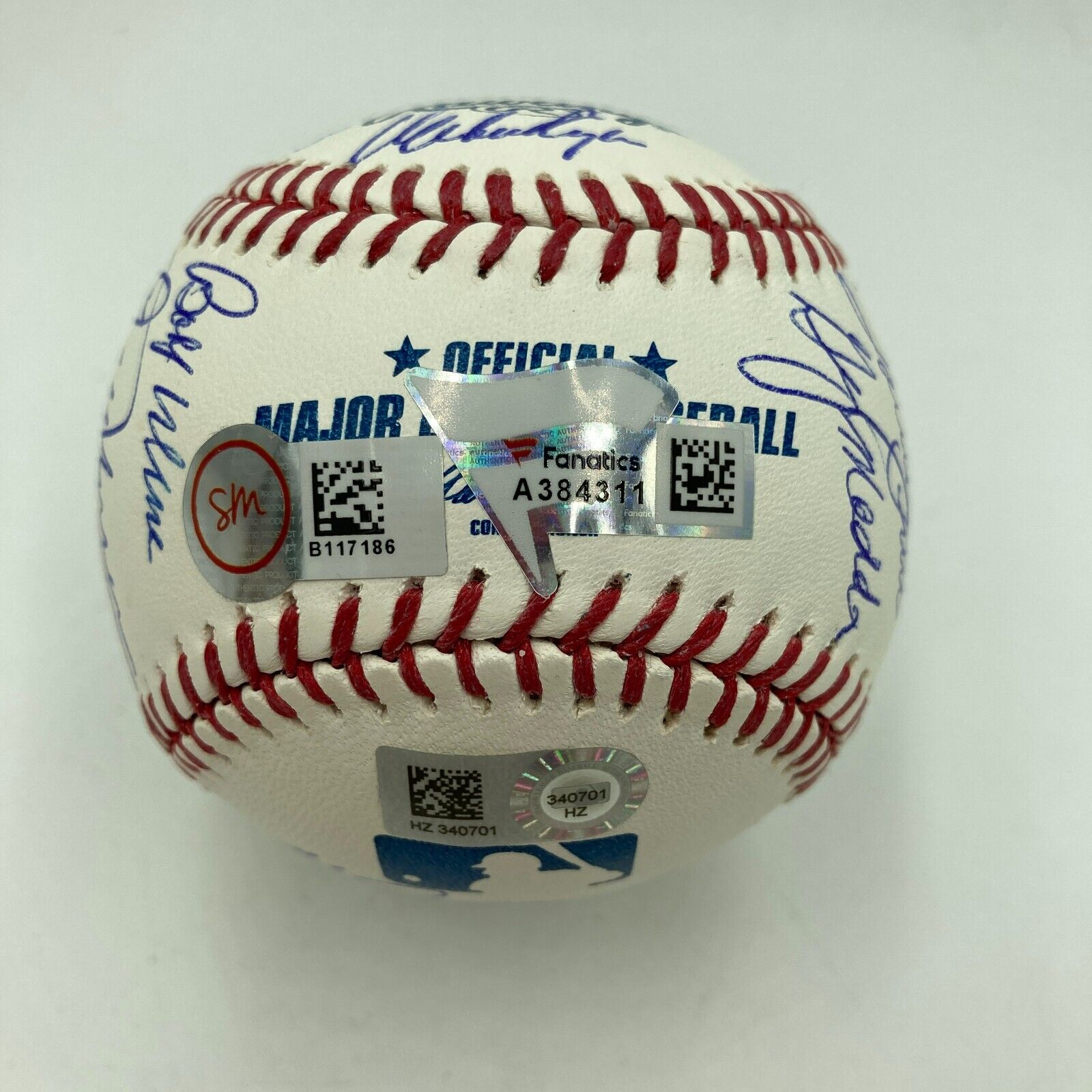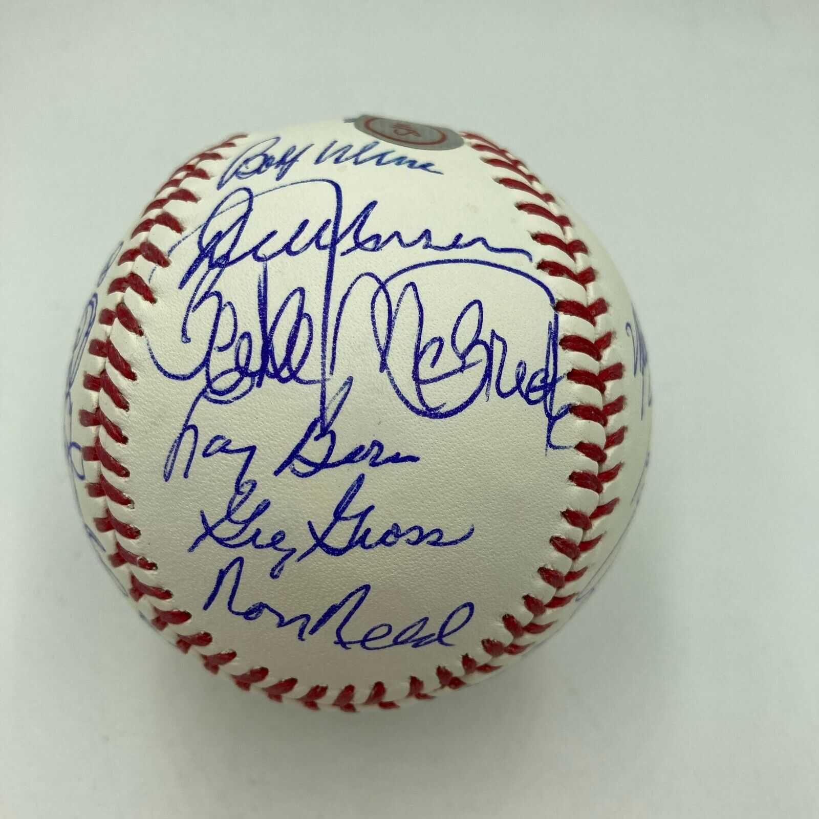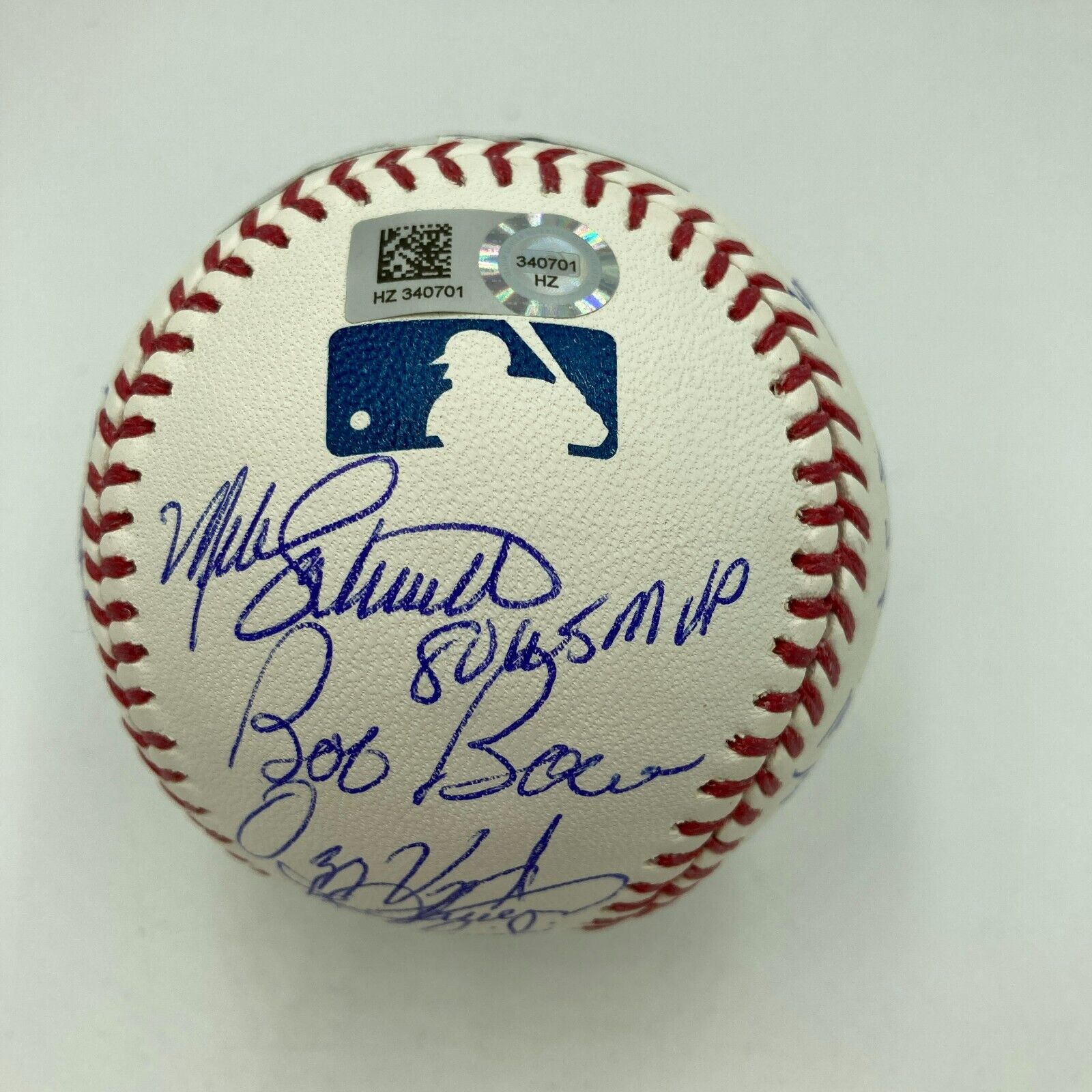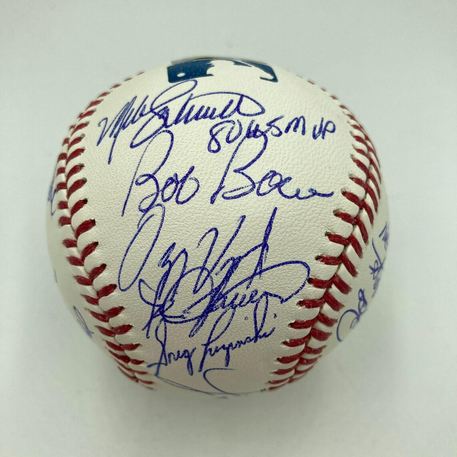 High grade 1980 Philadelphia Phillies World Series Champions team signed reunion baseball . Rawlings B.Selig OML ball has been signed by (24) incl. Mike Schmidt, Steve Carlton, Dallas Green, Larry Bowa, Bake McBride, Bob Boone, Greg Luzinski, Sparky Lyle, Pete Rose, Bob Boone, and others. Schmidt, Carlton, and Rose have each added a season related inscription. Fanatics & MLB Authenticated Holograms.