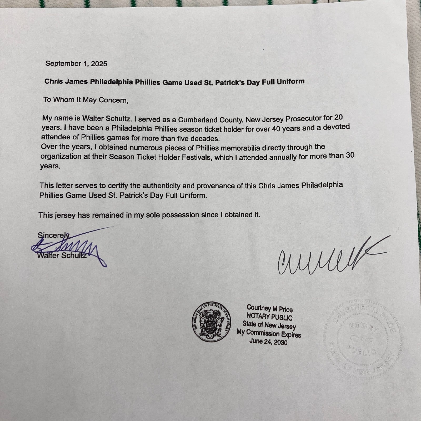 Comes with full letter COA from MEARS and signed and notarized Letter Of Provenance from the original Owner who got it directly from the Phillies.
