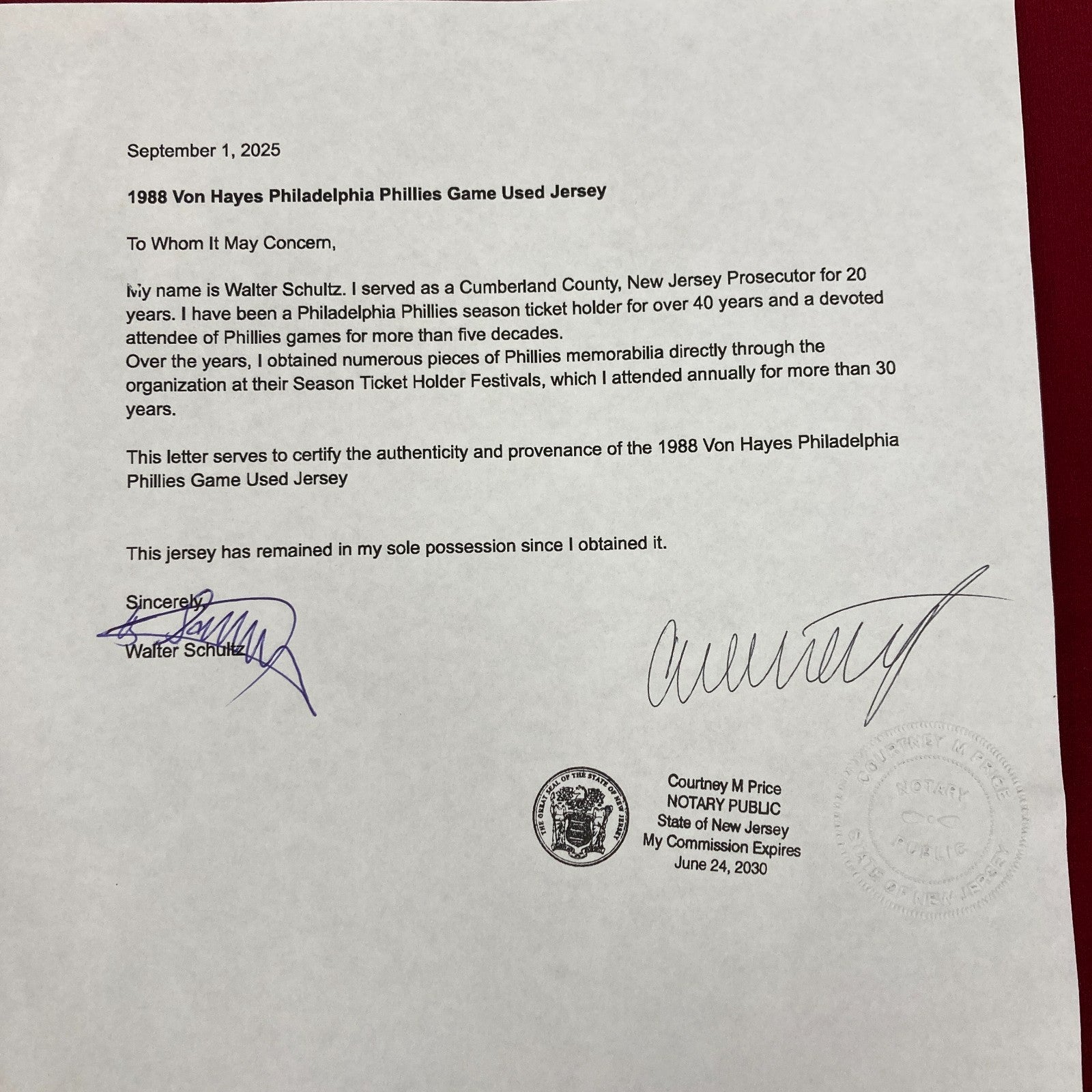 Comes with full letter COA from MEARS and signed and notarized Letter Of Provenance from the original Owner who got it directly from the Phillies.
