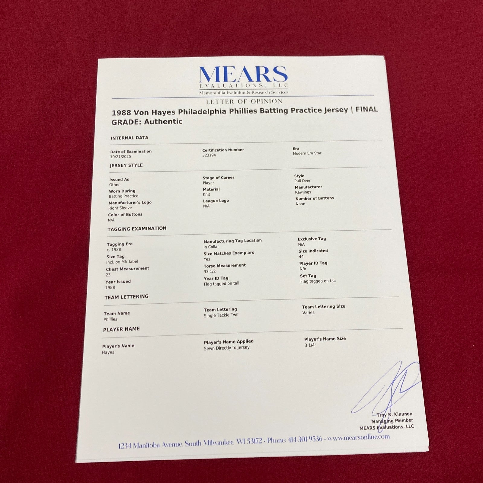 Von Hayes 1988 Game Used Philadelphia Phillies Jersey Uniform MEARS COA. Comes with Batting Practice Jersey and two pairs of pants.