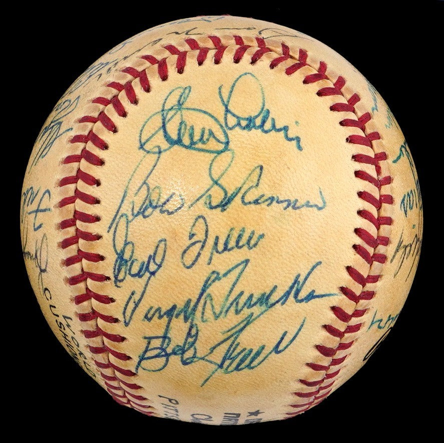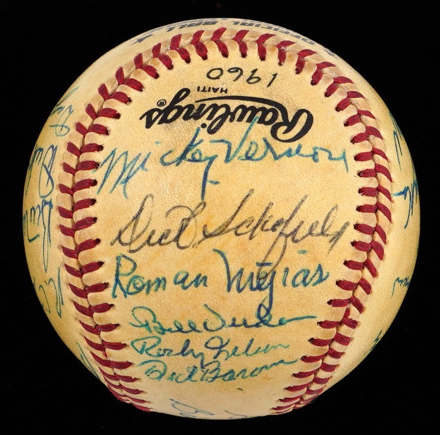 (23) members of the immortal 1960 World Champion Pittsburgh Pirates team signed this creamy toned ONL/Feeney baseball at a 1970s reunion. Signatures include the hero of that World Series, Bill Mazeroski (HOF), as well as Dick Groat, Dick Schofield, Bob Friend, Mickey Vernon, Elroy Face, Al Smith and others.