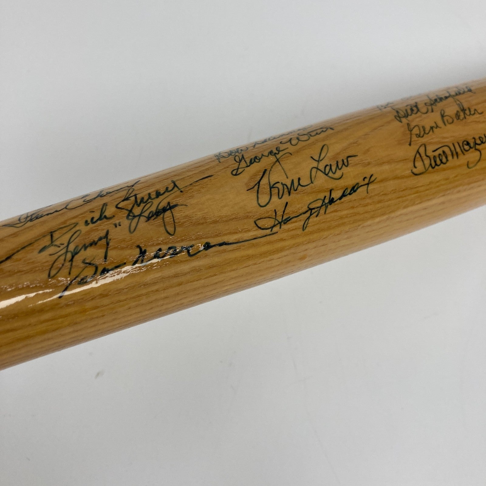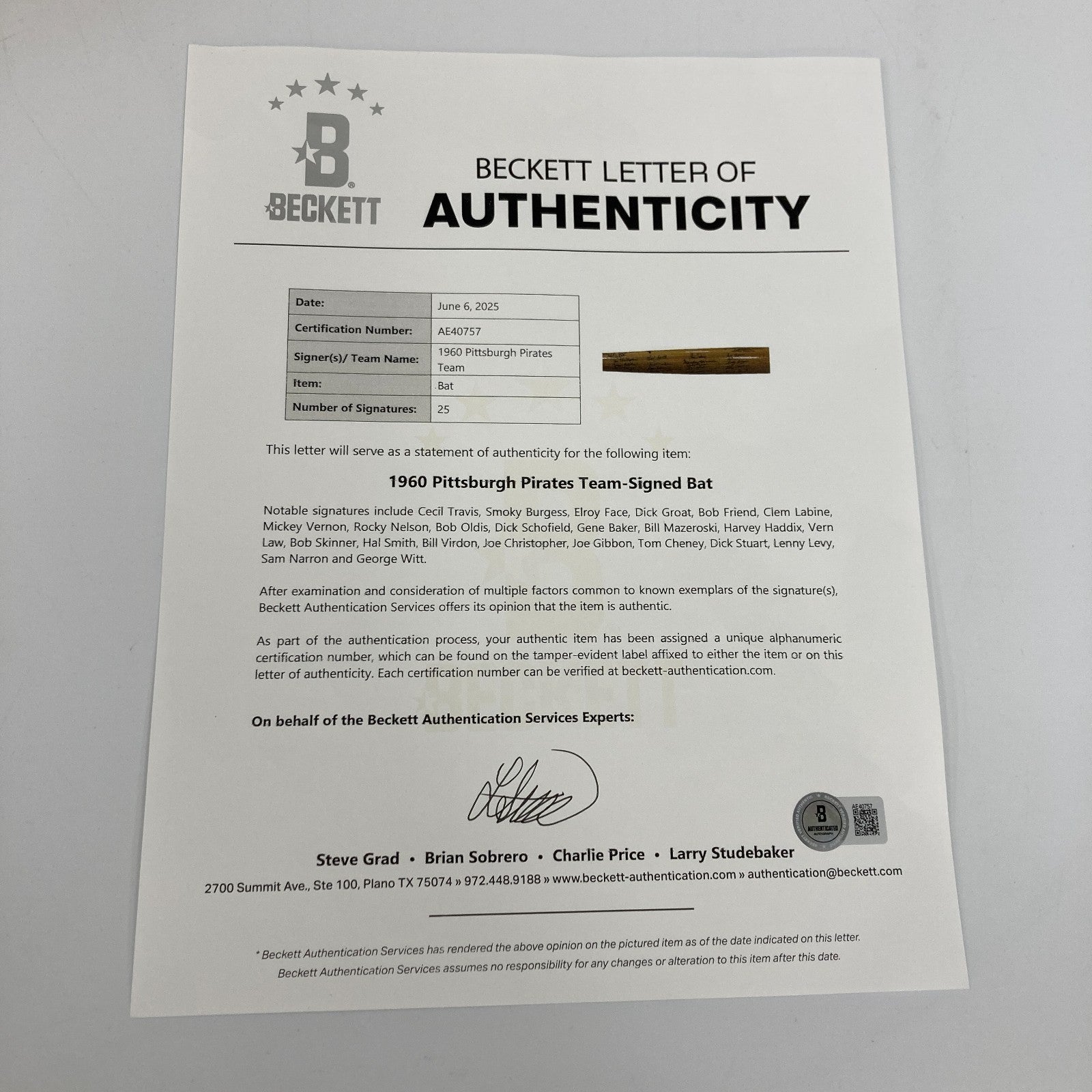 Offered is a 1960 World Series Champion Pittsburgh Pirates commemorative Adirondack bat, signed by 25 members of the 1960 Pittsburgh Pirates in black marker. Key signatures include those of Hall of Famer Bill Mazeroski, Smoky Burgess, Elroy Face, Dick Groat, Bob Friend, Clem Labine, Mickey Vernon, Rocky Nelson, Bob Oldis, Dick Schofield, Gene Baker, Harvey Haddix, Vern Law, Bob Skinner, Earl Francis, Fred Green, Hal Smith, Bill Virdon, Joe Christopher, Joe Gibbon, Tom Cheney, Dick Stuart, Lenny Levy, Sam Narron, and George Witt. Accompanied by an LOA from Beckett for the signatures.