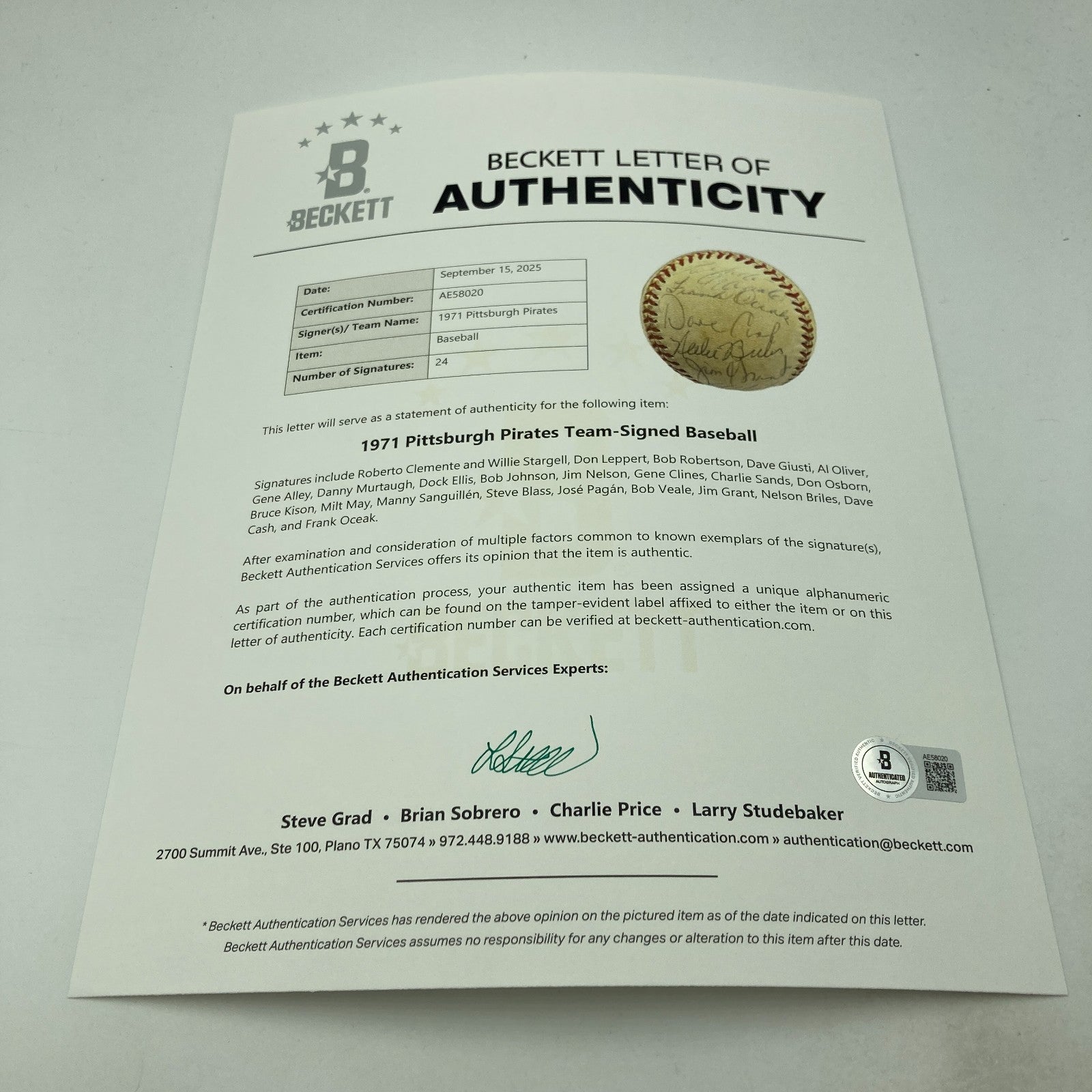 The offered Official National League (Feeney) ball is signed by twenty-four members of that championship outfit in ballpoint ink. Autographs average 7/10 with some dipping just slightly. Included are: Roberto Clemente, Oceak, Cash, Briles, Grant, Veale, Pagan, Blass, Sanguillen, May, Stargell, Kison, Osborn, Robertson, Giusti, Oliver, Murtaugh, Ellis, Bob Johnson, Nelson, Clines, Sands and more. All signatures are authentic. There are NO clubhouse signatures. Full LOA from Beckett Authentication Services.