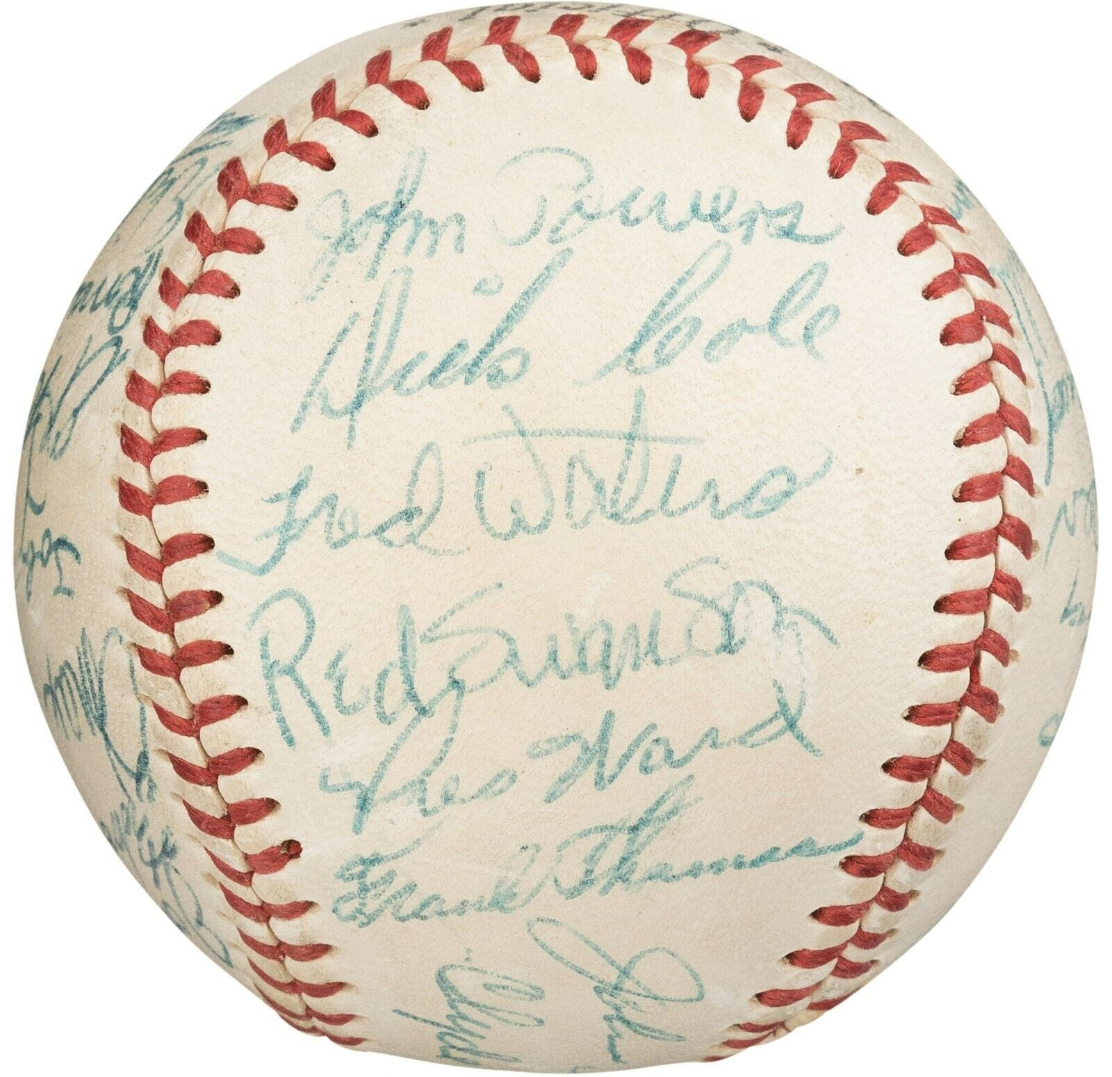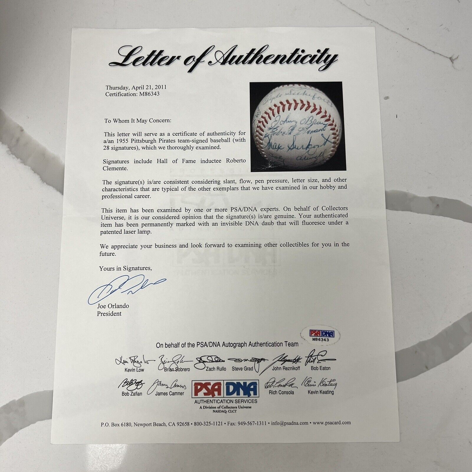 Official National League (Giles) sphere is signed by twenty-eight, including Clemente, Face, Friend, Law, Groat, Thomas, Shepard, E. O'Brien, J. O'Brien, Haney, Sukeforth and others. The ball has aged to a very light cream color and the league stamping is very bold. Meanwhile, the blue ink autographs are strong. Full LOA from PSA/DNA.