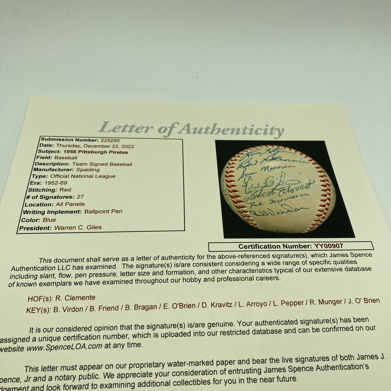 Official National League baseball (Giles) signed in blue ink by the following 27 members of the 1956 Pittsburgh Pirates: Clemente, Bragan (Mgr., sweet spot), E. O'Brien, Kravitz, Walls, Skinner, King, Swanson, Friend, Shepard, Freese, Law, Virdon, Cole, Foiles, Kline, Face, Roberts, Munger, McMahan, Thomas, Arroyo, J. O'Brien, Hall, Long, Narron (coach), and Pepper. The signatures are boldly scripted. The ball is in Near Mint condition.