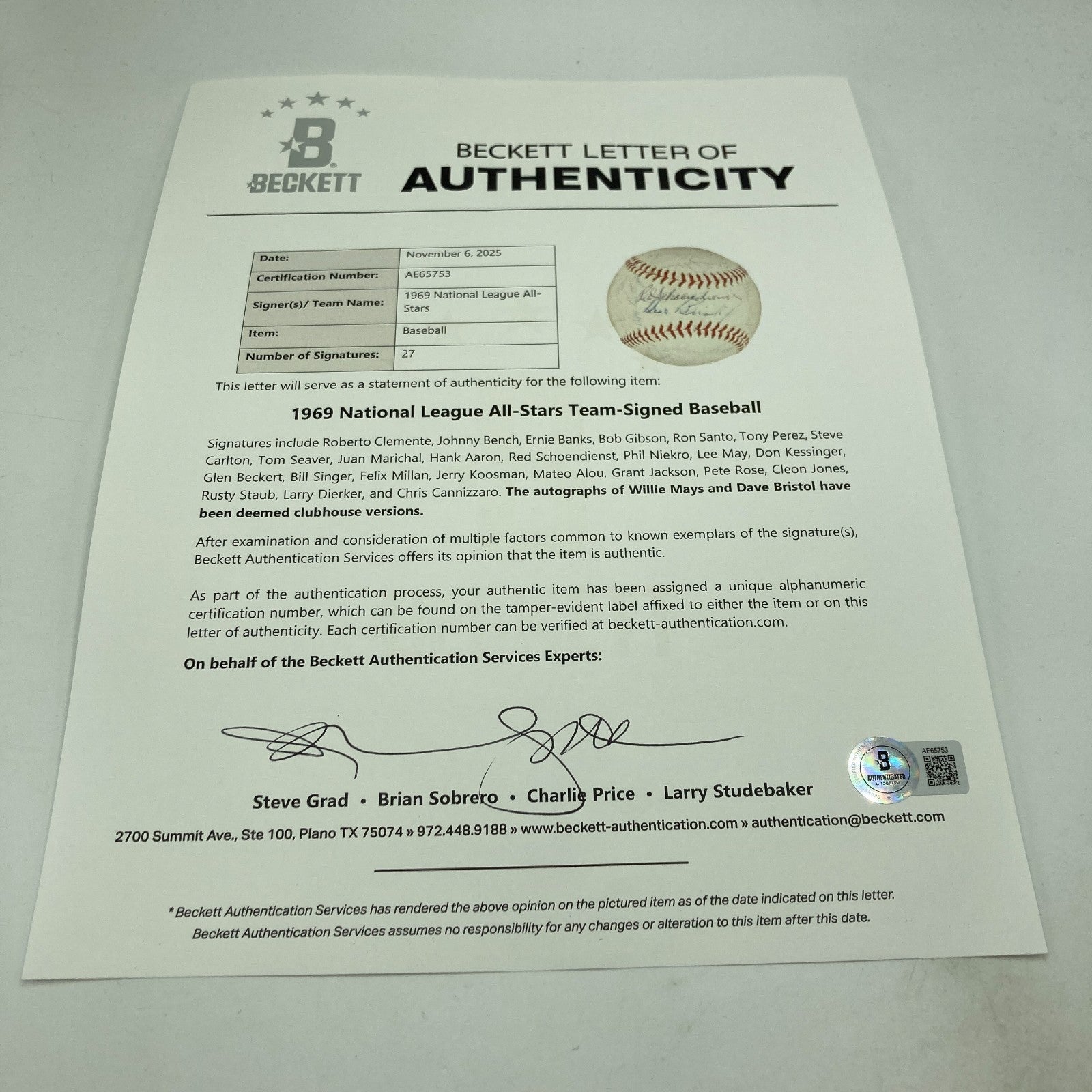 This Official National League (Giles) ball is signed by twenty-seven in ballpoint ink. Included are: Bench, May, Kessinger, Marichal, Hank Aaron, Milan, Roberto Clemente, Singer, Beckert, Schoendienst, Staub, Seaver, Carlton, Perez, Rose, Santo, Banks, Cannizzaro, Dierker, Mays (clubhouse), Bristol (clubhouse) and more. Full LOA from Beckett Authentication Services.