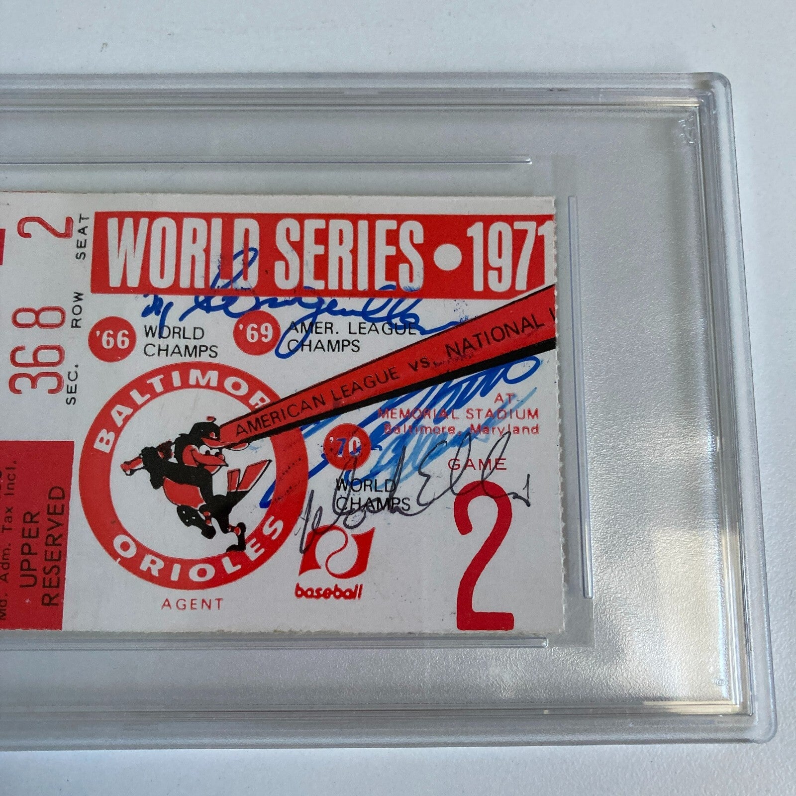 Original ticket stub as issued for Game #2 played at Baltimore which has been signed by Roberto Clemente, Dock Ellis, and Manny Sanguillen. Ticket remains in fine condition. Encapsulated by PSA/DNA.