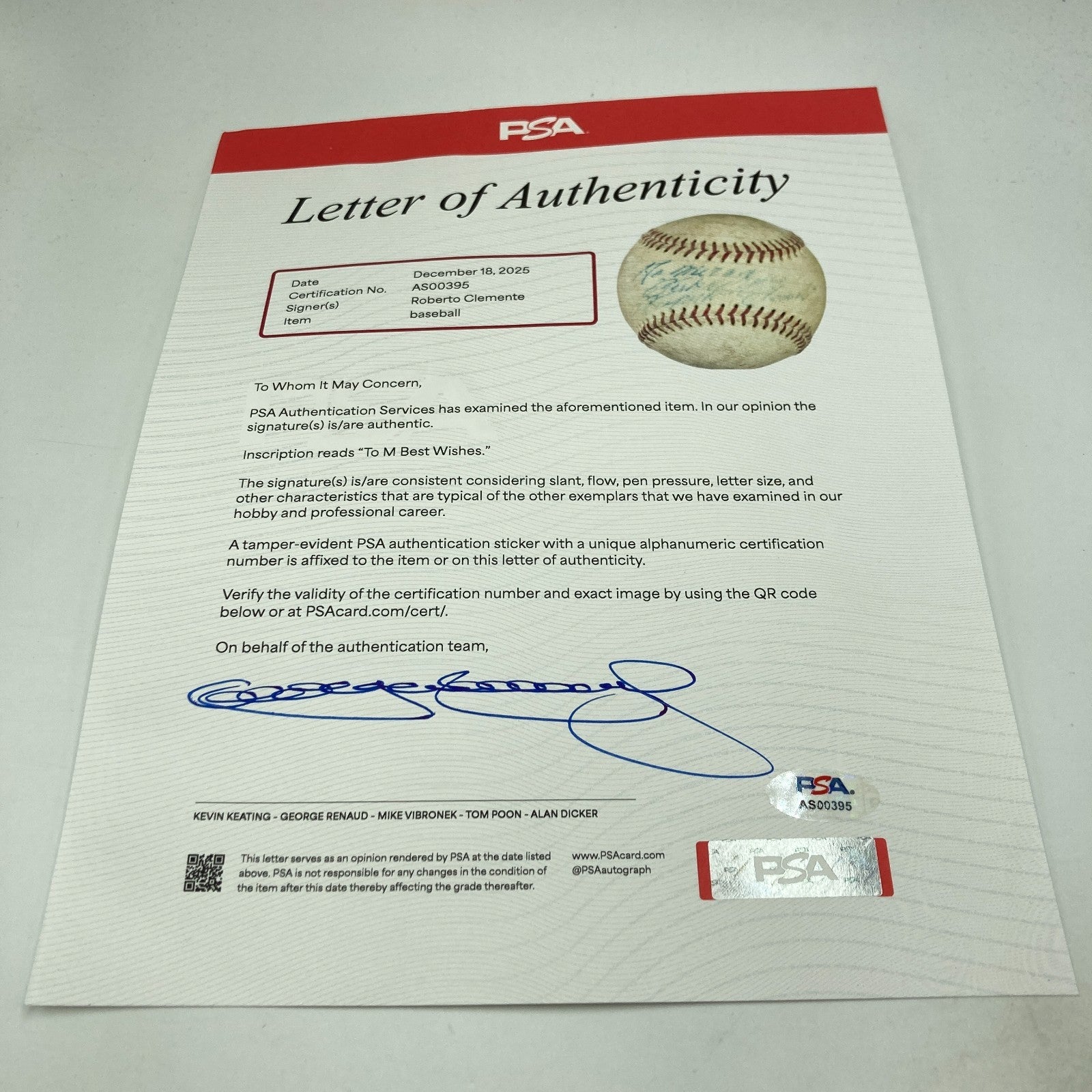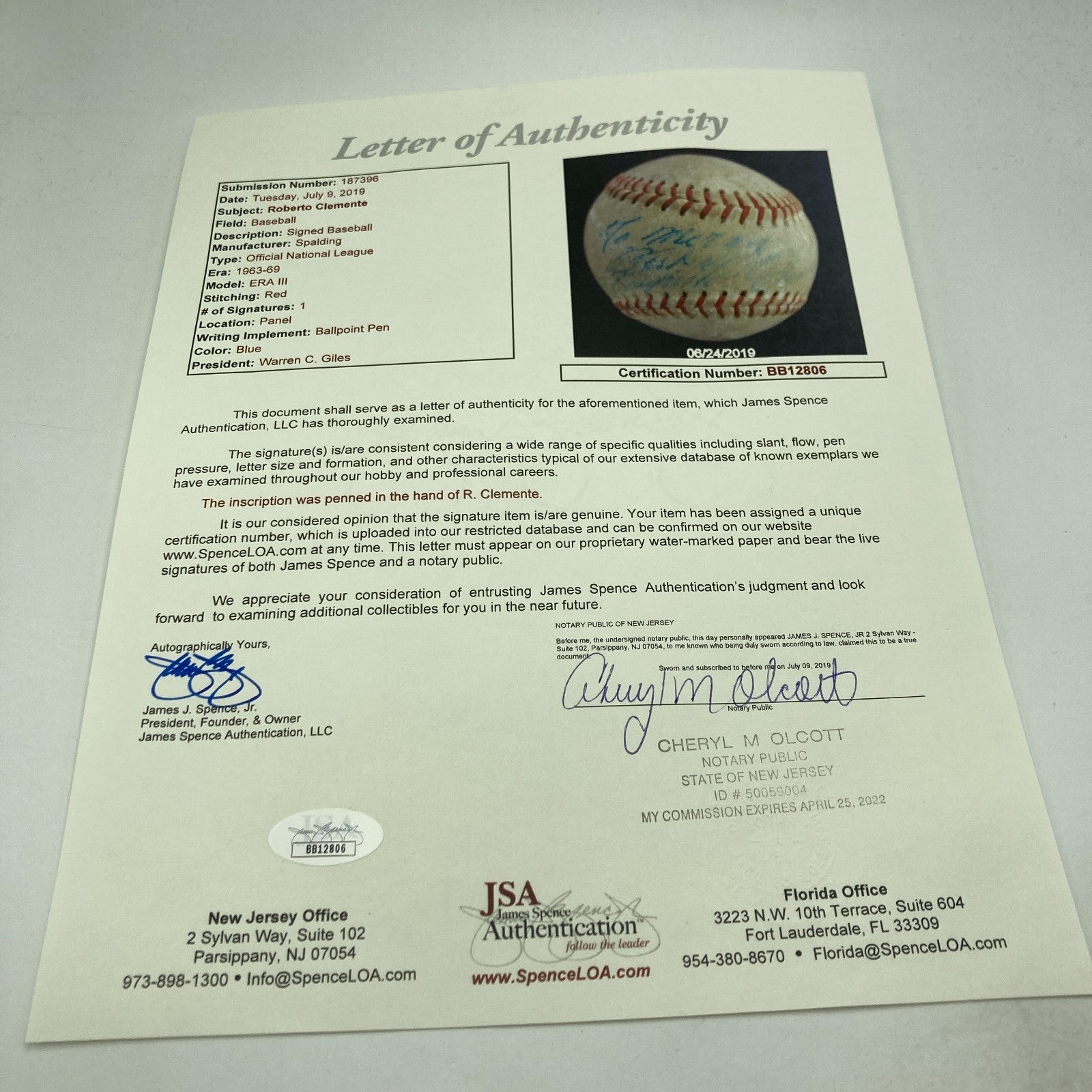 Official National League (Giles) baseball is signed on the sweet spot in the legendary outfielder's distinctive script, "To Murray, Best Wishes, Roberto Clemente", and the apparent game use on the ball suggests it saw action in a Pirates game prior to its encounter with the tragic Hall of Famer. Clemente singles are tough, and particularly those with sweet spot signatures, so this is a particularly appealing target for post-war signed baseball collectors. Full LOA from James Spence Authentication. Full LOA from PSA/DNA. Full LOA from Beckett Authentication Services.