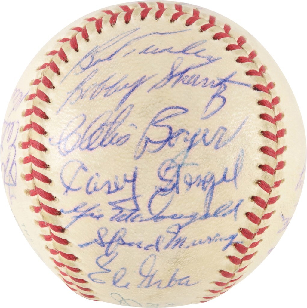 Presented is a wonderful addition to any sports collection - a signed baseball from the American League pennant winning New York Yankees, a team of iconic stars that would more than double the total runs scored by the Pittsburgh Pirates in the Series (55-27) and yet be defeated by Pittsburgh by 4 games to 3. How could that possibly occur? The Yankees took each of their wins by blowouts: 16-3, 10-0, and 12-0. The Pirates, on the other hand, won four close games: 5-4, 3-2, 5-2, and 10-9 in Game 7, on the famous walk-off home run by Hall of Famer Bill Mazeroski in the bottom of Inning 9. (20) signatures: Hall of Famers Mickey Mantle and Yogi Berra on the sweet spot. Also, Roger Maris, Casey Stengel (CH), Clete Boyer, Bobby Shantz, Bob Turley, Bob Cerv, Duke Maas, Bob Richardson, Kent Hadley, Bill Skowron, John Gabler, Ralph Terry, Hector Lopez, Elston Howard, Frank Crosetti (coach), Gil McDougald, Eli Grba, and Spud Murray (a Yankee batting practice pitcher who was a friend of Mantle and Whitey Ford). The ball is an American League Official Baseball (Joe Cronin) that is EX-MT. Legendary signatures from a legendary team. PSA DNA LOA.