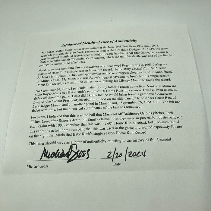 The intrigue regarding the ball has to do with it's unique provenance. The "Mike Gross" to whom the ball is inscribed is the son of the late Milton Gross, who was a sportswriter for the New York Post from 1937 to 1973. In his accompanying one-page typed-signed letter of provenance (image provided), Mike Gross details the ball's history. He begins by explaining that his father basically shadowed Maris during the 1961 season as he pursued history, and during that time the two became close friends. On the night that Maris tied Ruth's home run record at Yankee Stadium he waited patiently for his father to return home after the game, to share in the excitement of the event. However, he was shocked when his father handed him this ball upon his return home. As Gross writes,