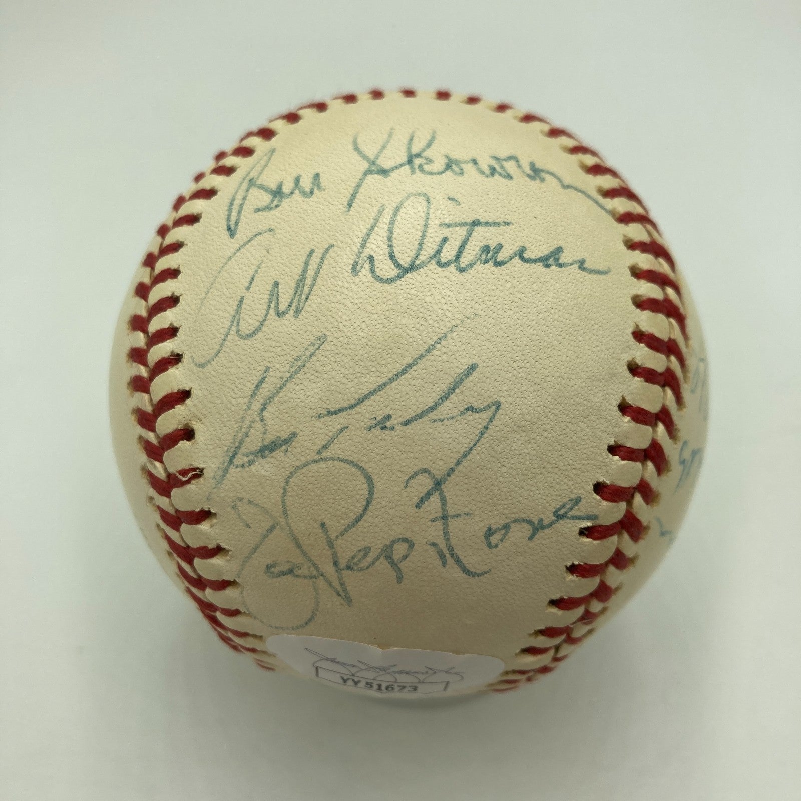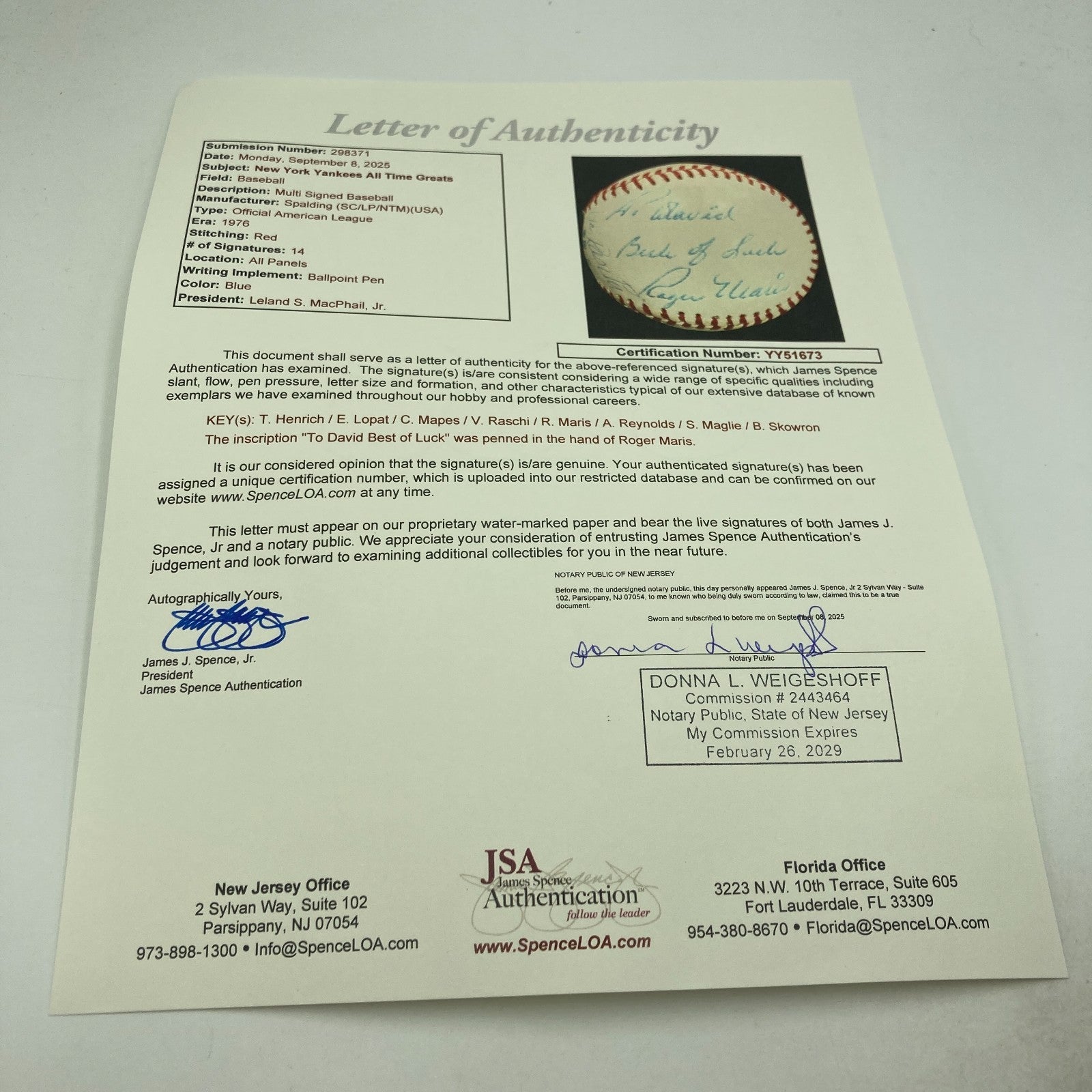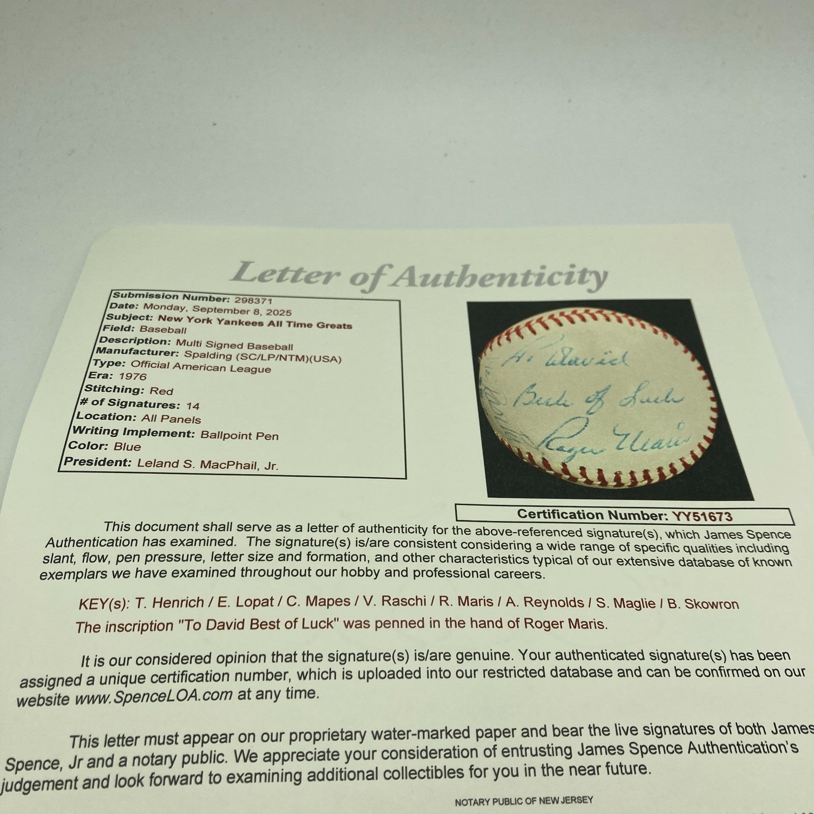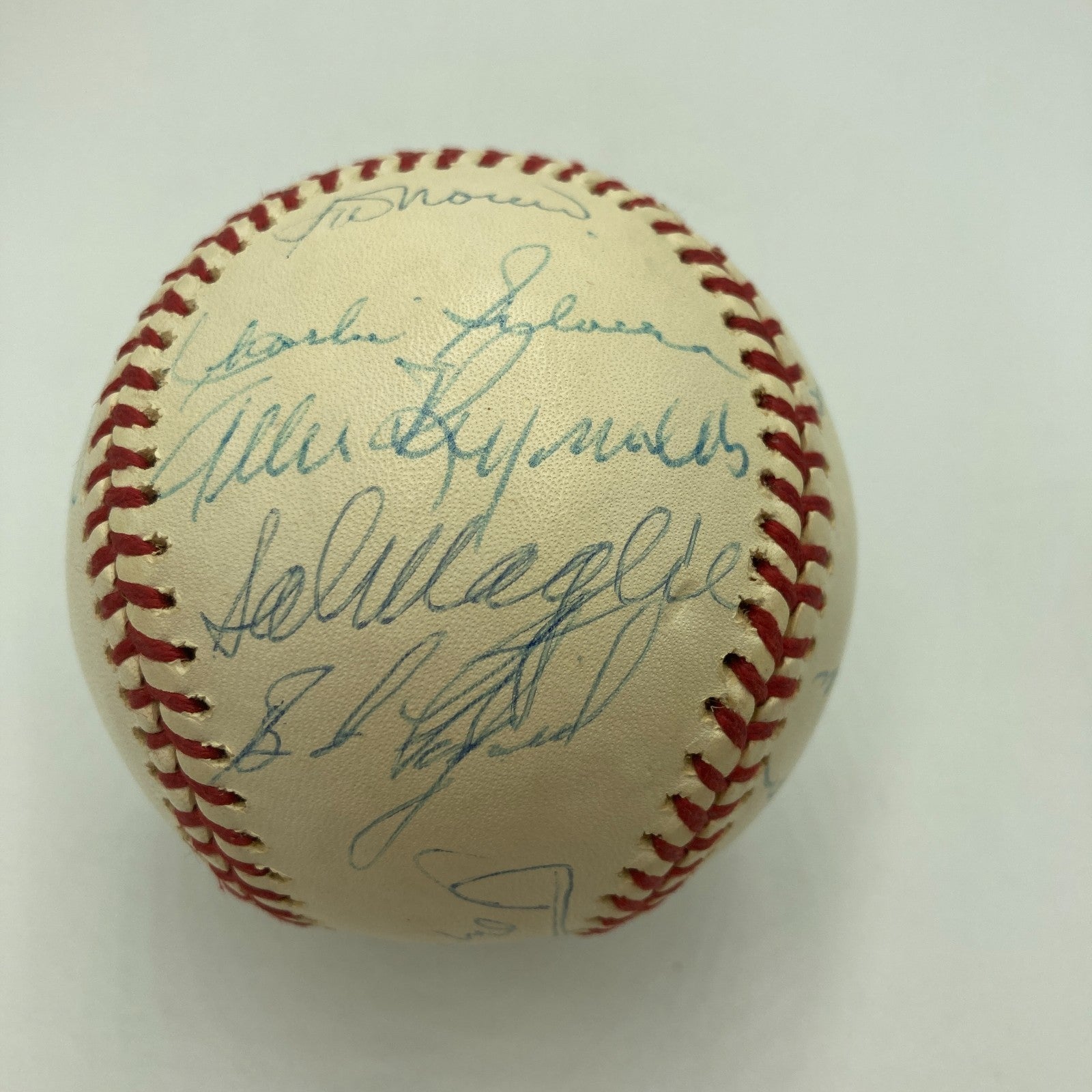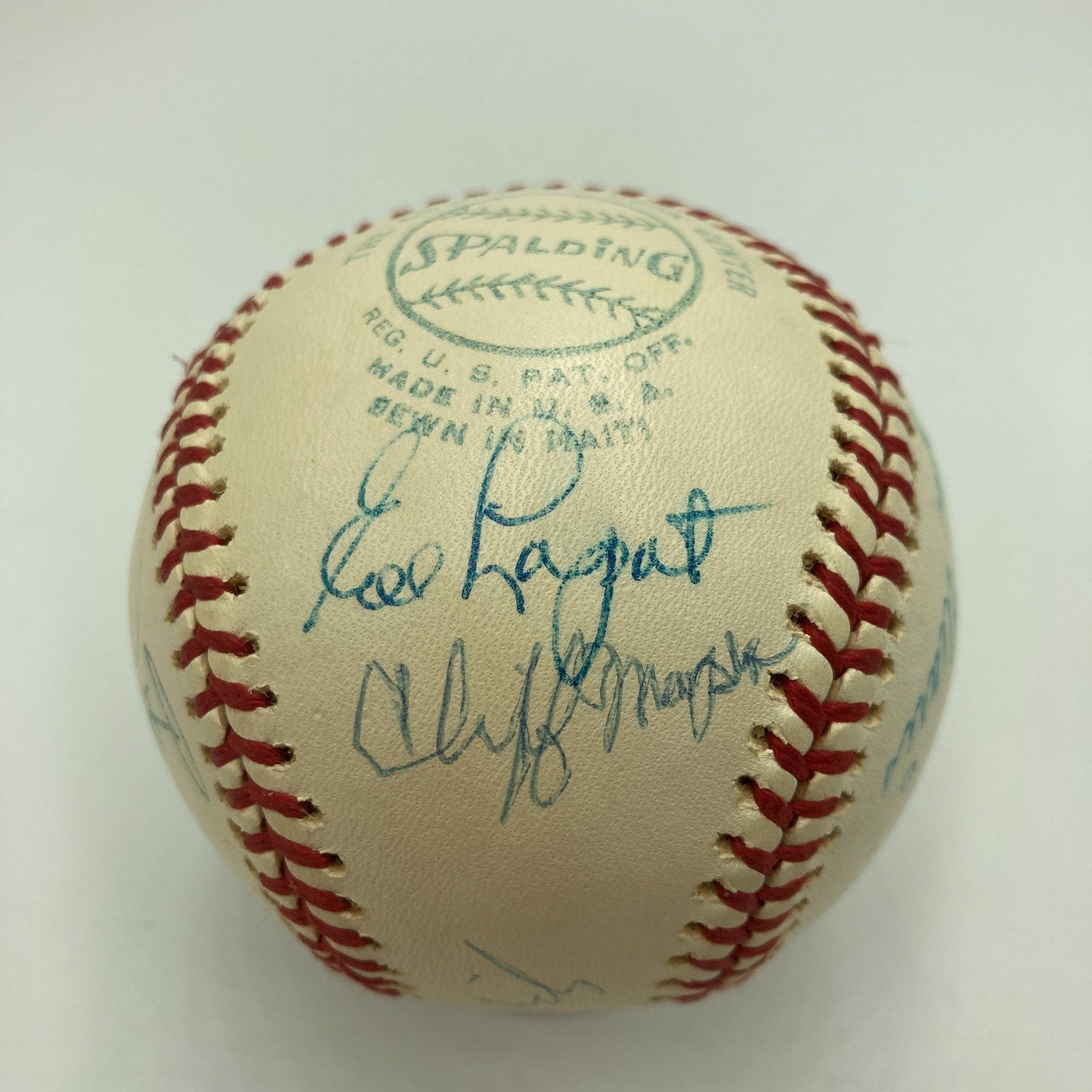 Many great players have donned the New York Yankees pinstripes over the years, including those who have contributed autographs to this legends multi-signed baseball. Chief among the signers is Roger Maris, who passed away in 1985. Given the ball type is an OAL/MacPhail model, and the date of Roger’s departure, this orb was likely period signed at a Yankees reunion, during MacPhail’s 1974-1983 tenure as American League president.