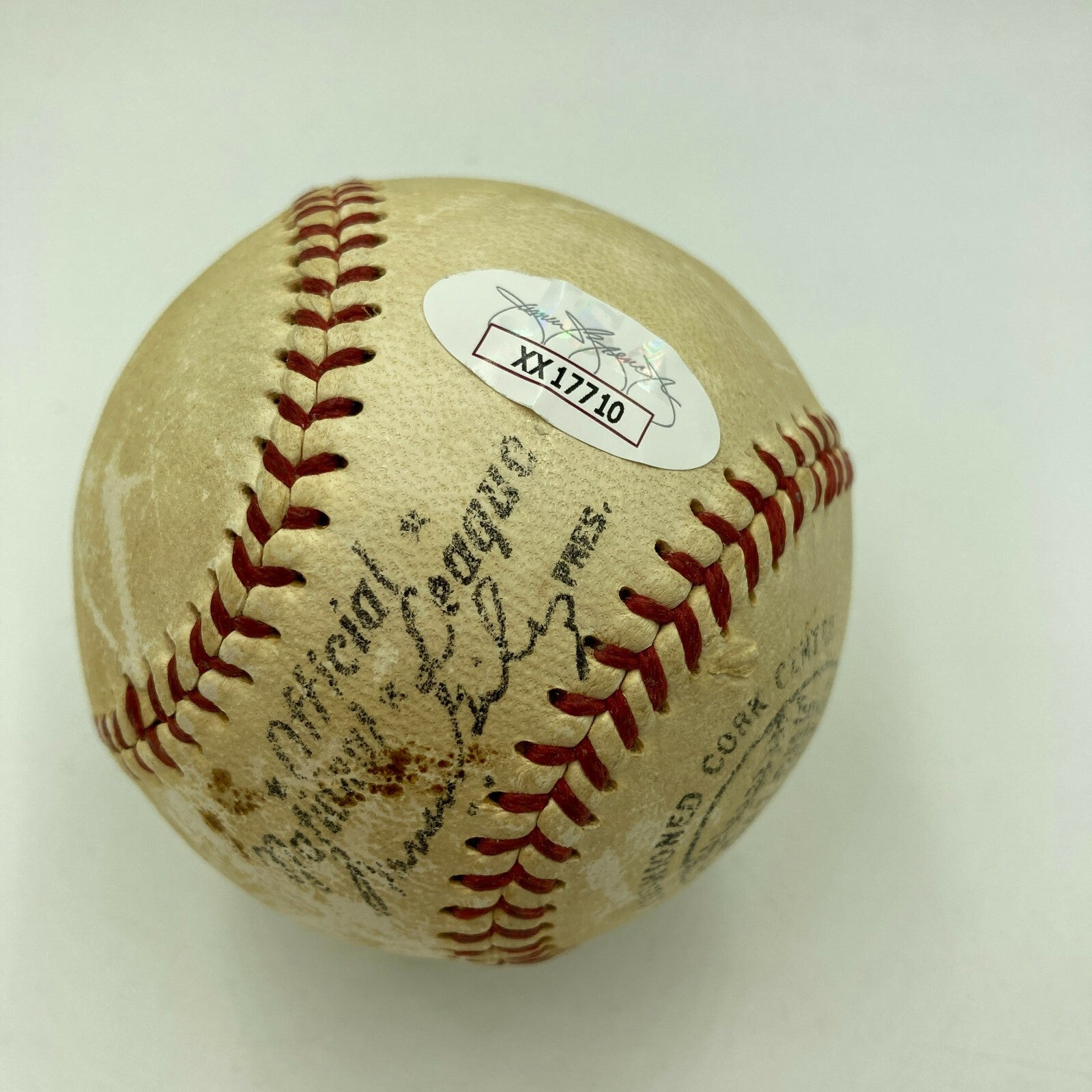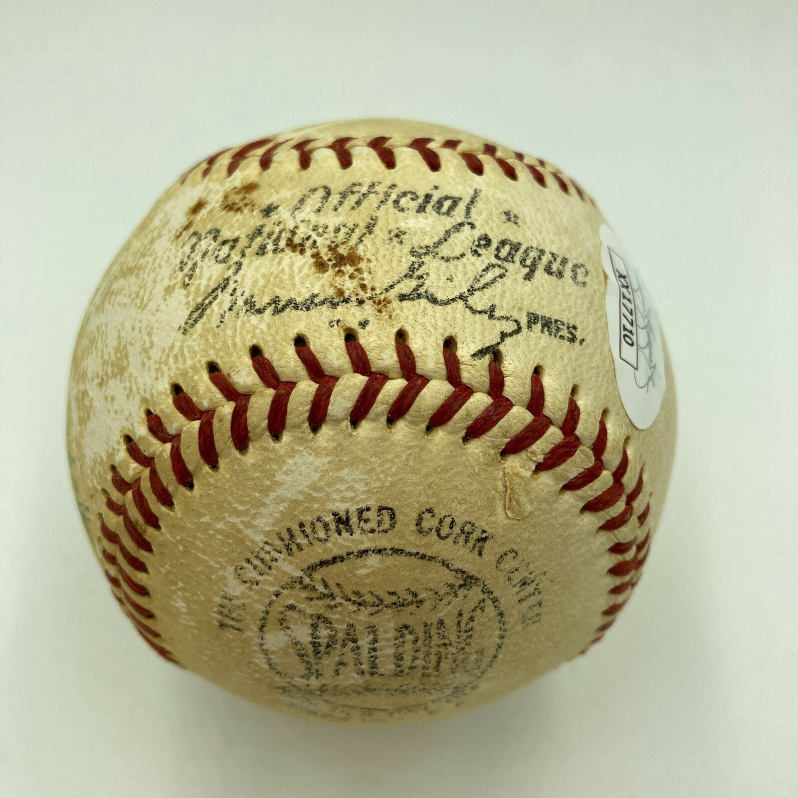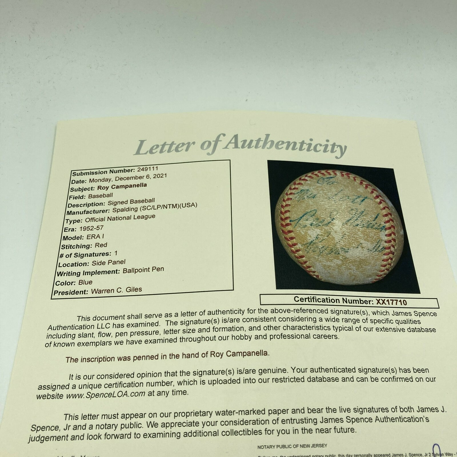 Official National League (Giles) ball signed by Hall of Fame catcher Roy Campanella on a side panel. Campanella has inscribed the ball in blue ink "To Mrs. Lott/Best Wishes Roy Campanella,". Campanella single-signed baseballs dating from his playing career are perhaps the greatest rarity of post-1950 Hall of Famer single-signed balls due to his tragic accident in 1958 that left him paralyzed for life.