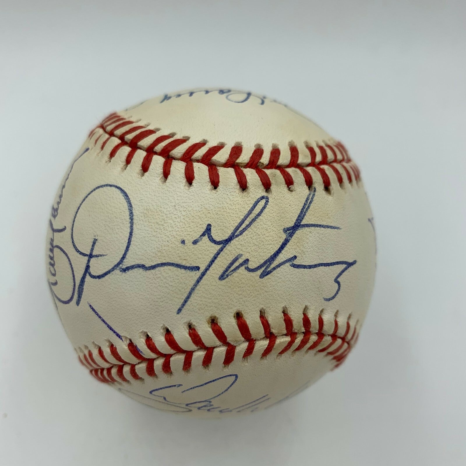 Very high quality signed baseball, offered is a spotless Official American League Baseball. This special ball has no less than 16 signatures of perfect game pitchers. The content is terrific with Roy Halladay, Sandy Koufax, Randy Johnson, Catfish Hunter, David Wells, Jim Bunning, Don Larsen, Matt Cain, Tom Browning, Mark Buehrle, Dennis Martinez, Mike Witt, David Cone, Len Barker, Kenny Rogers and Dallas Braden. The tragic death of Roy Halladay at a very young age sadly makes this a rare signed ball signed as such. One of the most complete Perfect Game balls out there. Full letter PSA DNA COA.