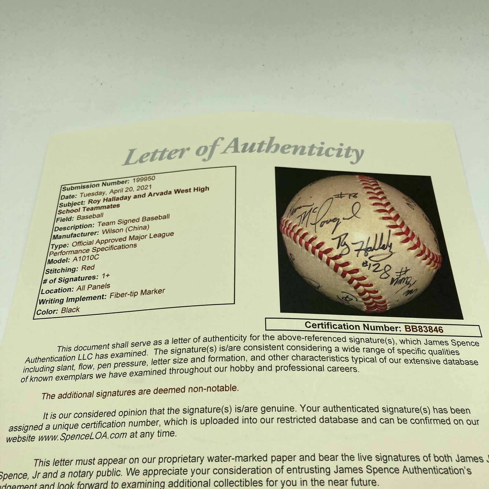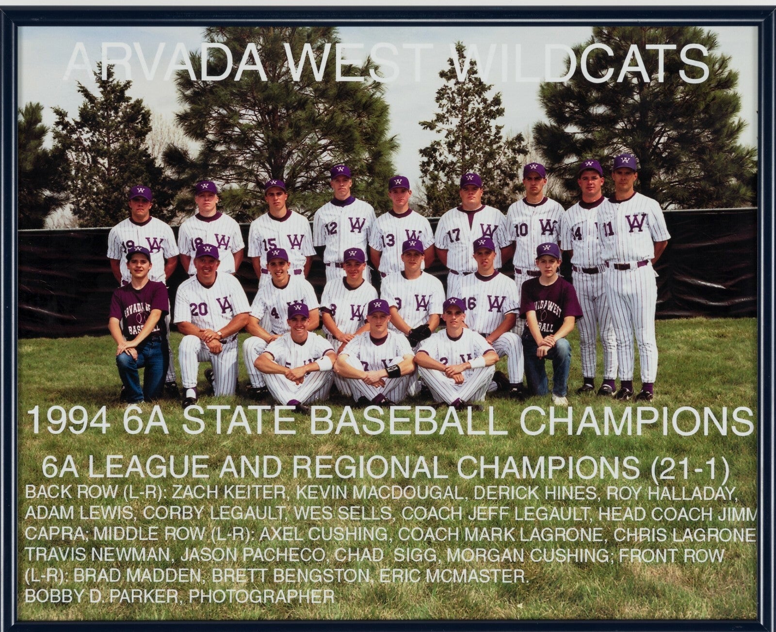 Roy Halladay High School Signed Baseball. Roy Halladay was one of the best pitchers of his generation. He won two Cy Young awards and was named to eight All-Star games. He even pitched the second ever no-hitter in postseason history. Turns out he was a winner as an amateur, too. Offered is a baseball signed by members of the 1994 6A Colorado State Champions Arvada West High School baseball team, which includes the Hall of Famer. His signature is near the sweet spot and displays well. An 11x14" photo of the team is also included. Halladay is No. 12.