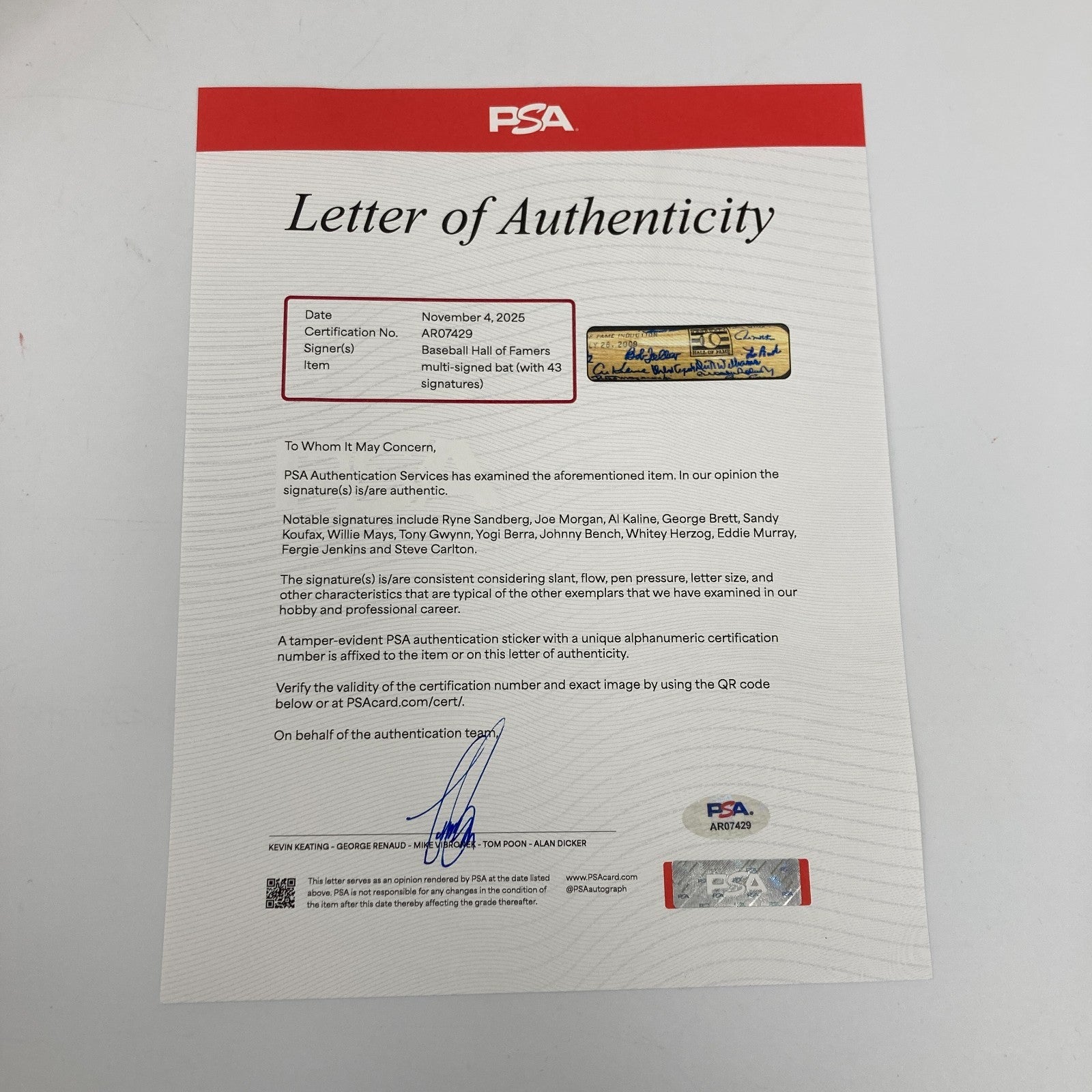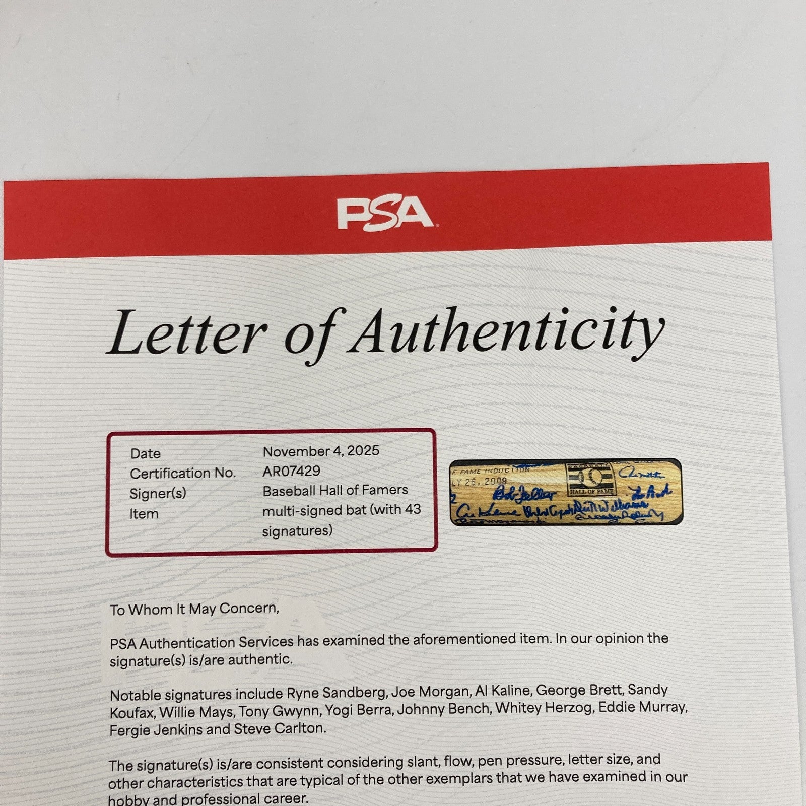 Beautiful 2009 Hall Of Fame Induction Multi Signed Baseball Bat. 43 signatures with: